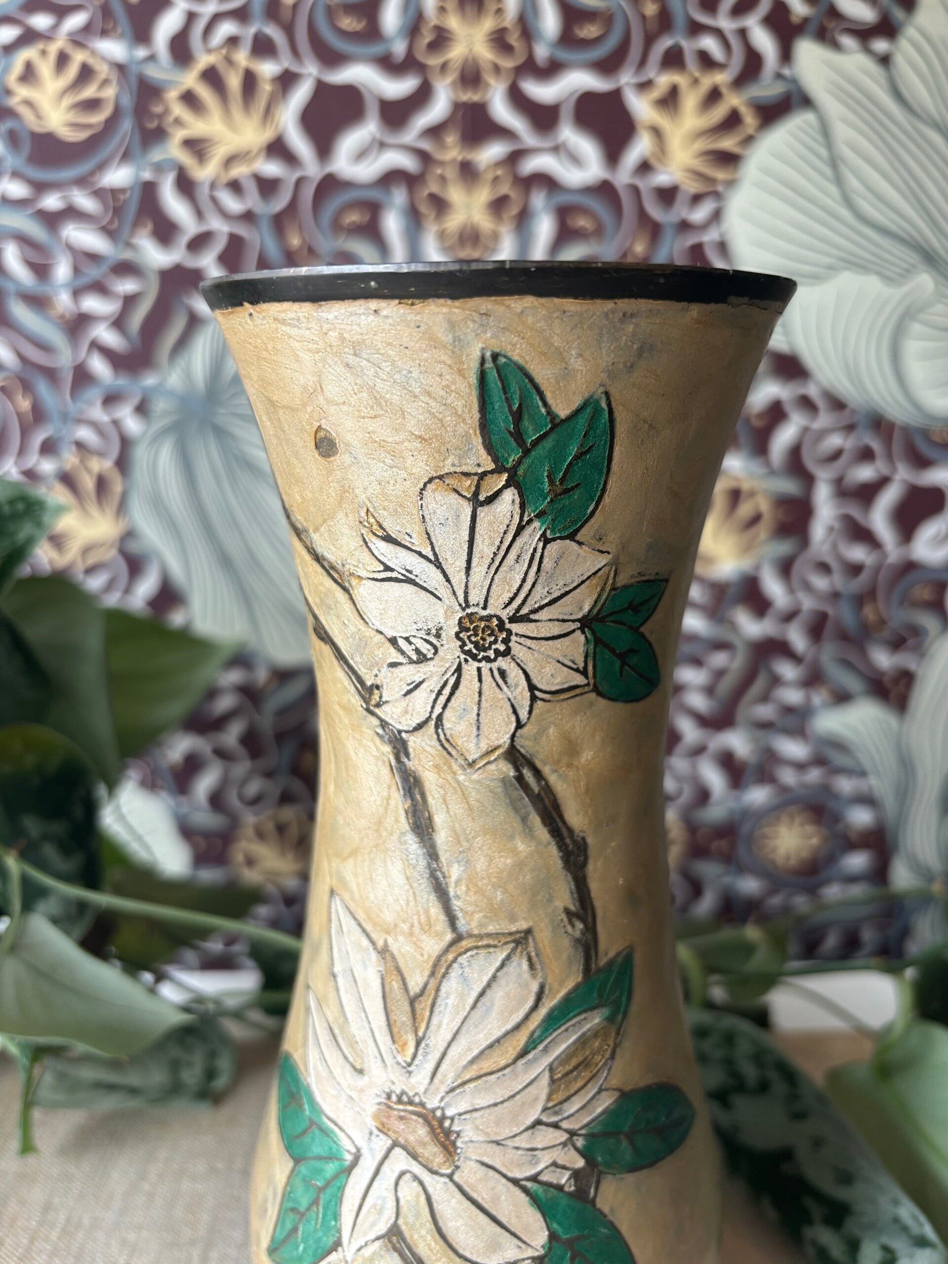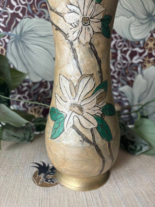 Koperen vaas met emaille beschildering van bloemen. In vintage style, heel mooi met kleurige bloemen er in!