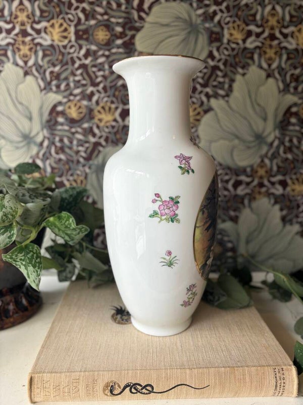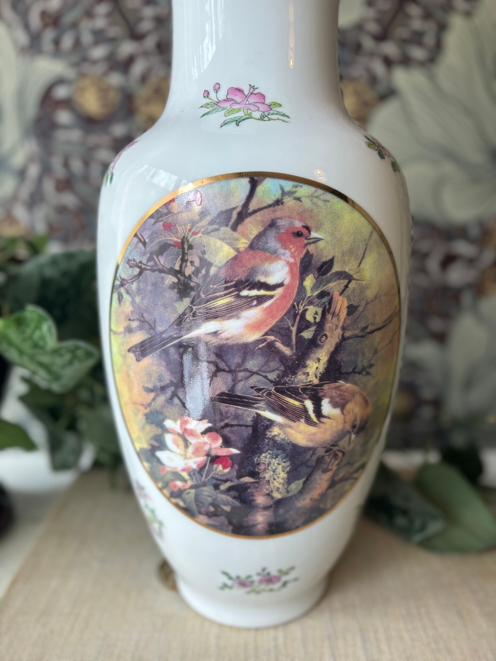 Oosterse style vaas met afbeelding van een vink. Afgewerkt met Oosterse bloemen op de rand. Plaatje zo!