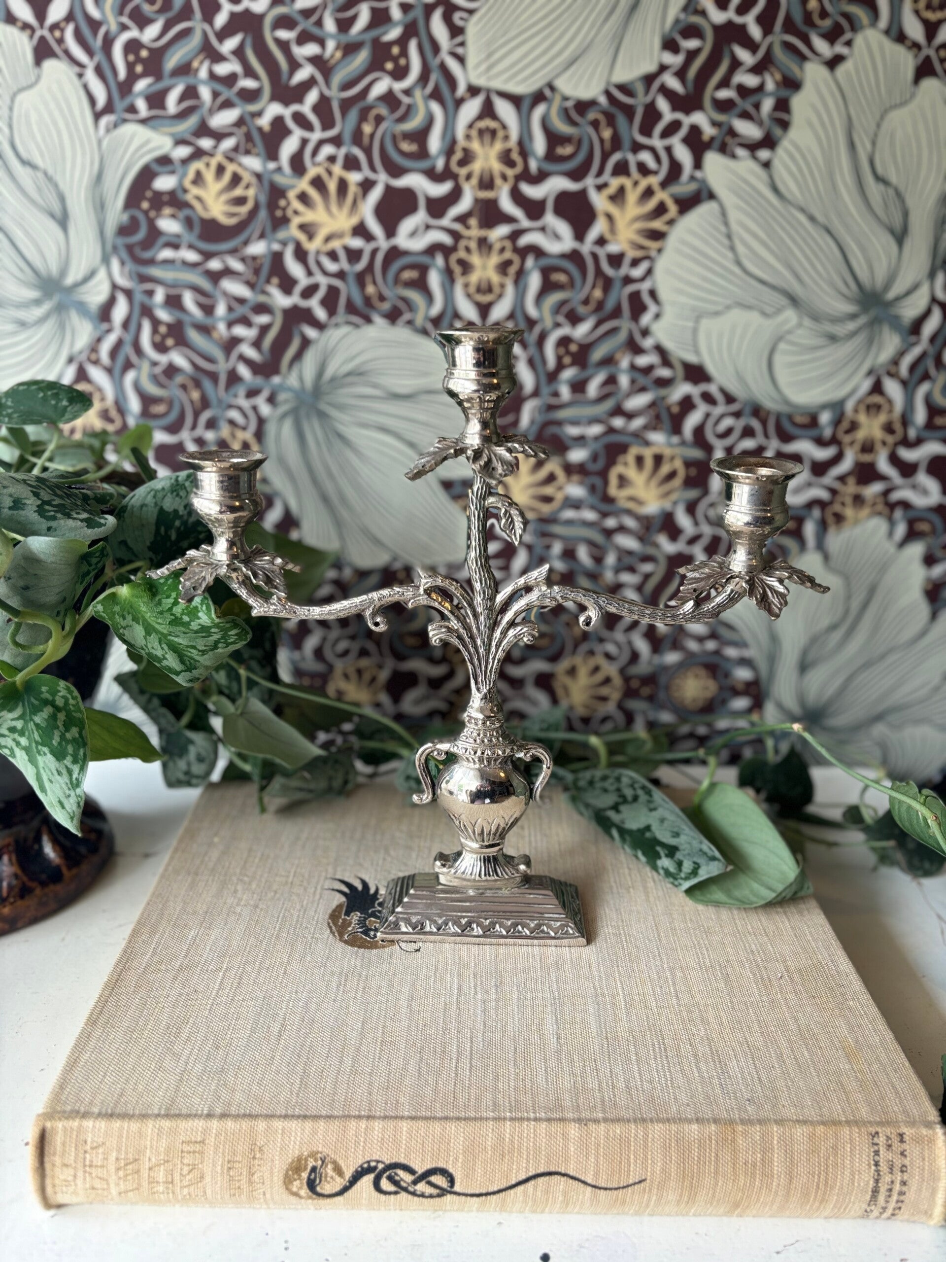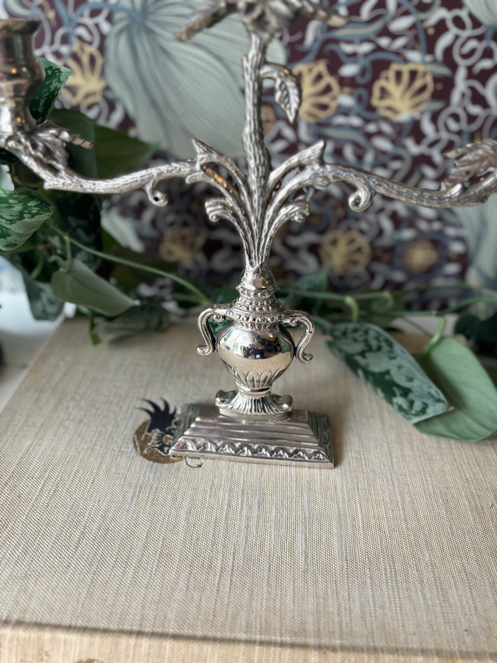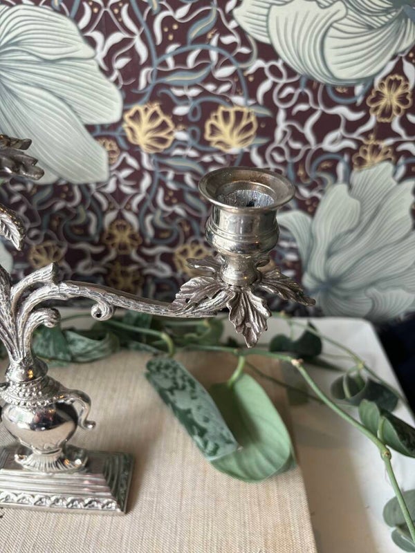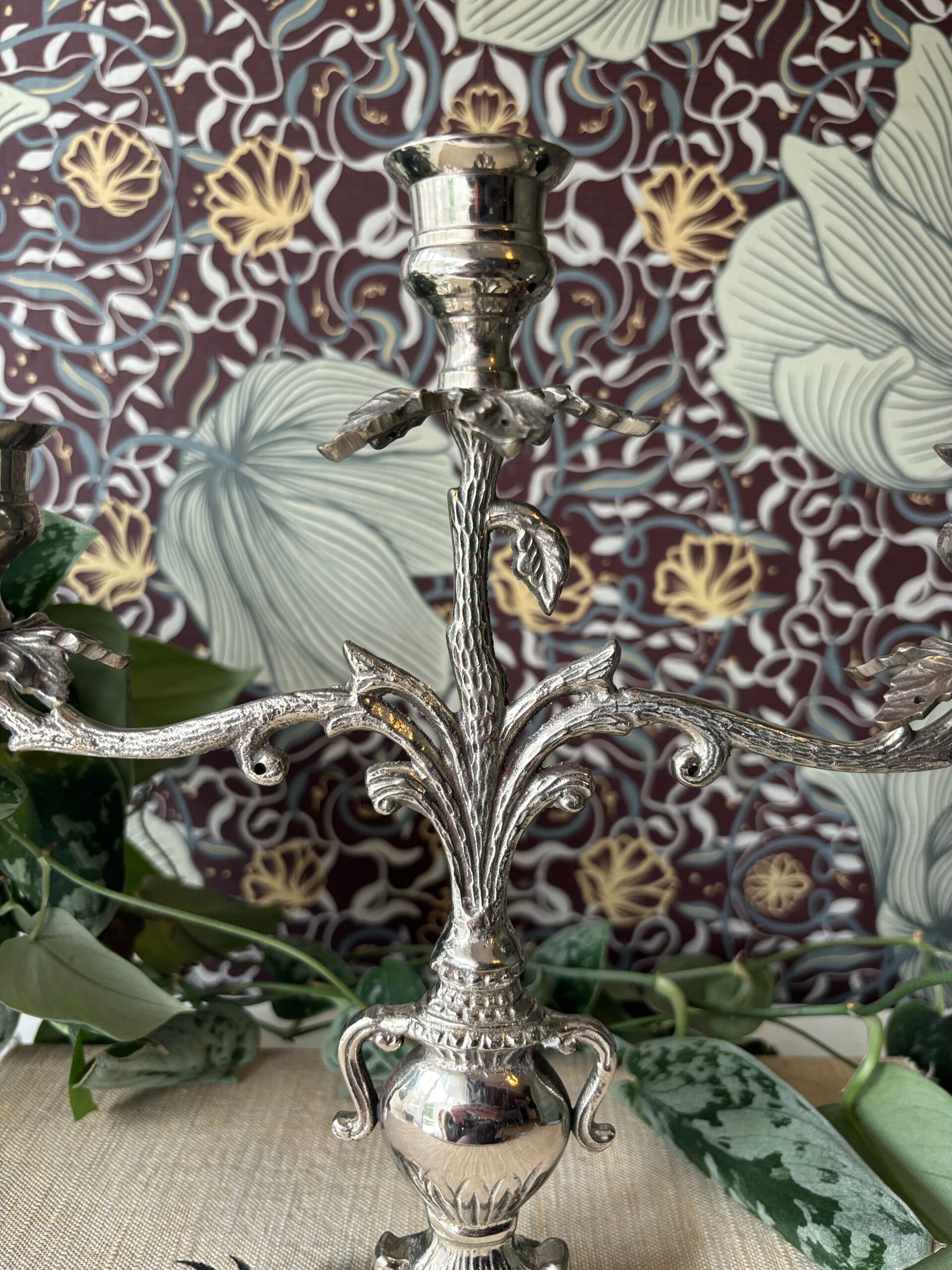 Zilverkleurige kandelaar met plek voor 3 dinerkaarsen. Een key-piece op tafel! De armen beelden prachtige bloemen uit en komen uit een lief vaasje.