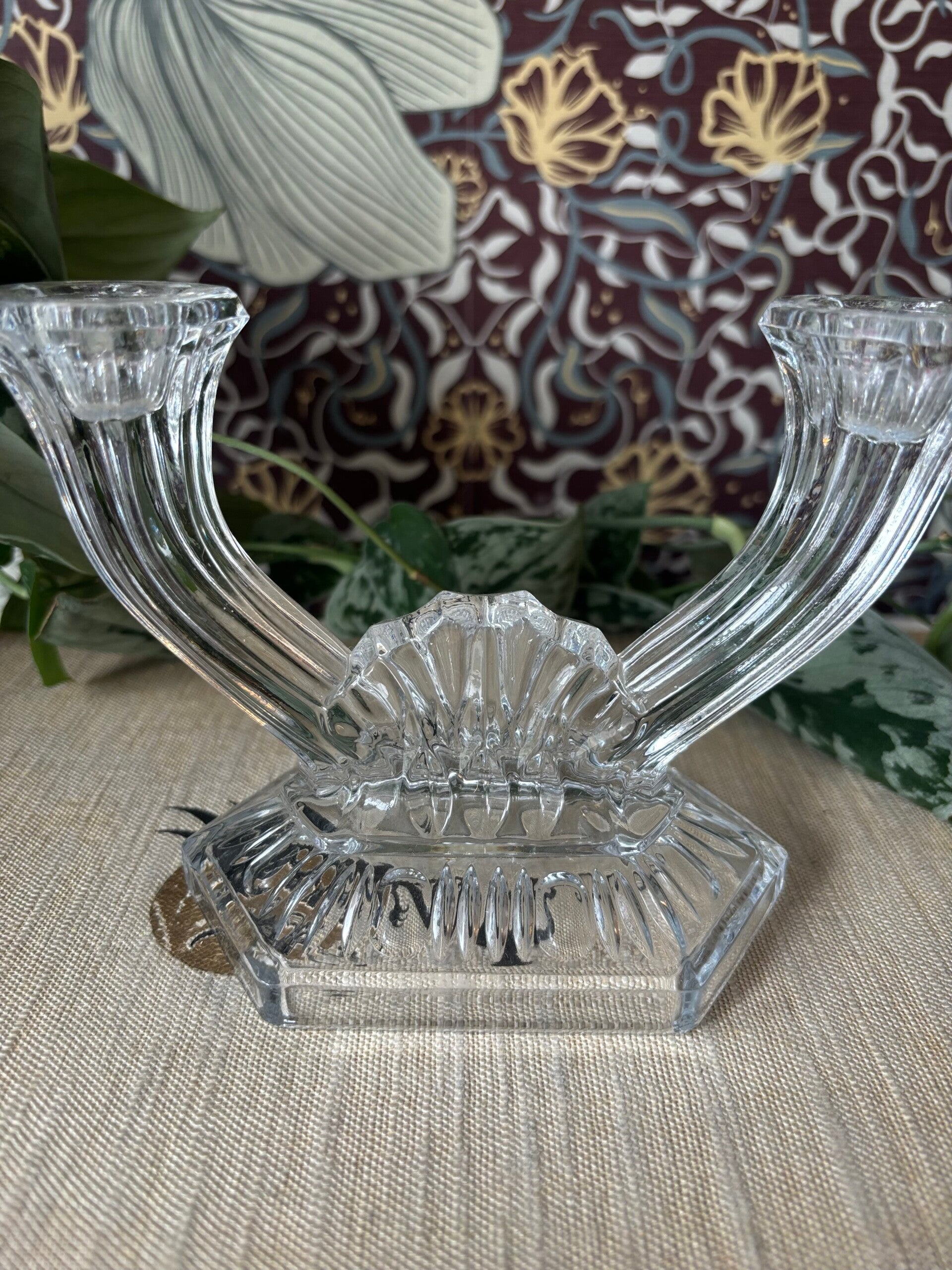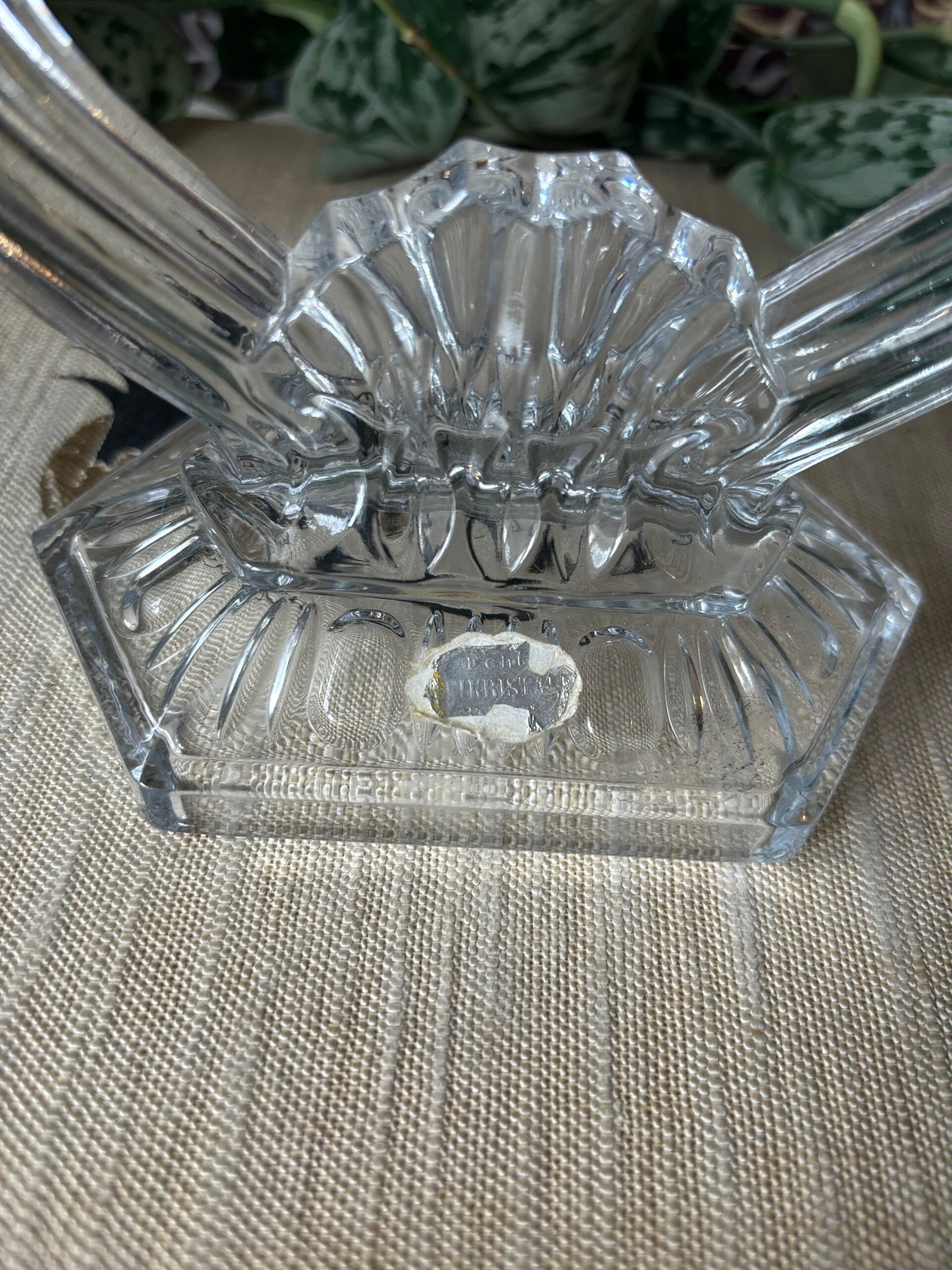 Kristallen kandelaar met plek voor 2 dinerkaarsen. Het kristal is doorzichtig dus perfect te matchen met een kleurige kaars. De echtheidssticker zit er nog op.