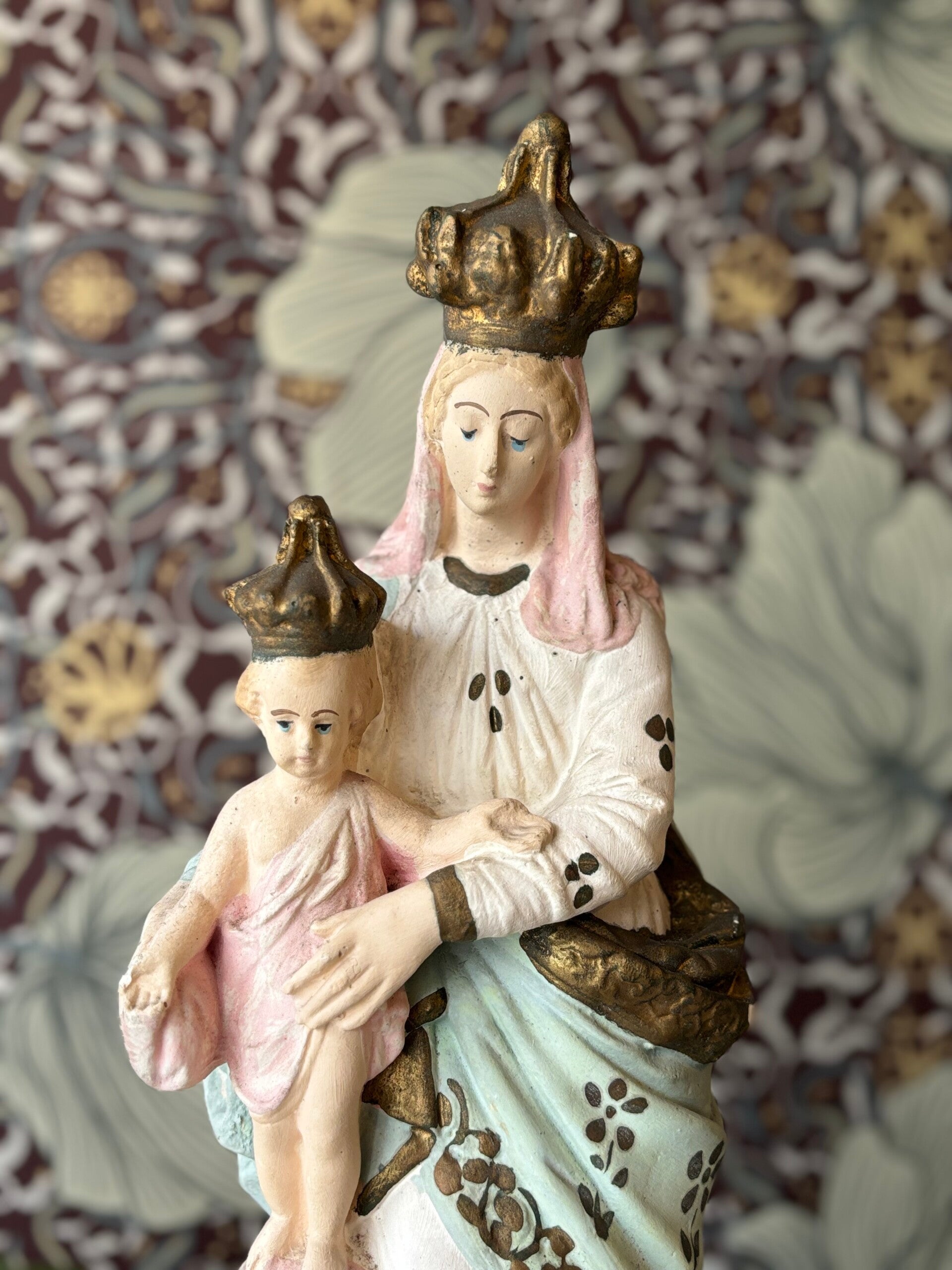 Prachtige vintage gipsen Maria in mooie groene of babyblauwe mantel. De blauwe kleur matched prachtig met het goud en Maria in het groen is weer eens wat anders dan anders! Een echte eyecatcher, ook prachtig als stel.