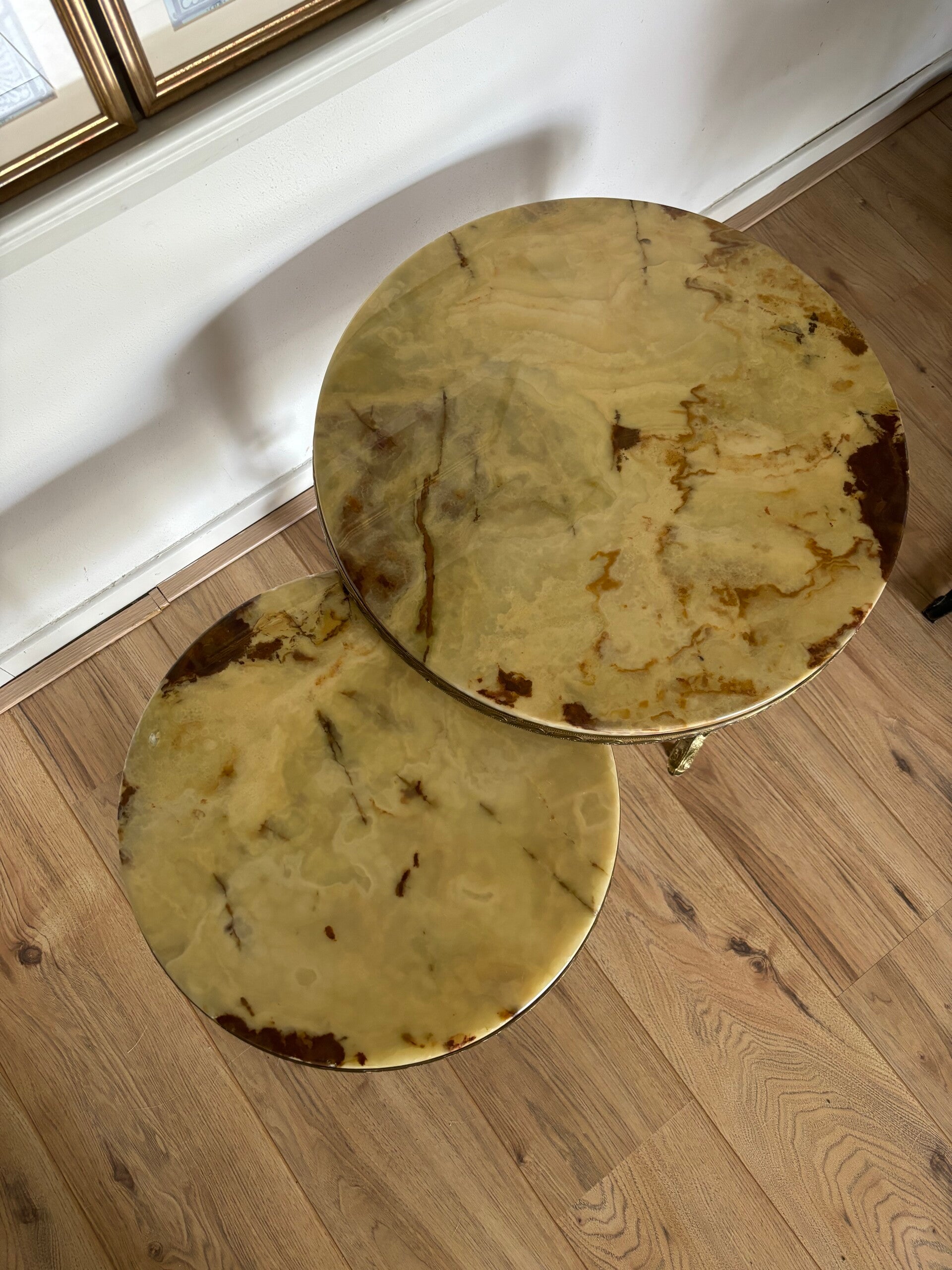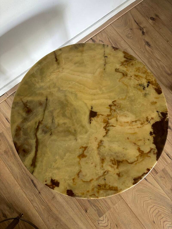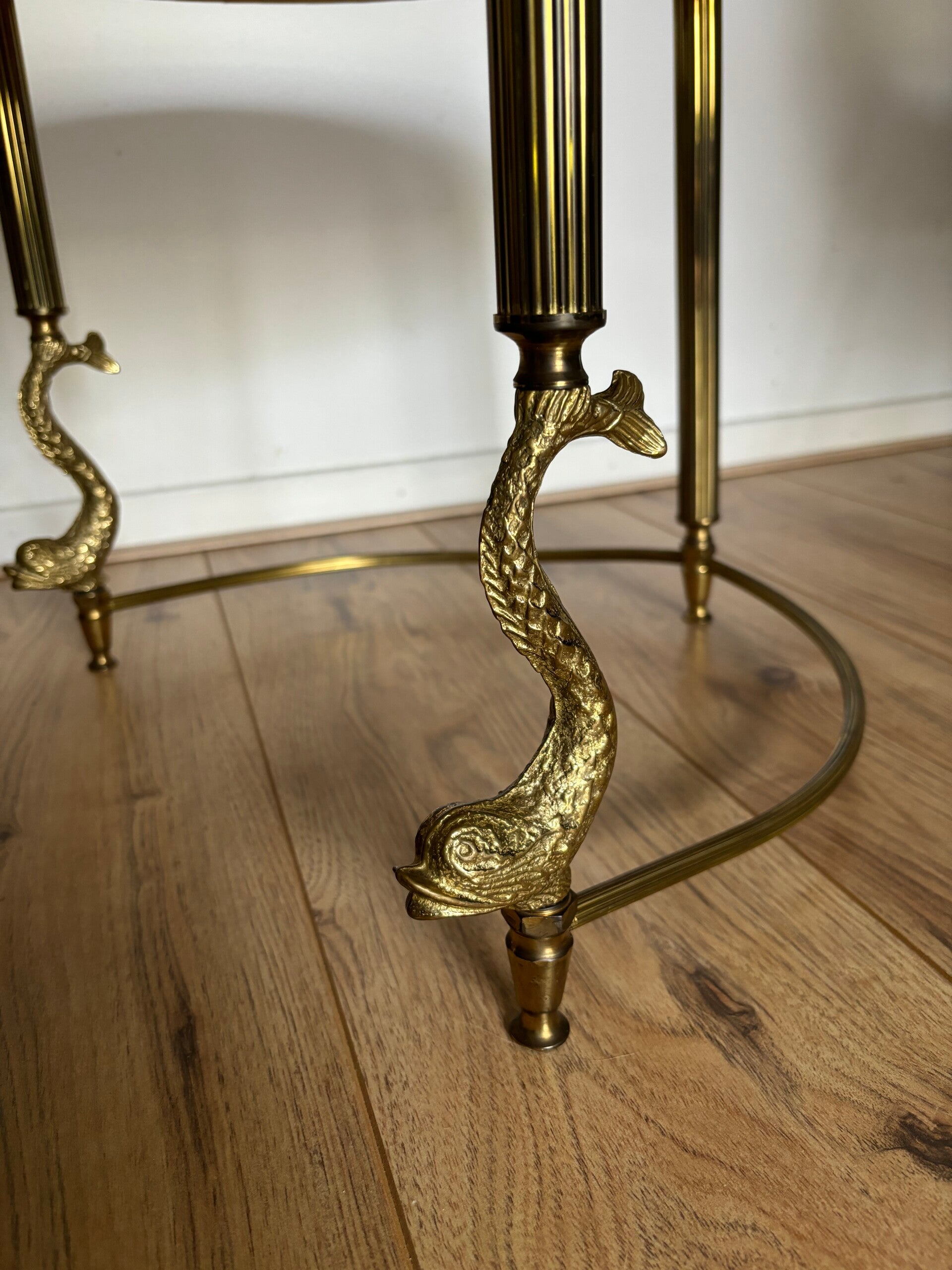 Prachtige salontafeltjes met marmeren blad. De messing poten hebben mooie vissen aan de onderkant. Helemaal art nouveau stijl. Ze zijn los geprijsd en kunnen enkel worden opgehaald. Kies daarom voor optie 'ophalen' of 'opsparen'. Het kleine tafeltje heeft vintage oneffenheden in het blad.