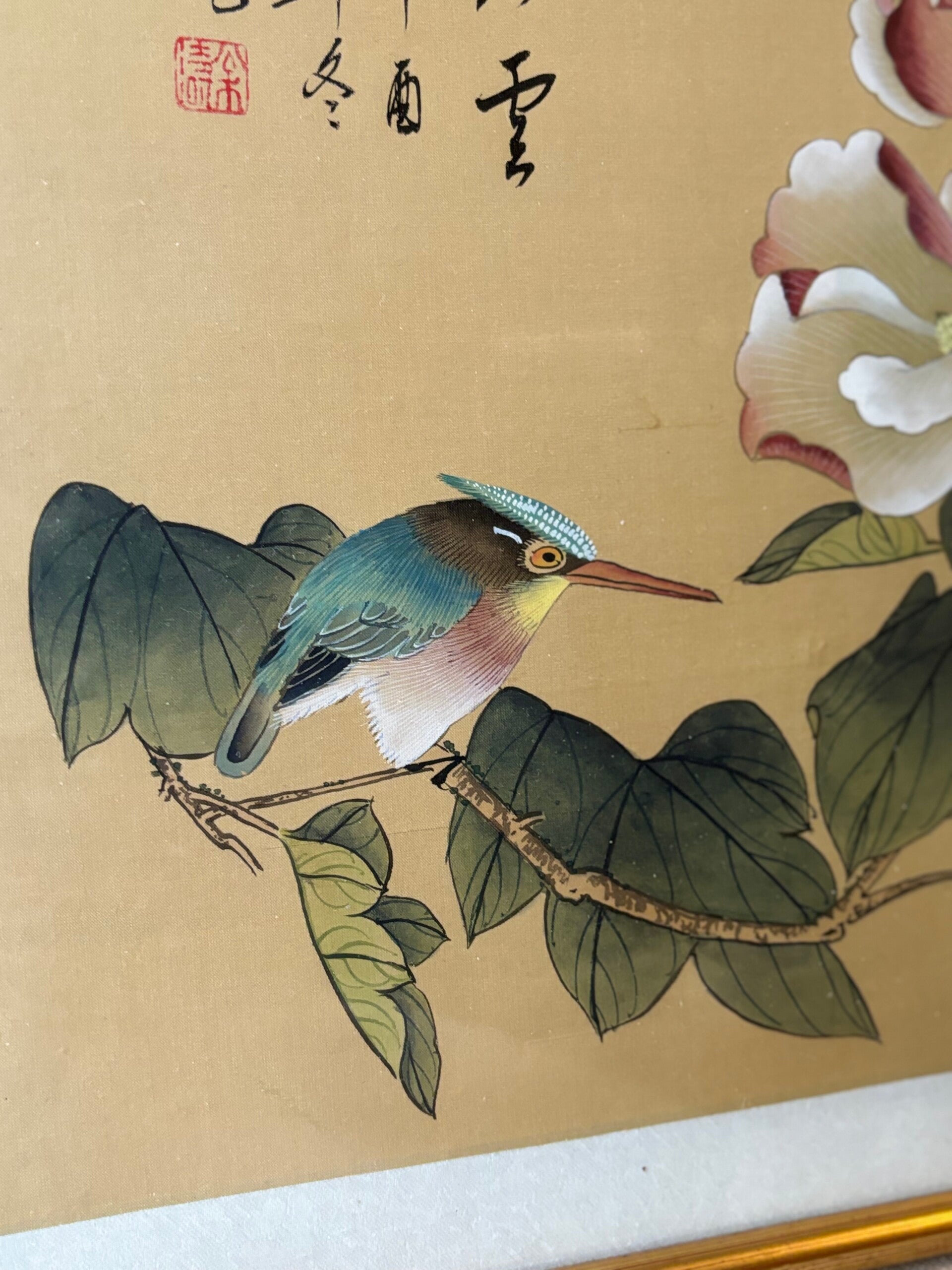 Prachtig Oosters kader met bloemen en ijsvogel geschilderd op doek . Wederom een prachtig kunstwerkje! Gezet in bijpassende gouden lijst.