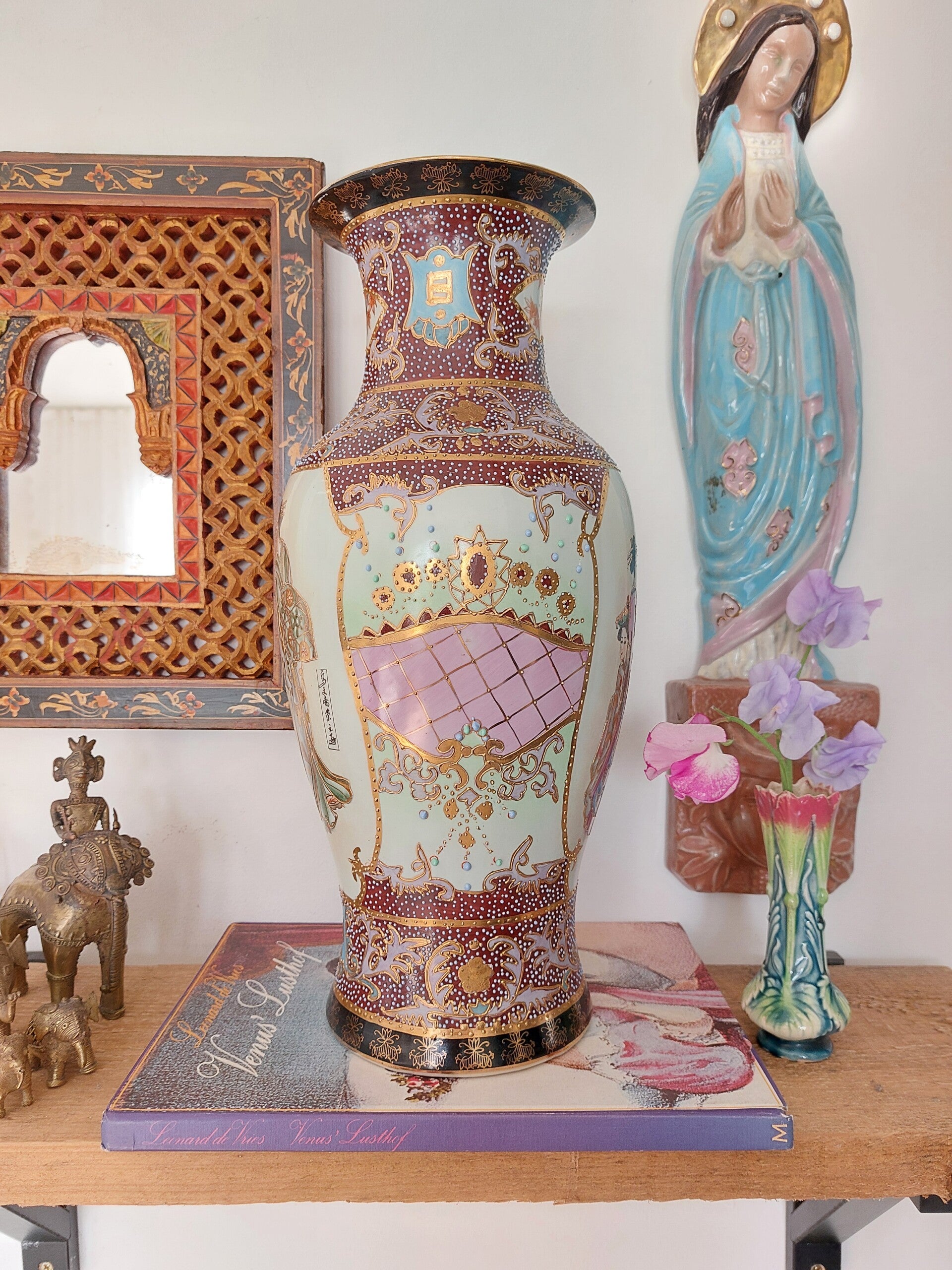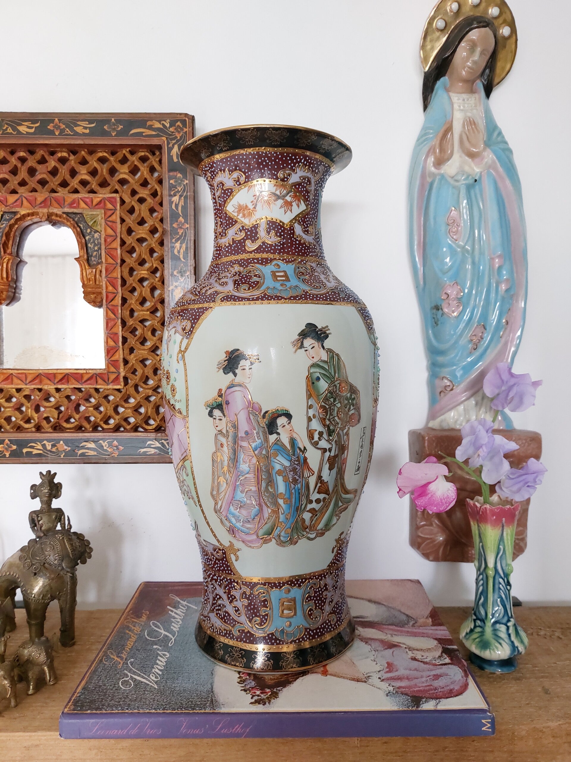 Prachtige grote Japanse Satsuma Geisha vaas. Zoals we van Satsuma gewend zijn prachtig gedecoreerd met de koperfiligraan techniek. De bolletjes verf worden handmatig aangebracht. Prachtig kleurenpalet. Gesigneerd aan de onderkant en op de vaas.