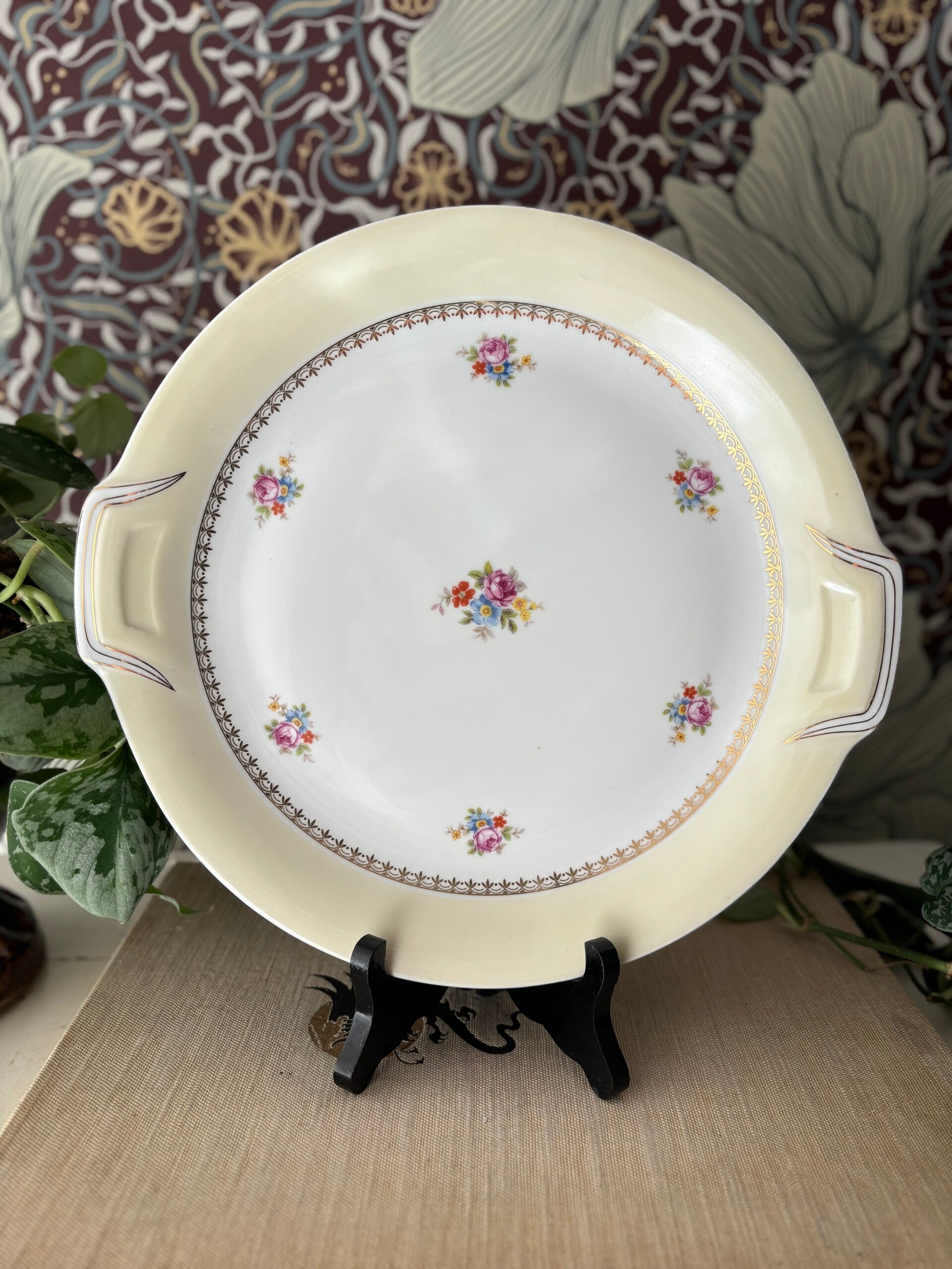 Prachtige serveerset van Limoges. Het authentieke bloemenpatroon is terug te vinden op de 3 borden en grote schaal. Afgewerkt met gouden rand. De set bestaat uit een grote schaal, een groot bord, een taartschaal en een schaal op klein pootje.