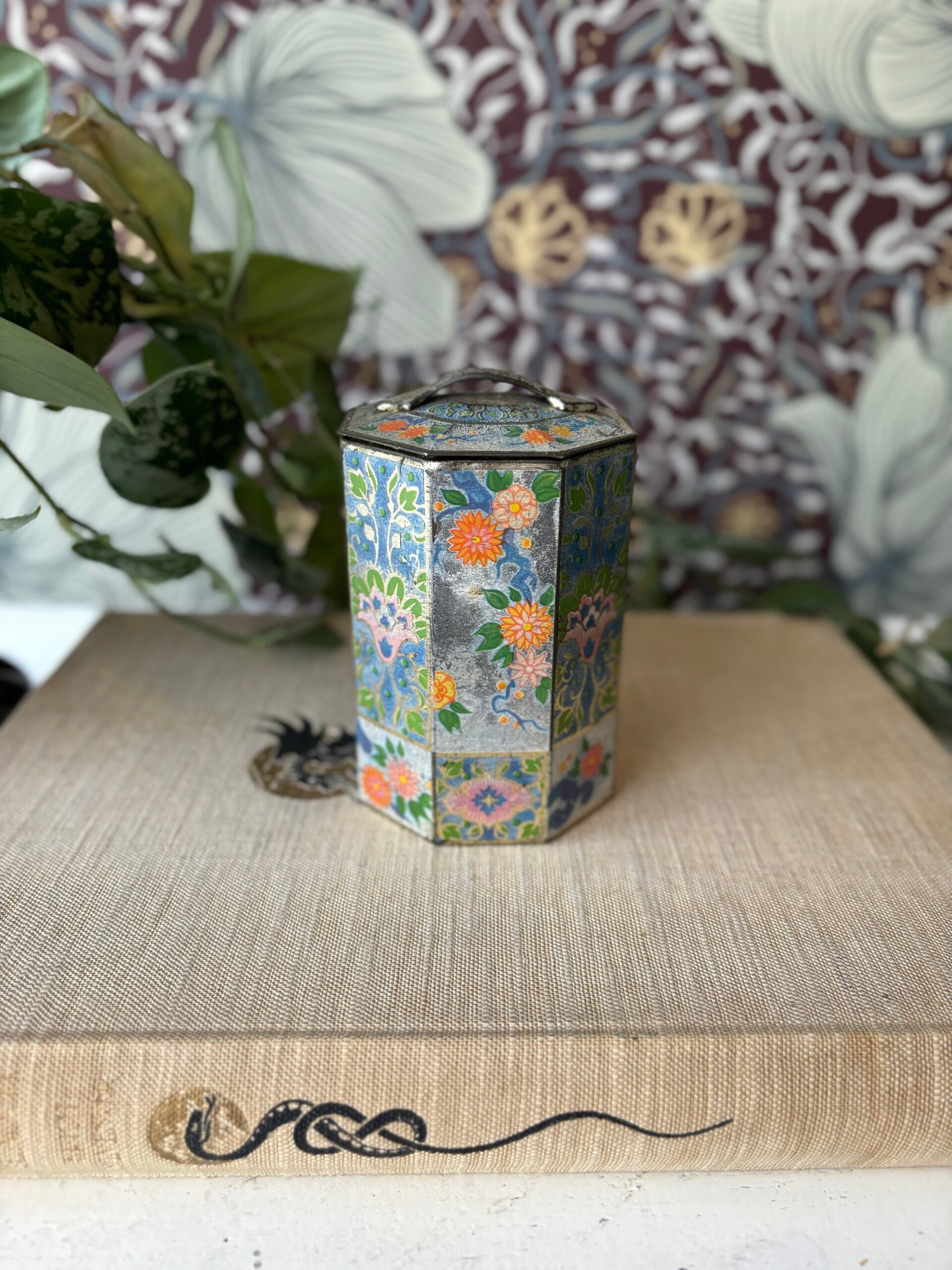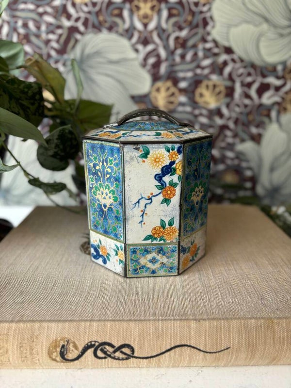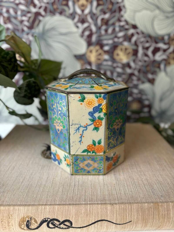 Oude set 8-hoekige theeblikken versierd met Japanse bloesem. Echt oud zijn ze, maar het verweerde maakt ze juist prachtig! De twee grote zijn hetzelfde maar verschillen in vintage kleur, de kleinere heeft een ander patroon in dezelfde bijpassende stijl. Prijs is setprijs.