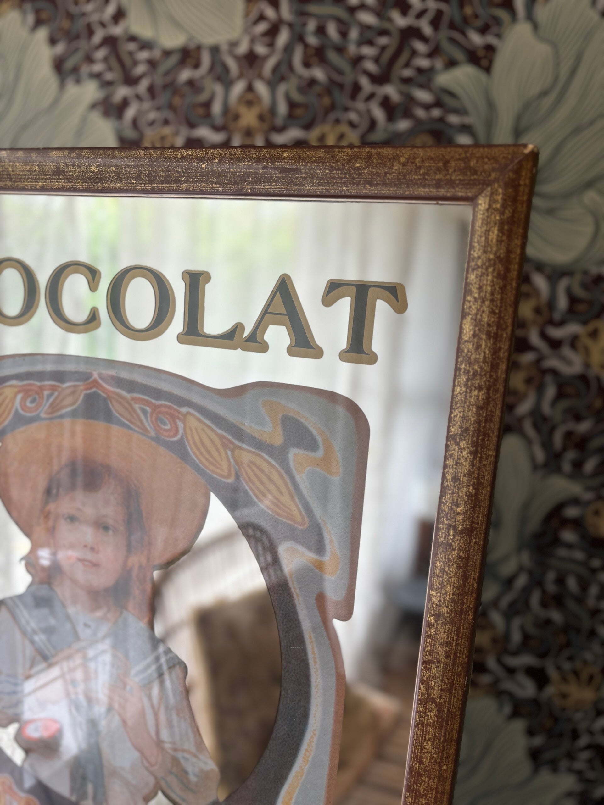 Oude advertentie spiegel van Chocolade fabrikant Van Houten uit de 19e eeuw. Wat een mooie spiegel, met meisje afgebeeld in Art Nouveau stijl. Te leuk voor in de keuken aan de muur! De hoeken hebben enkele oneffenheden te wijten aan de tand des tijds.