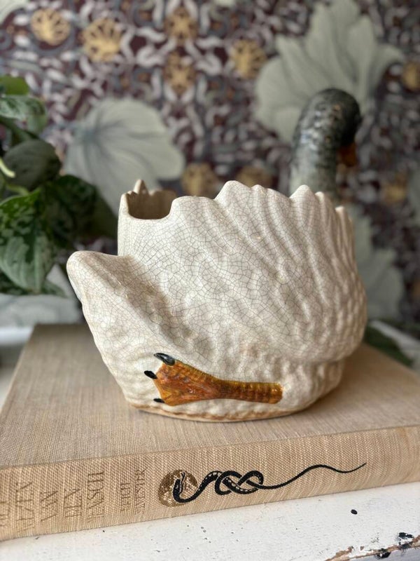 Kekke bloempot in de vorm van een eend. Op zijn ruggetje plek voor een plantje. Aan de binnenkant een kleine chip en aan de buitenkant een vintage oneffenheid, meegenomen in de prijs.