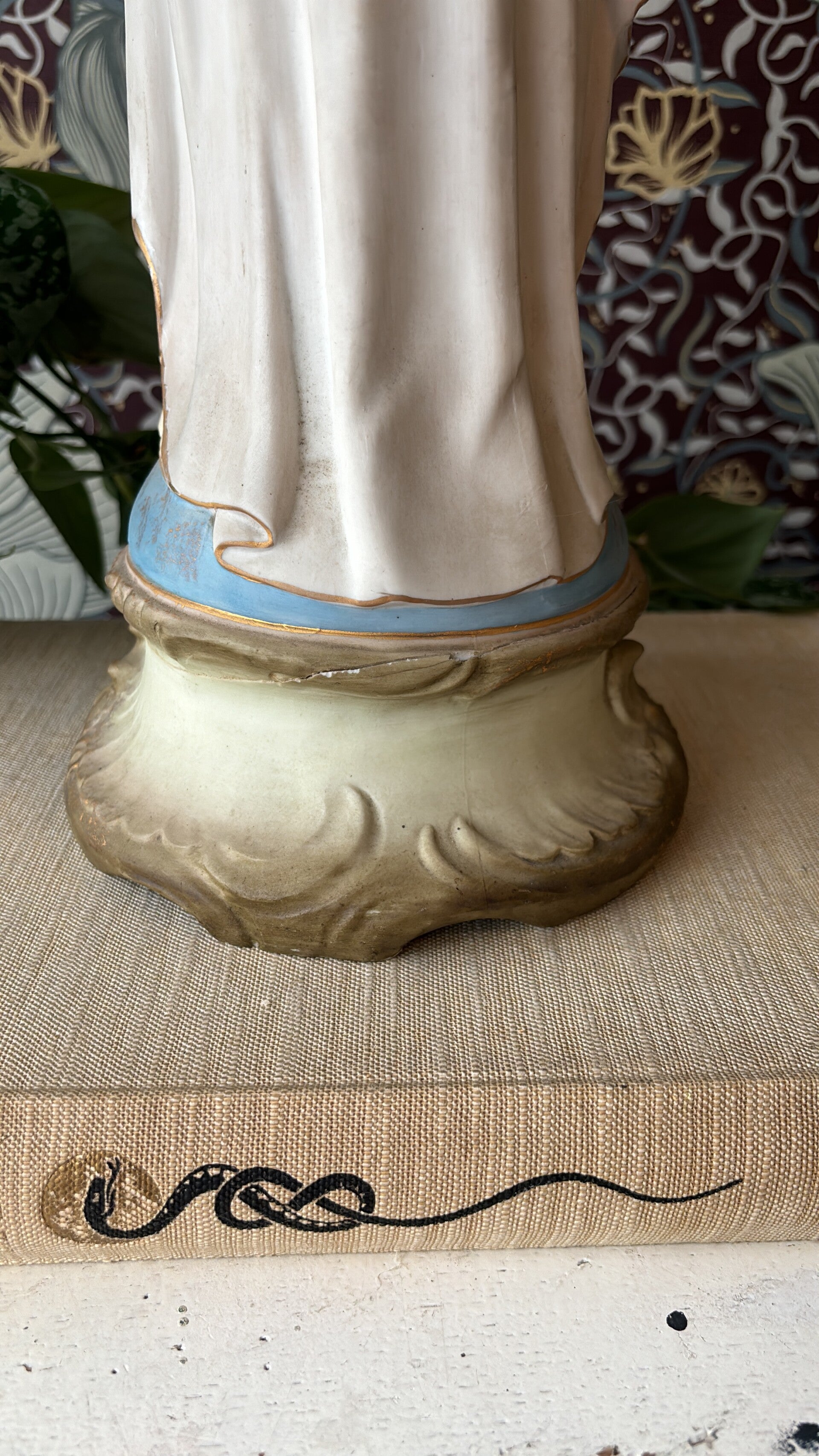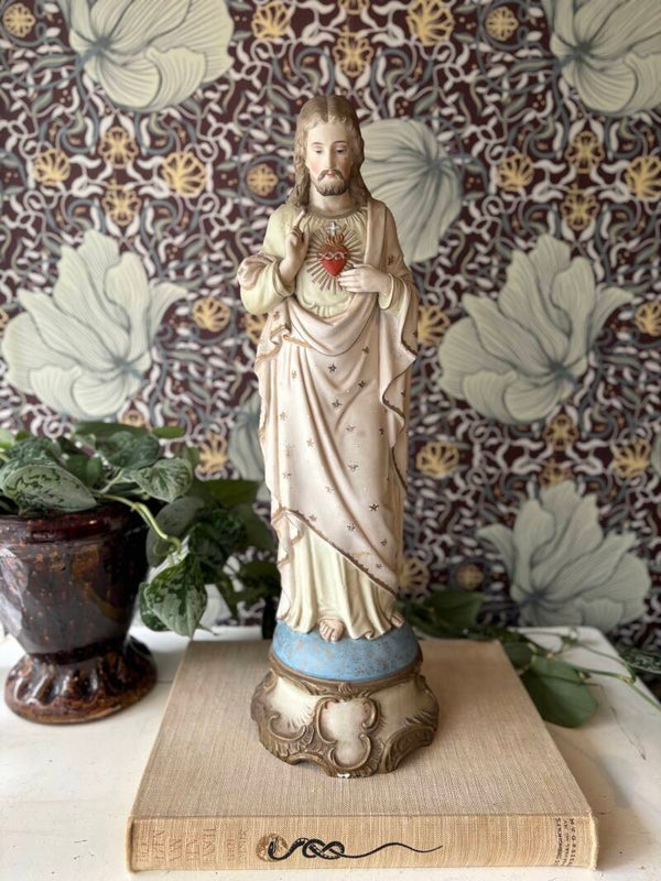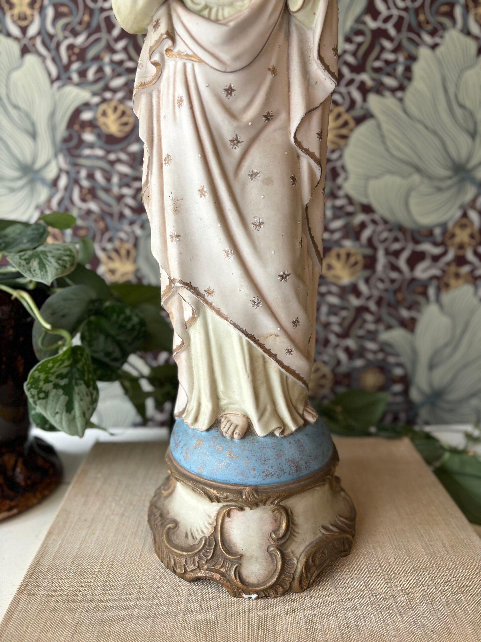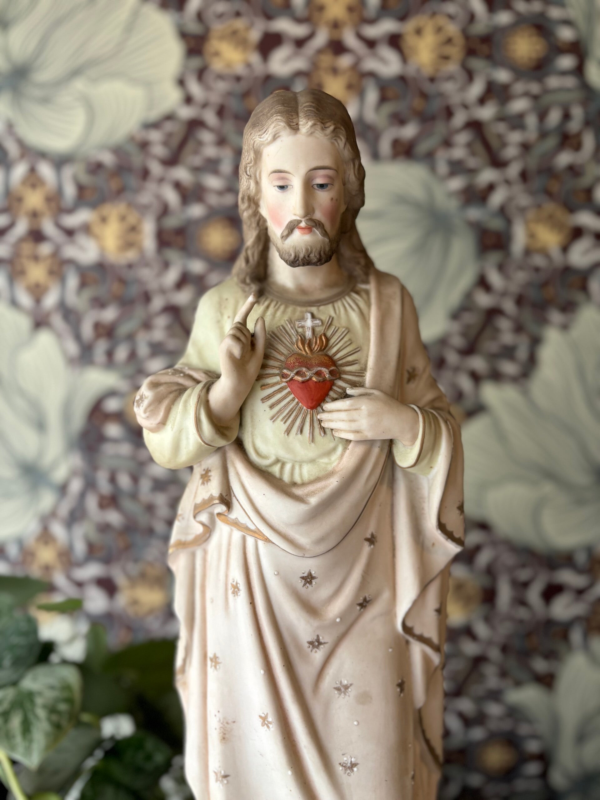 Prachtige biscuit beelden van Jezus en Maria. Mooi als koppeltje, maar ook mooi los van elkaar. De nude kleuren geven een sereen beeld. De voet van Maria is los geweest, daarom heeft zij een andere prijs dan Jezus.
