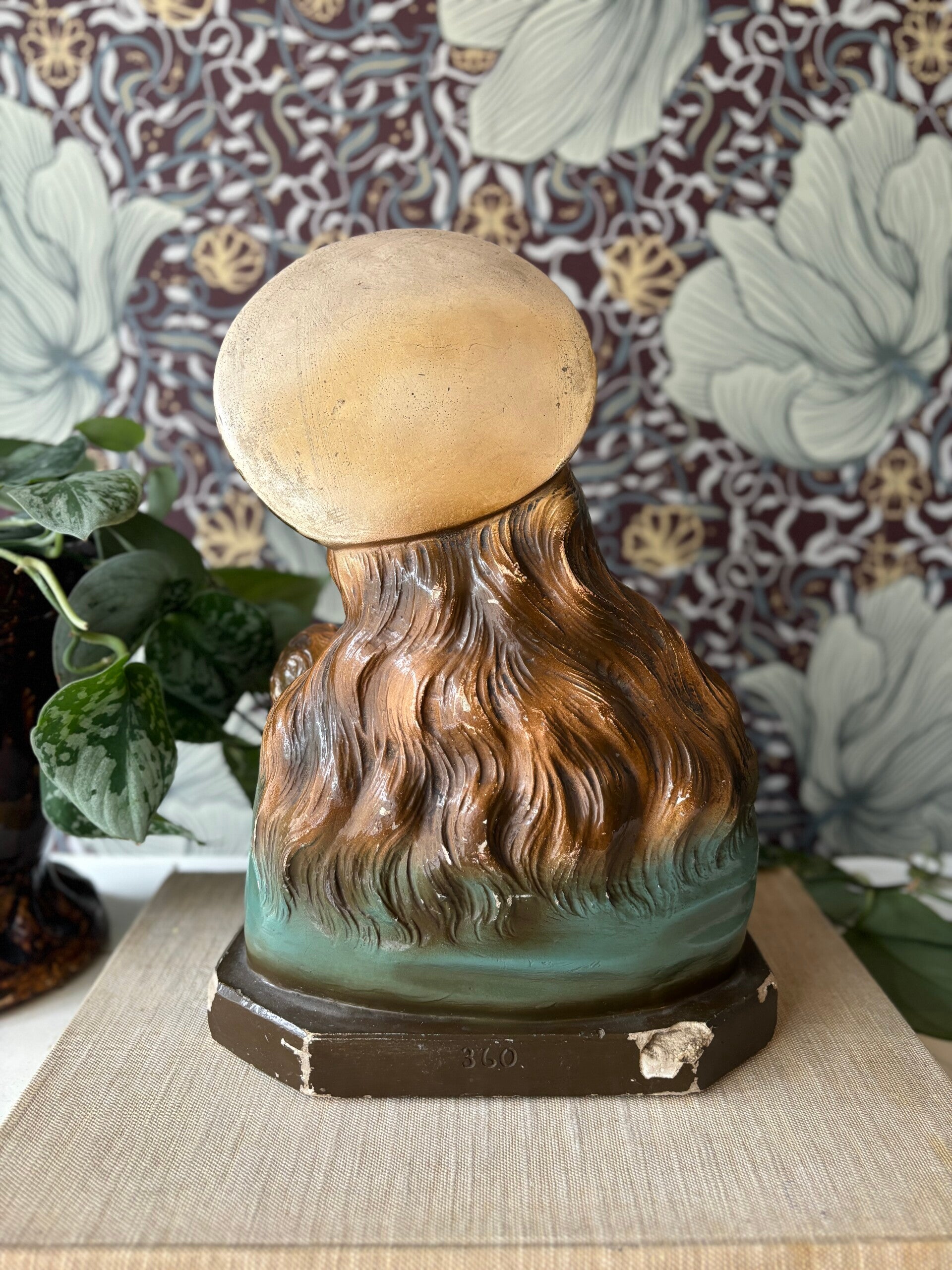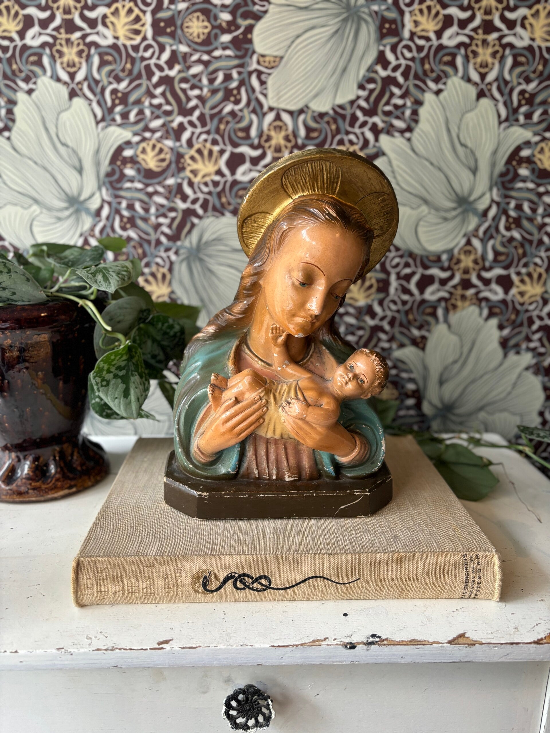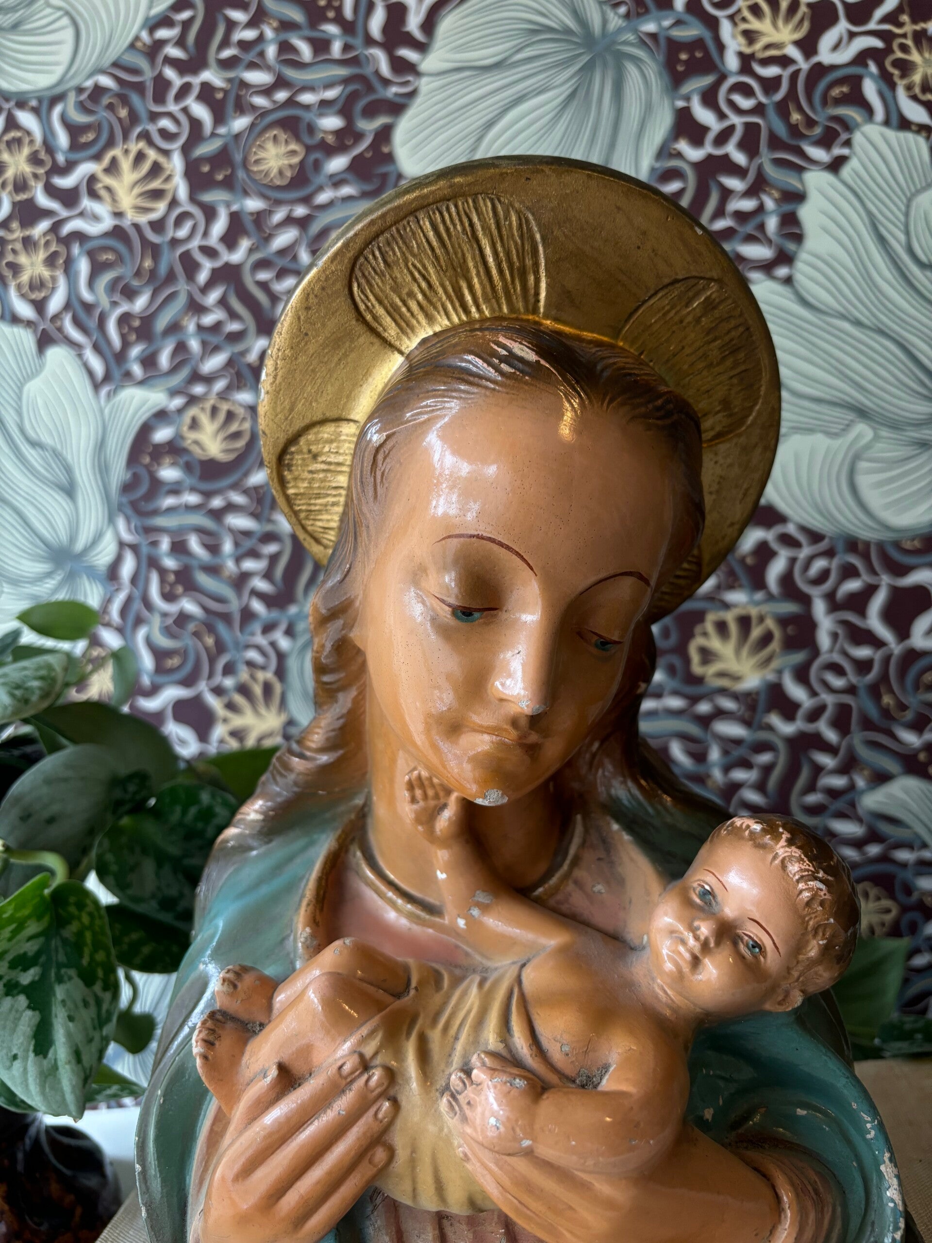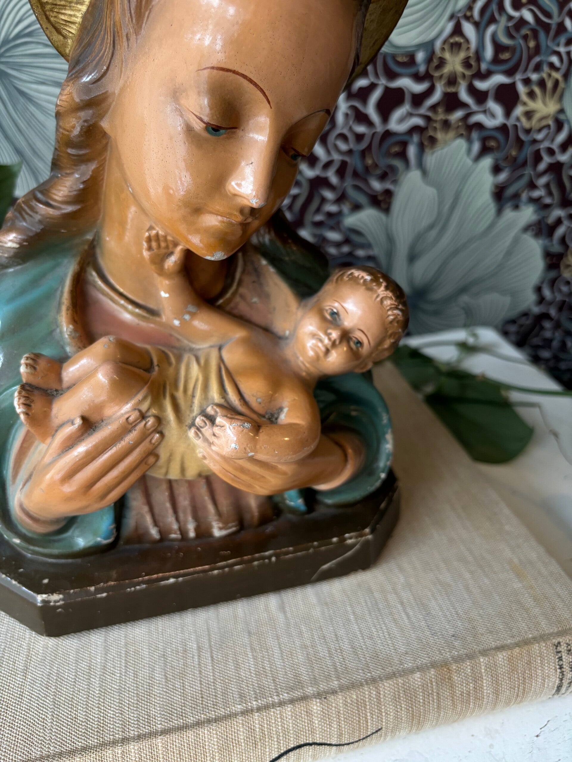 Prachtige vintage buste van Maria met kind. Maria heeft een goudkleurig areool en kijkt lief naar haar kindje.