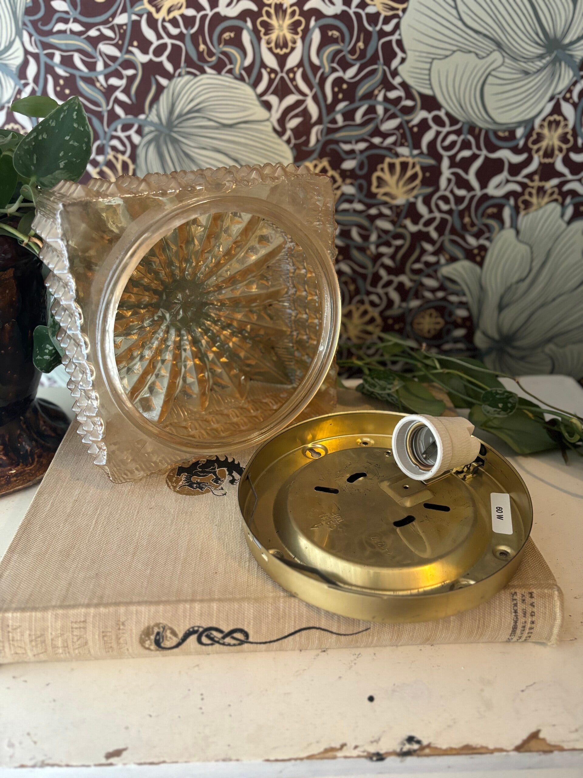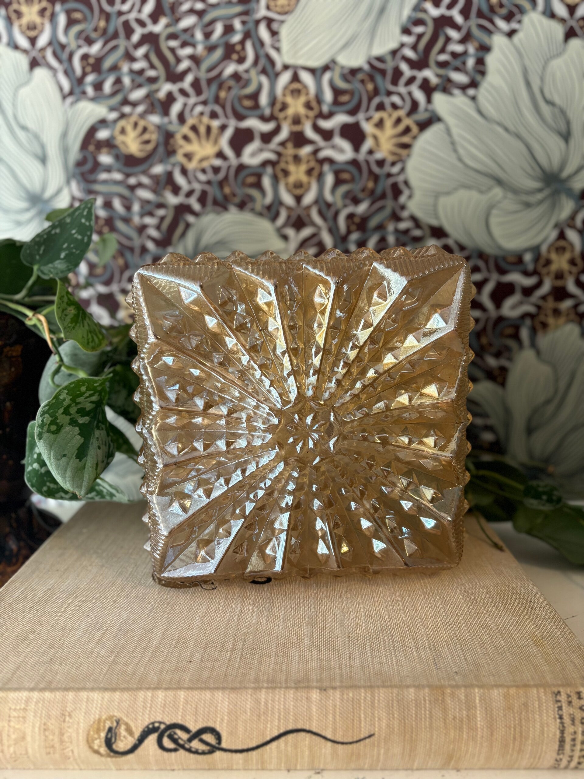 Prachtige plafondlamp in parelmoer gouden kleur. Werkelijk prachtig! Van geperst glas en met mooie bewerking.