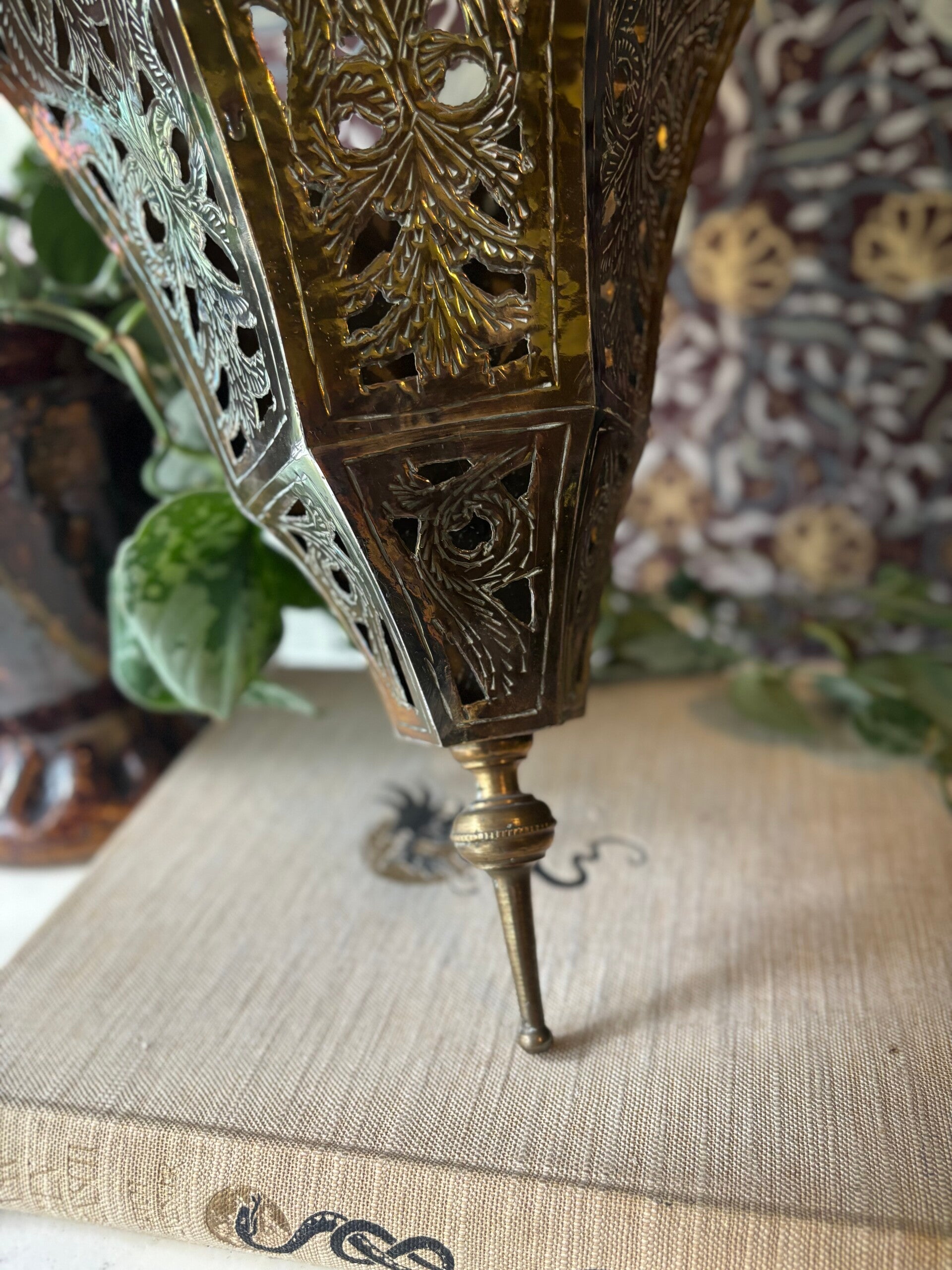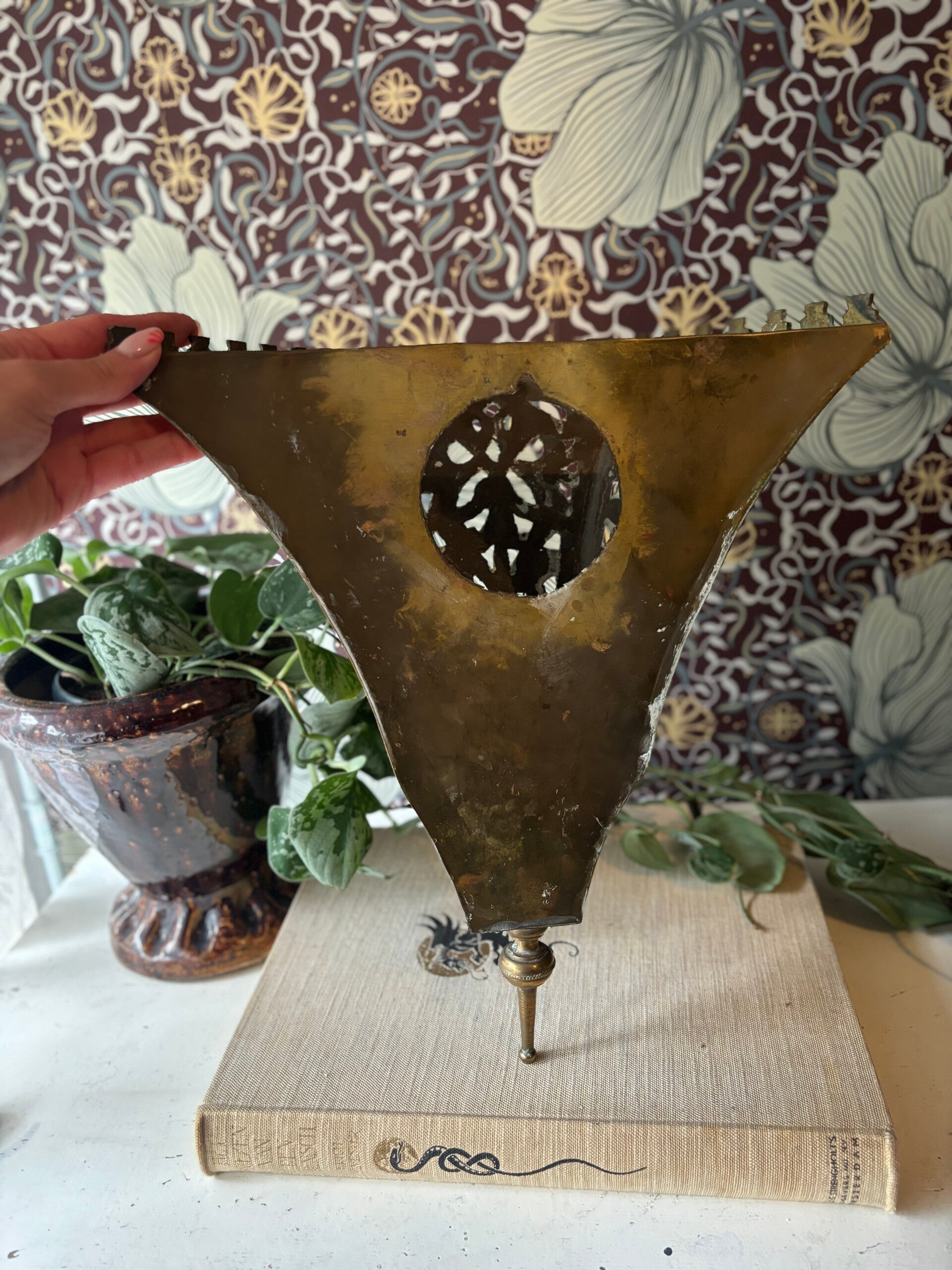 Mooie koperen lampenkap voor aan de wand. De kap geeft ons helemaal Midden Oosten vibes. Prachtig bewerkt, wat een uniek item!