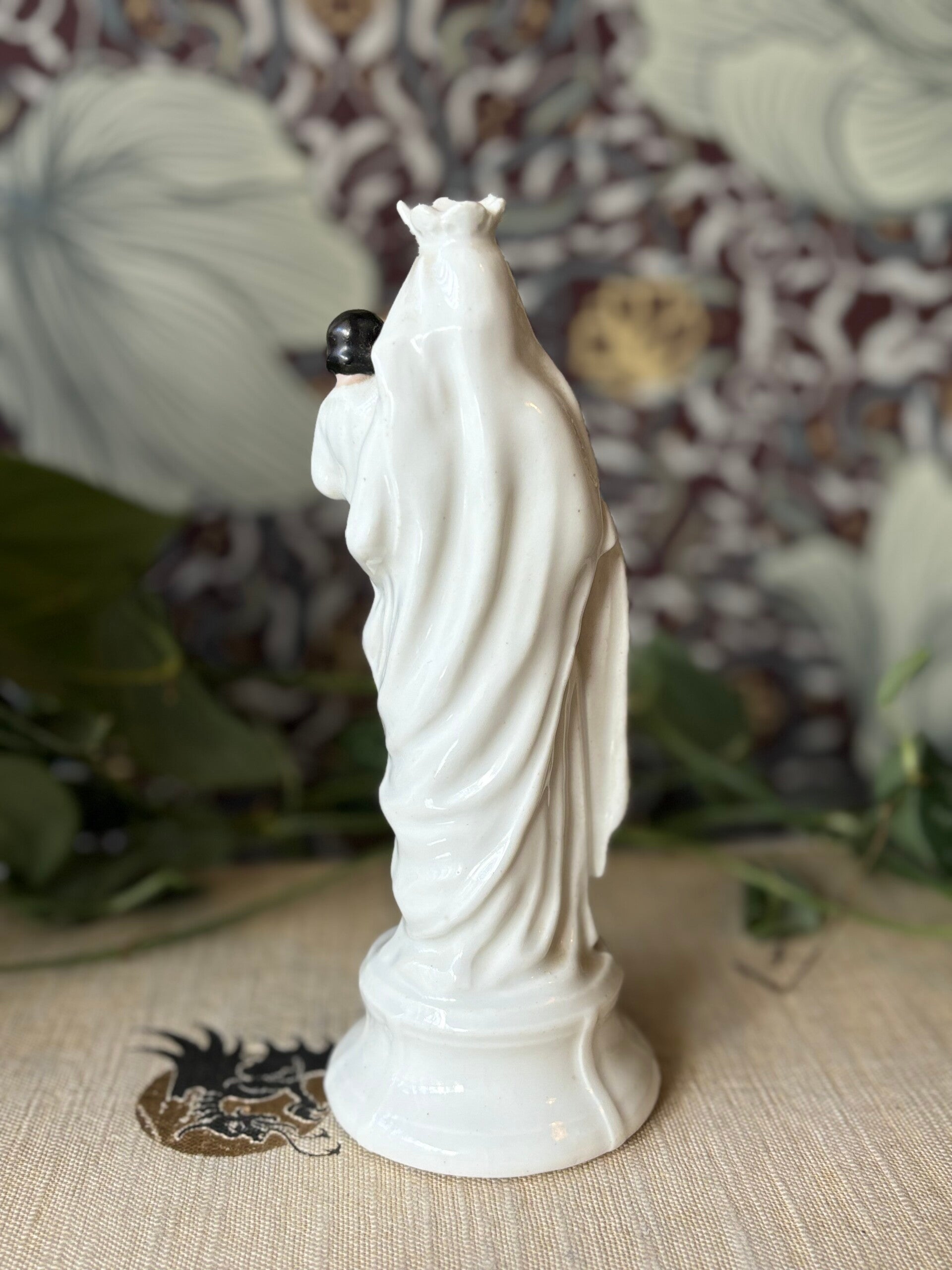 Mooi porseleinen Maria met kindje. In wit met zwarte haren bij zowel moeder als kind. Maria draagt een goudkleurige sleetse kroon, een echt vintage item dus! ♛ 19 cm hoog