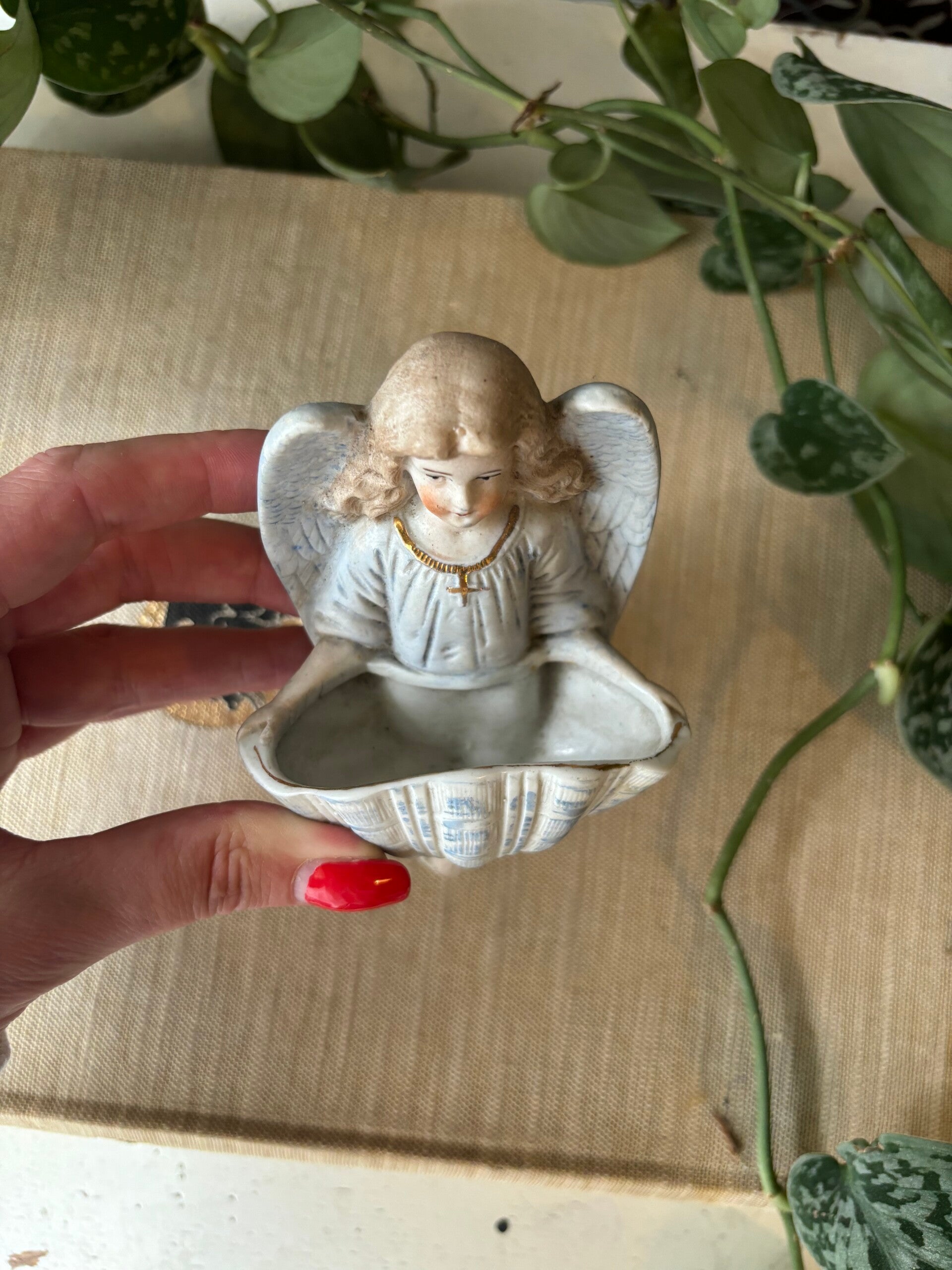 Mooi wijwaterbakje van engeltje. Ze draagt een zachtblauwe jurk en houdt een kommetje vast. De details zijn te mooi! Gemaakt van biscuit.