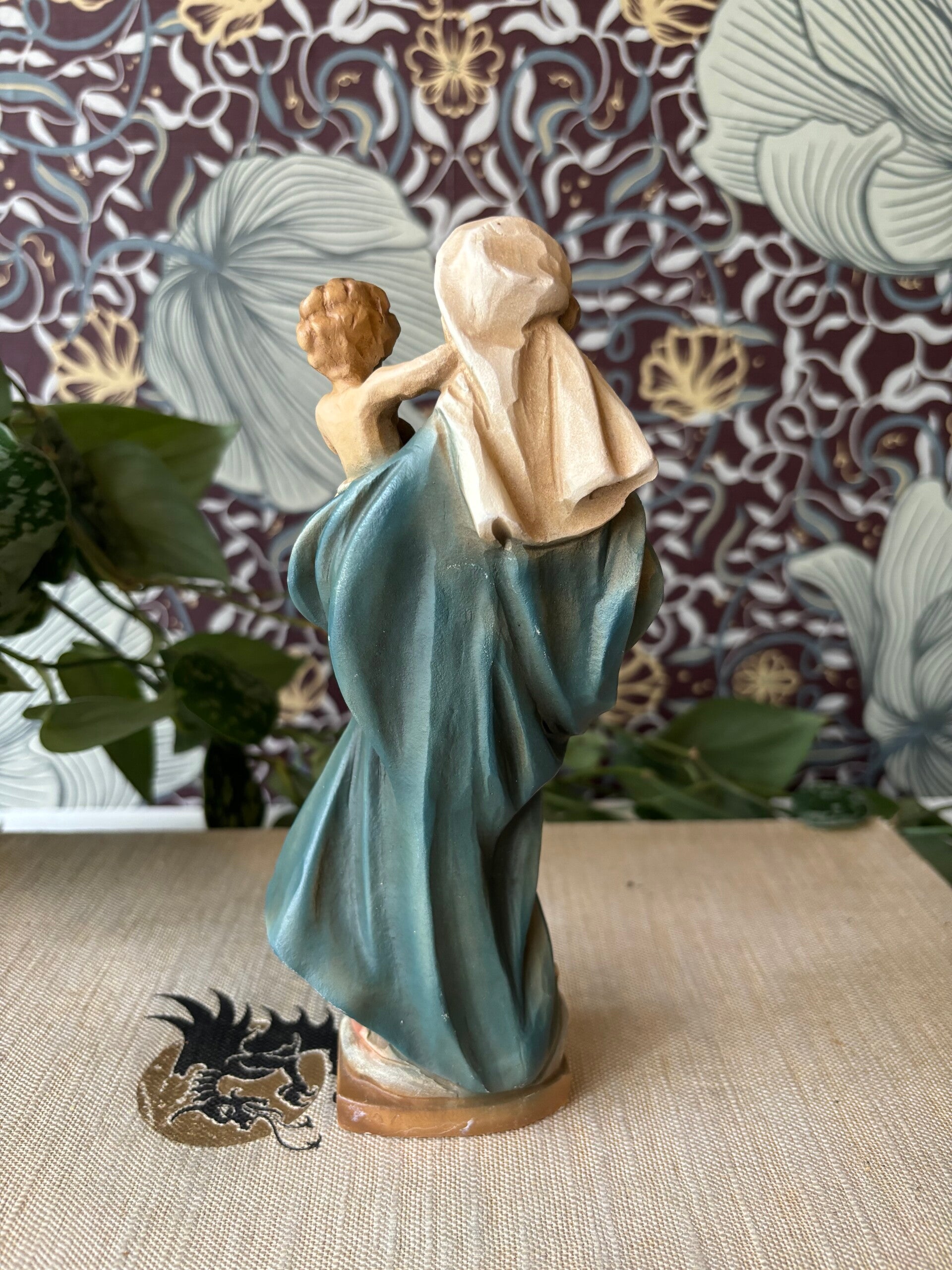 Houten Mariabeeldje met kindje. De aardse tinten maken het een warm beeld. De uitsneden zijn zeer kunstig gemaakt, wat een details!
