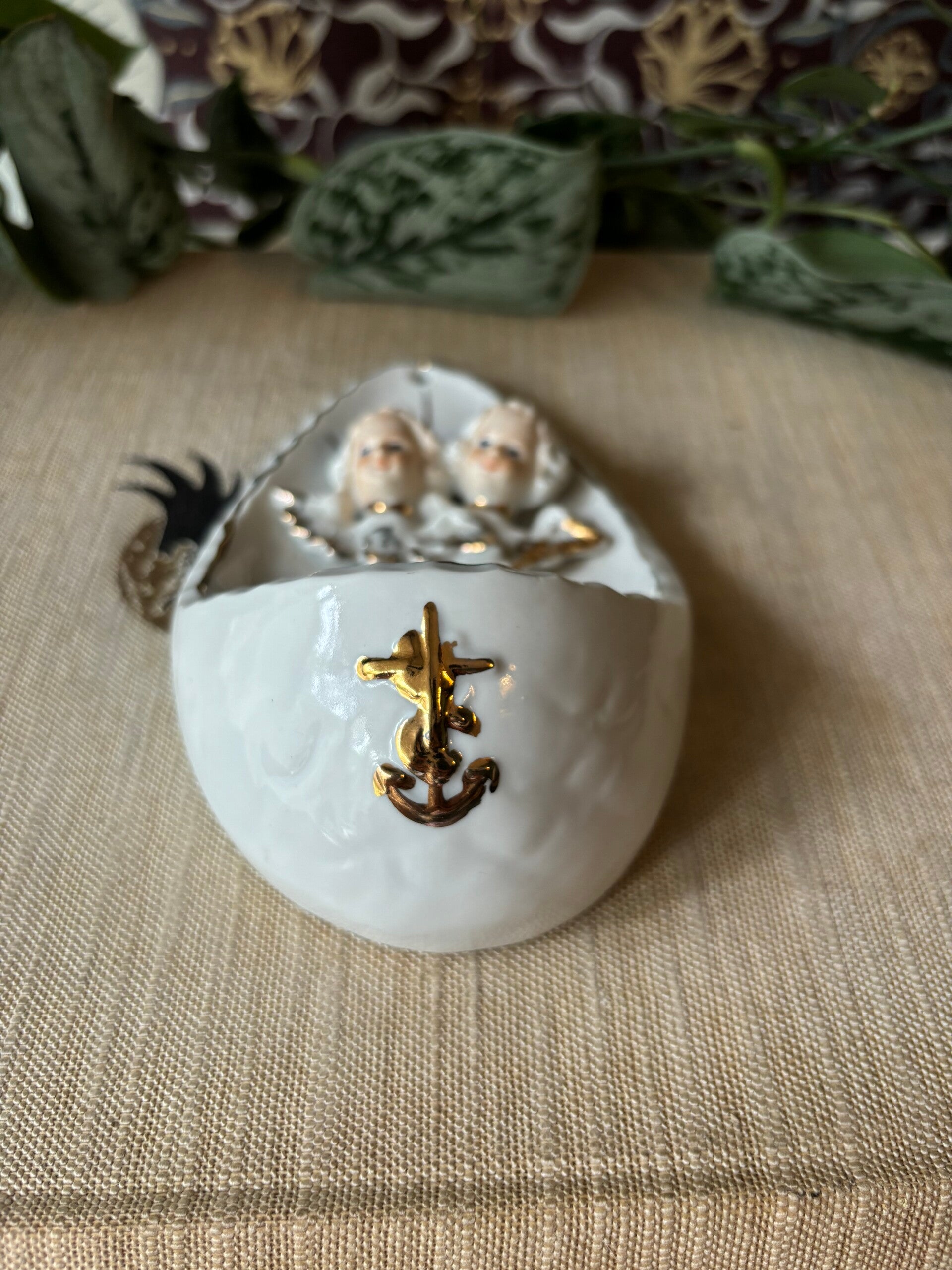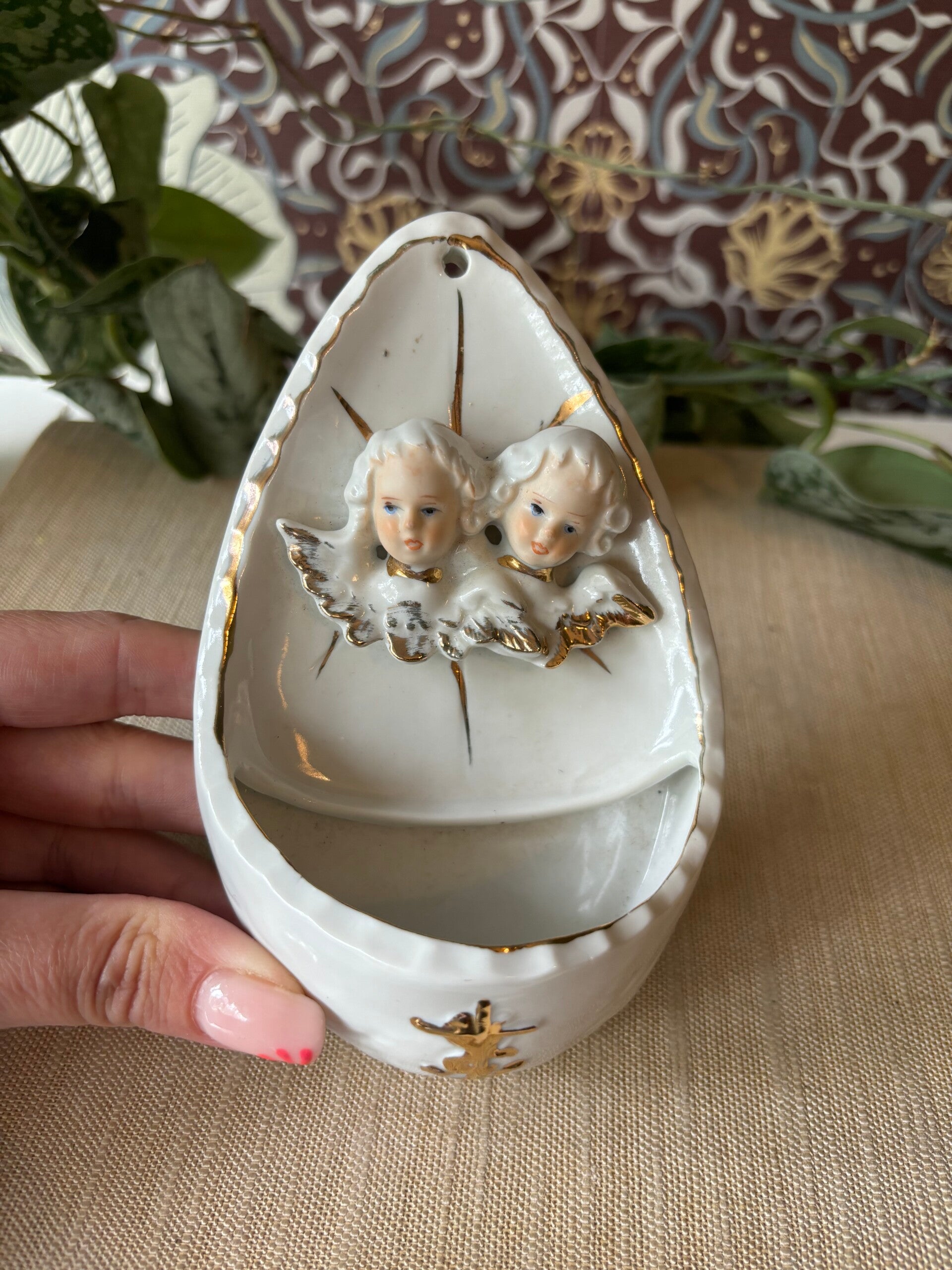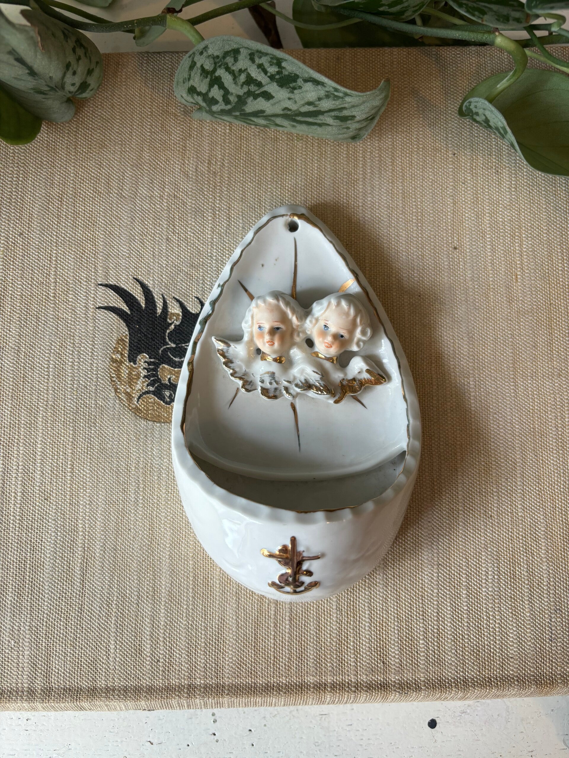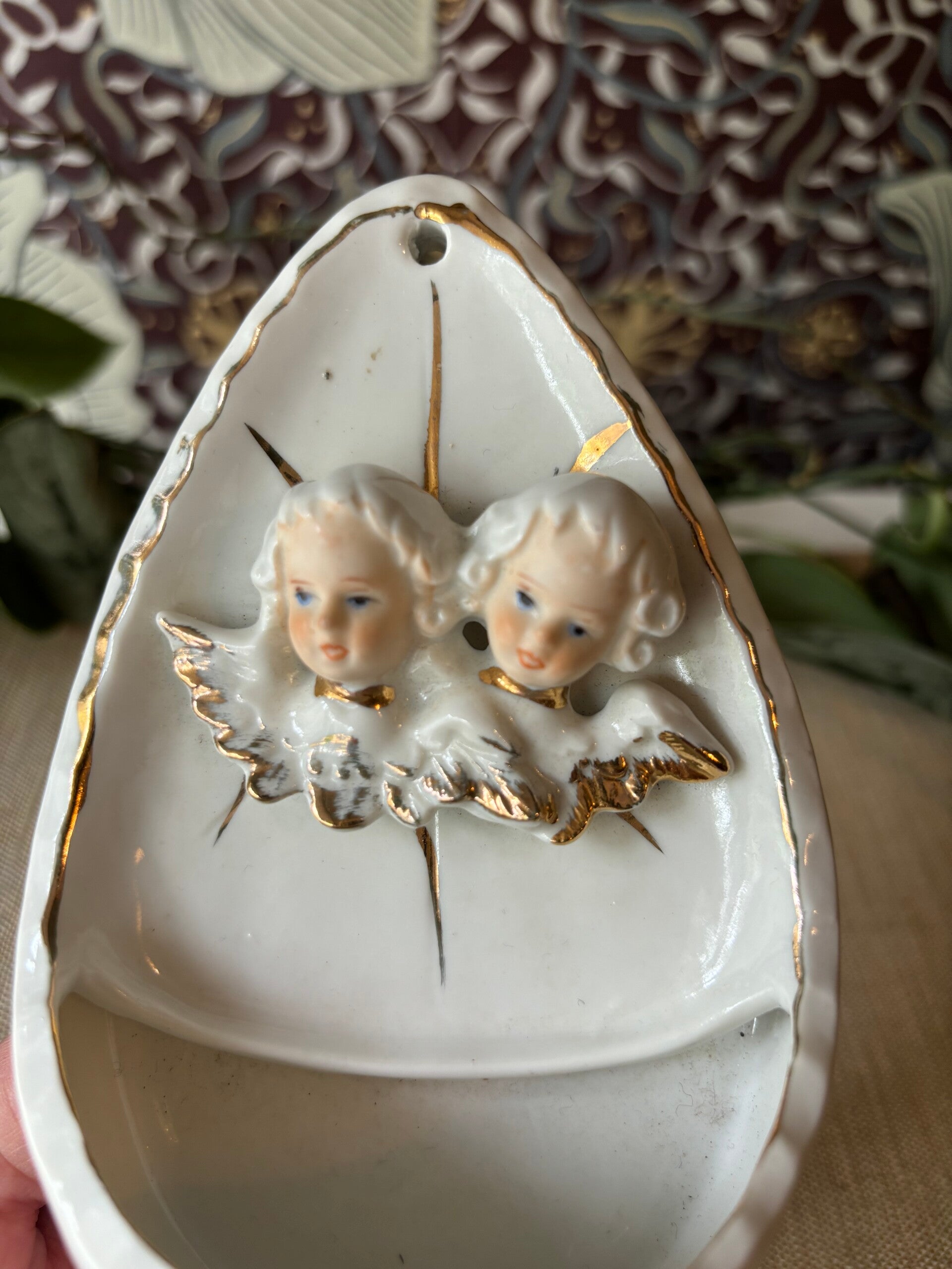 Porseleinen wijwaterbakje met in 3D twee engeltjes en goudkleurige details. Heel schattig! Verder is het bakje eenvoudig, maar dat maakt 'm niet minder mooi.