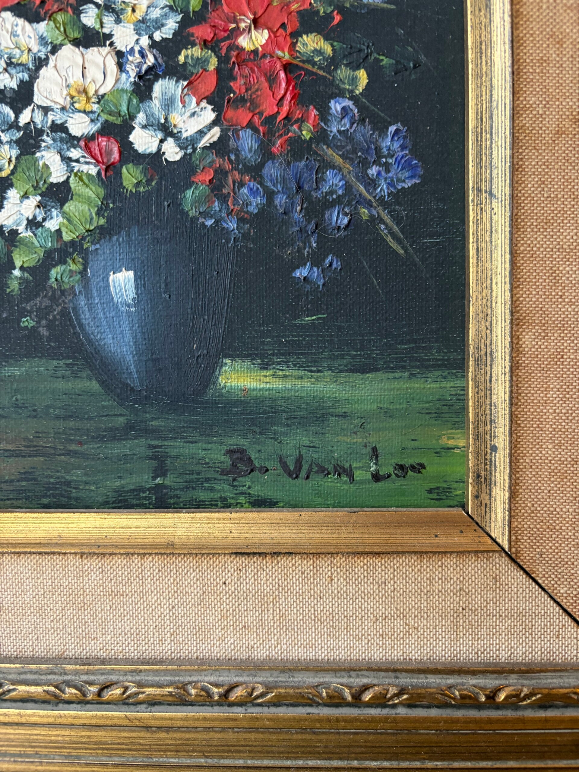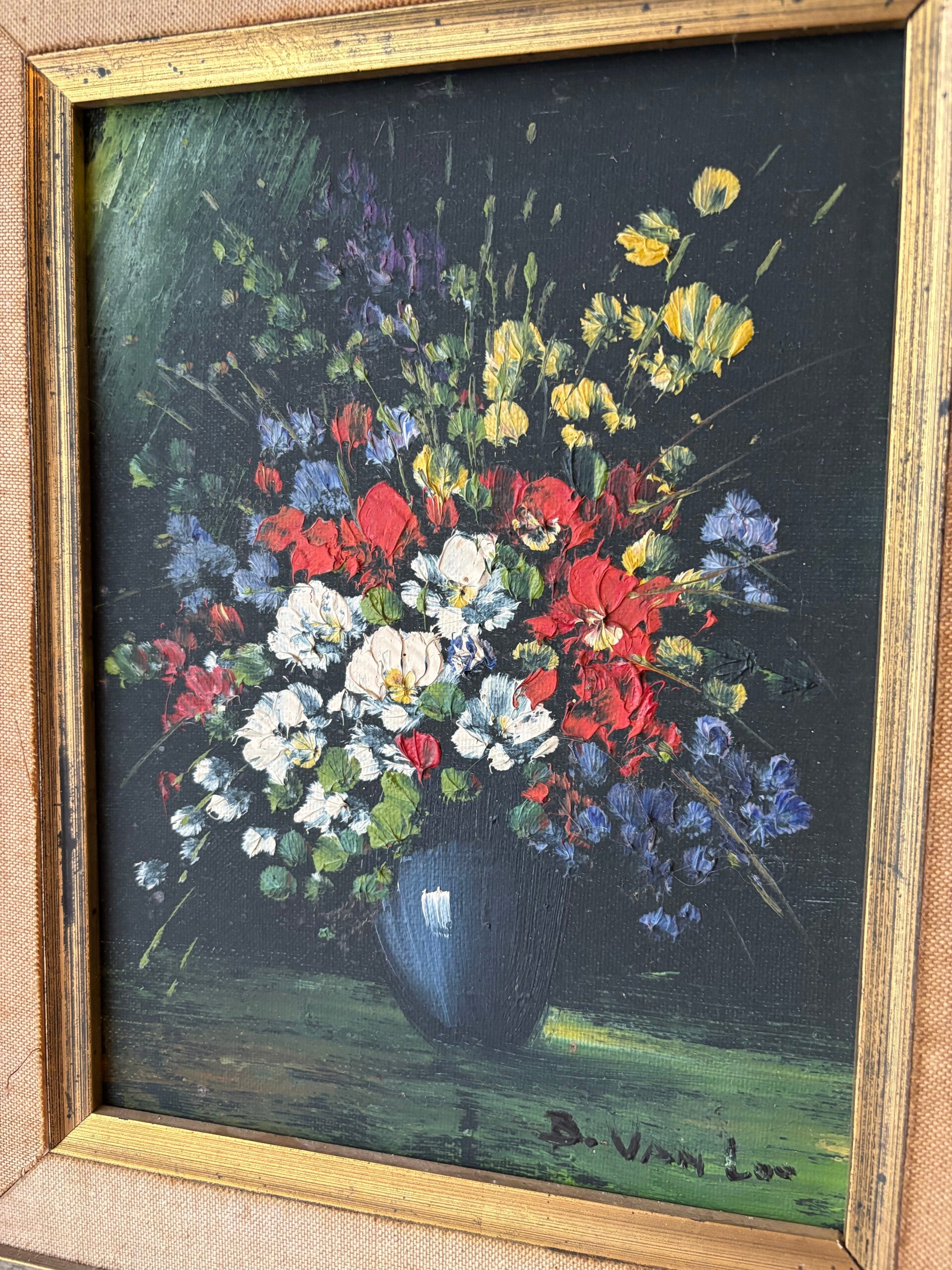 Prachtig olieverf schilderij van bloemen op donkerblauwe achtergrond. Het schilderij is gezet in een prachtige en grote goudkleurige lijst met zwarte en stoffen afwerking. Wat een plaatje! En een oudje, want het 'Quality' kaartje zit er nog bij, dit schilderij komt uit de 19e eeuw en bezit het label volgens de Belgische wet uit 1926.
