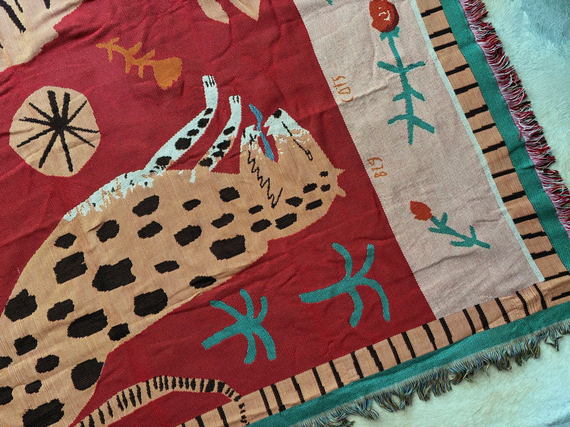 Prachtig vintage look kleed, met panter patroon en rood in de hoofdrol. Te gebruiken als kleed voor op de bank of stoel, maar ook mee te nemen voor een picknick in het park of dagje strand, hoe leuk als vloerkleed of speelkleed voor de kids? Je zou er zelfs een wandkleed van kunnen maken. Multi inzetbaar dus. Wij zijn er weg van 😍
