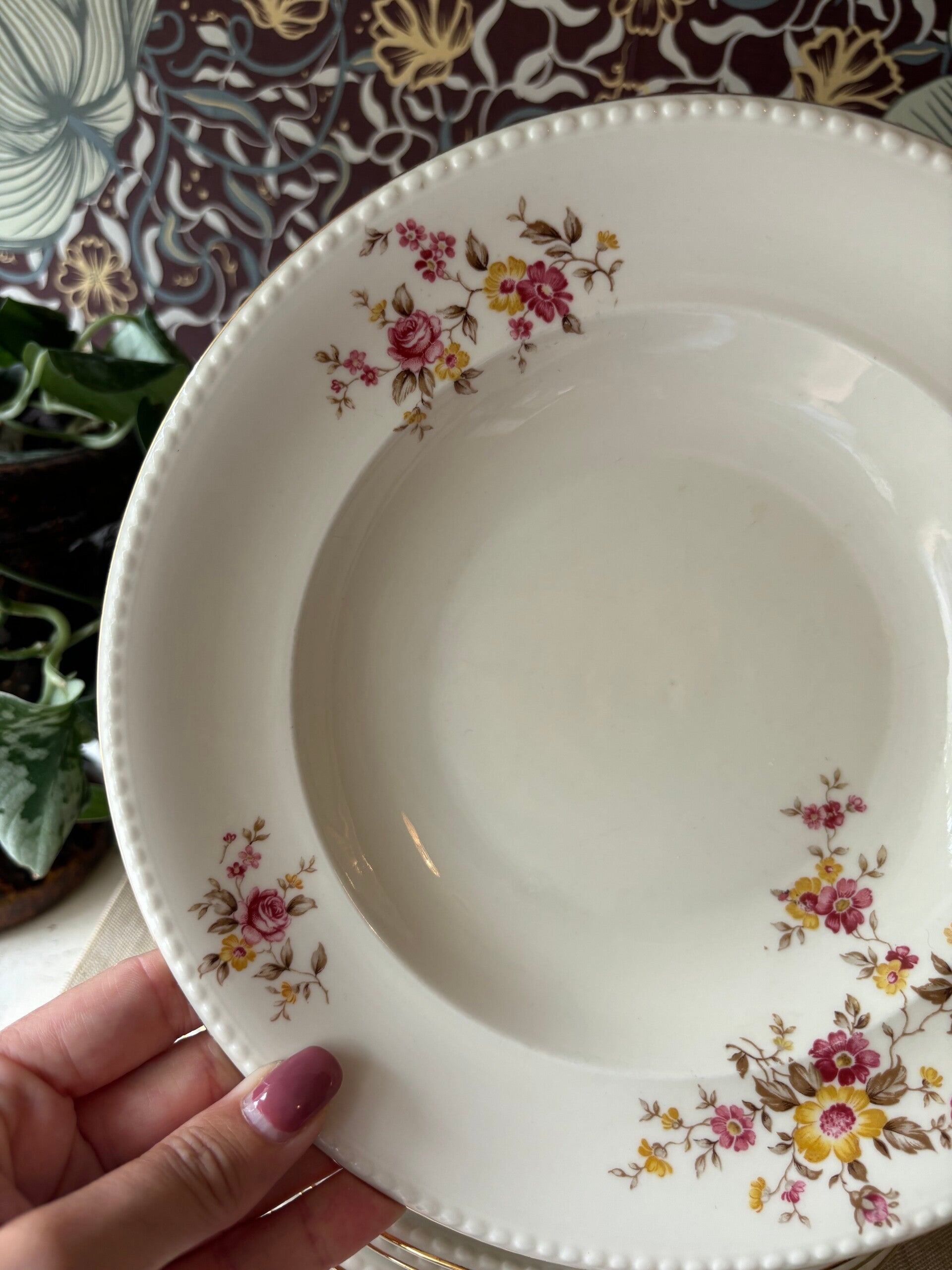 Set van 6 diepe borden van het Amsterdamse Spenzo. De borden komen uit de serie 'Parel'. Gemaakt van roomkleurig porselein en versierd met roze roosjes en gele bloemen. De rand heeft een sierlijk ribbel randje en afgewerkt met goud. Afkomstig uit de jaren '30.