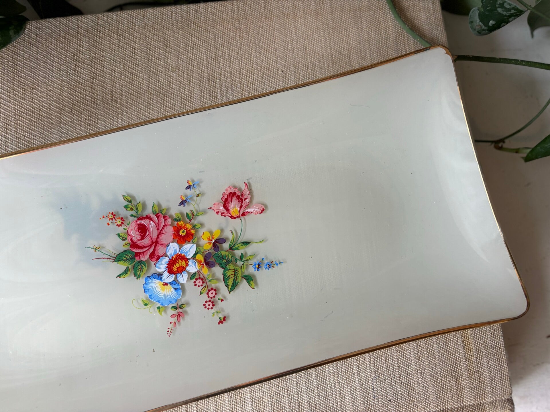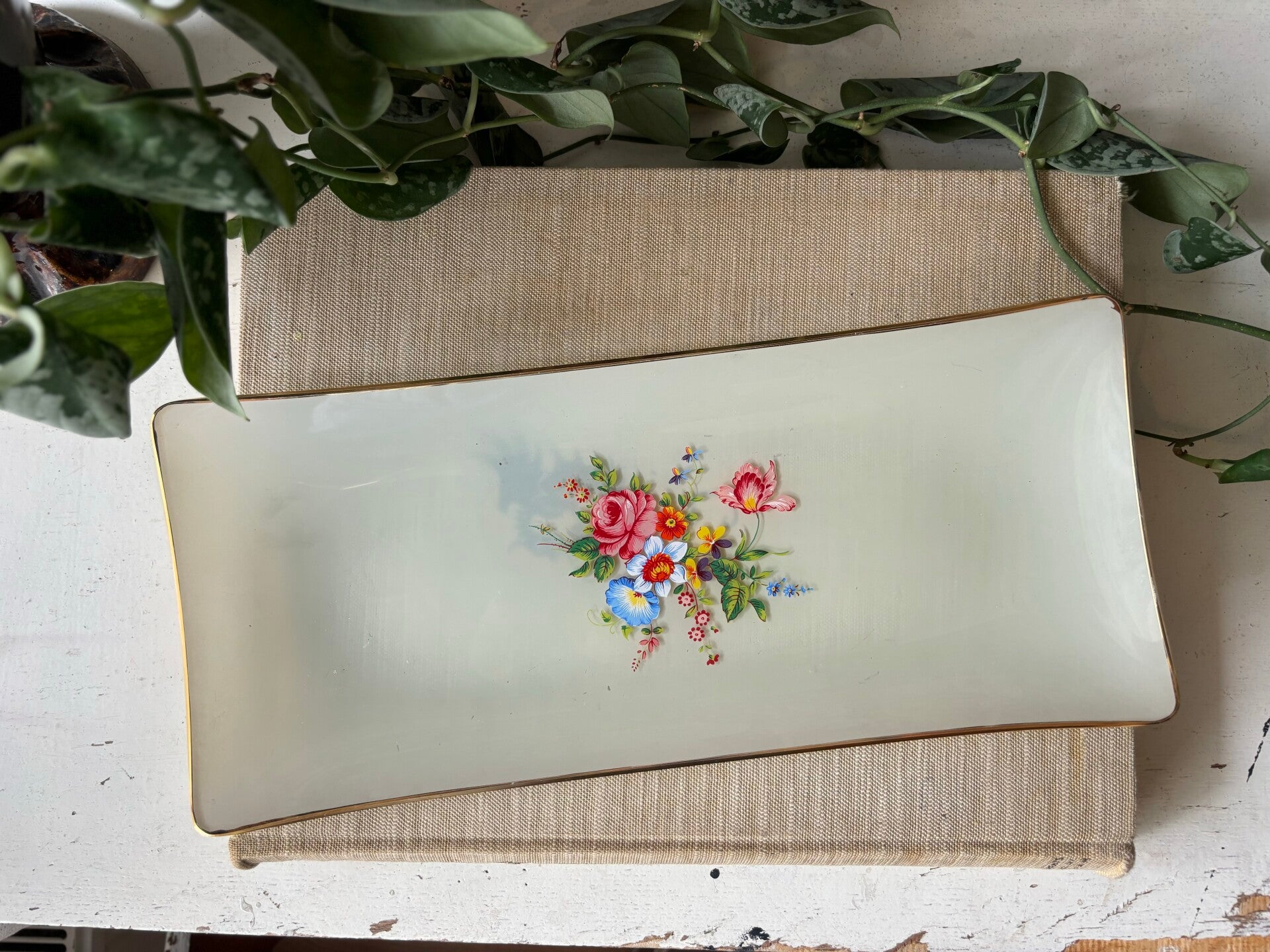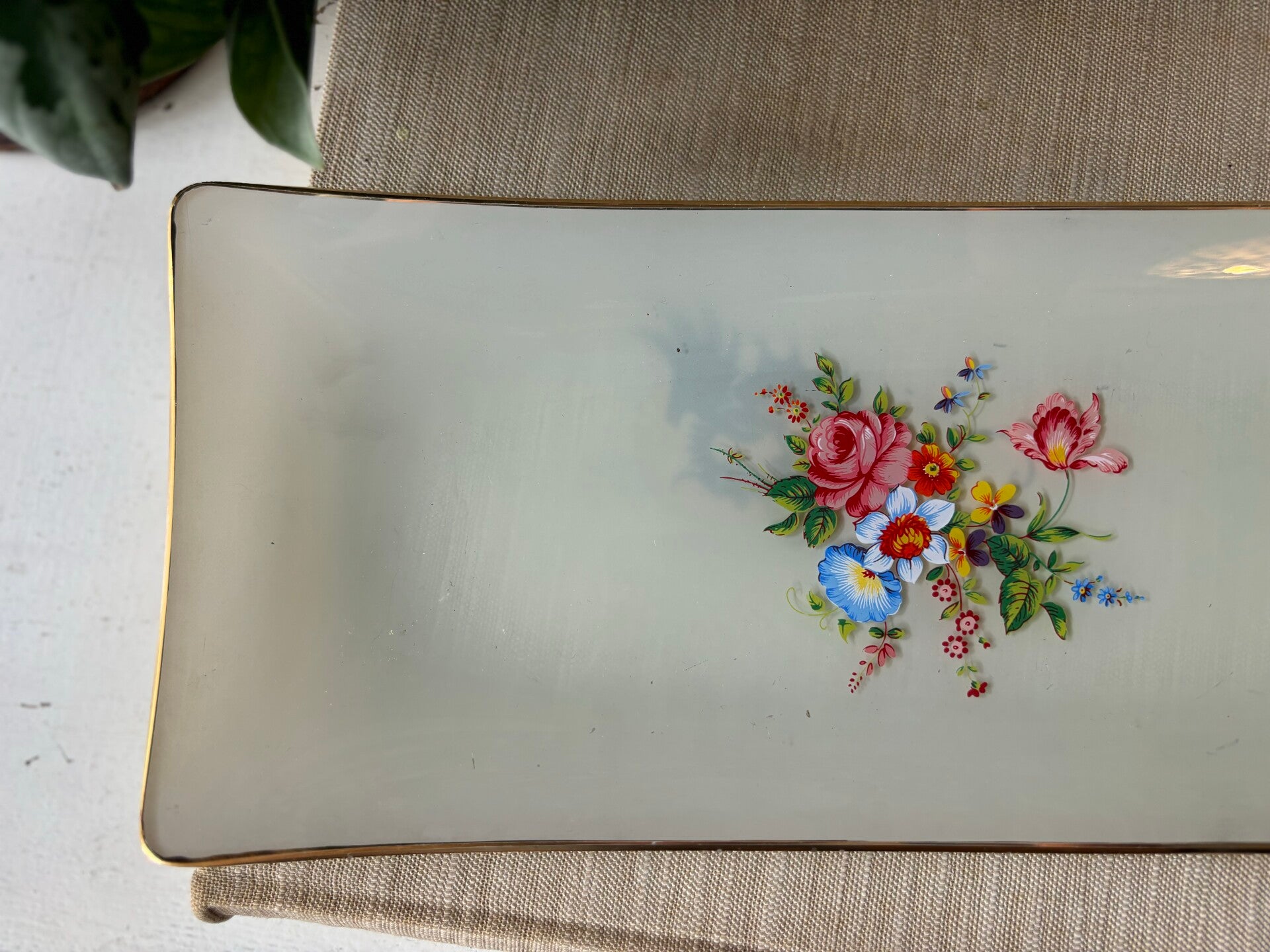 Glazen cakeschaal van melkglas en handgeschilderde boeket Alpen bloemen in het midden. De schaal heeft een gouden rand, dat maakt het helemaal af!