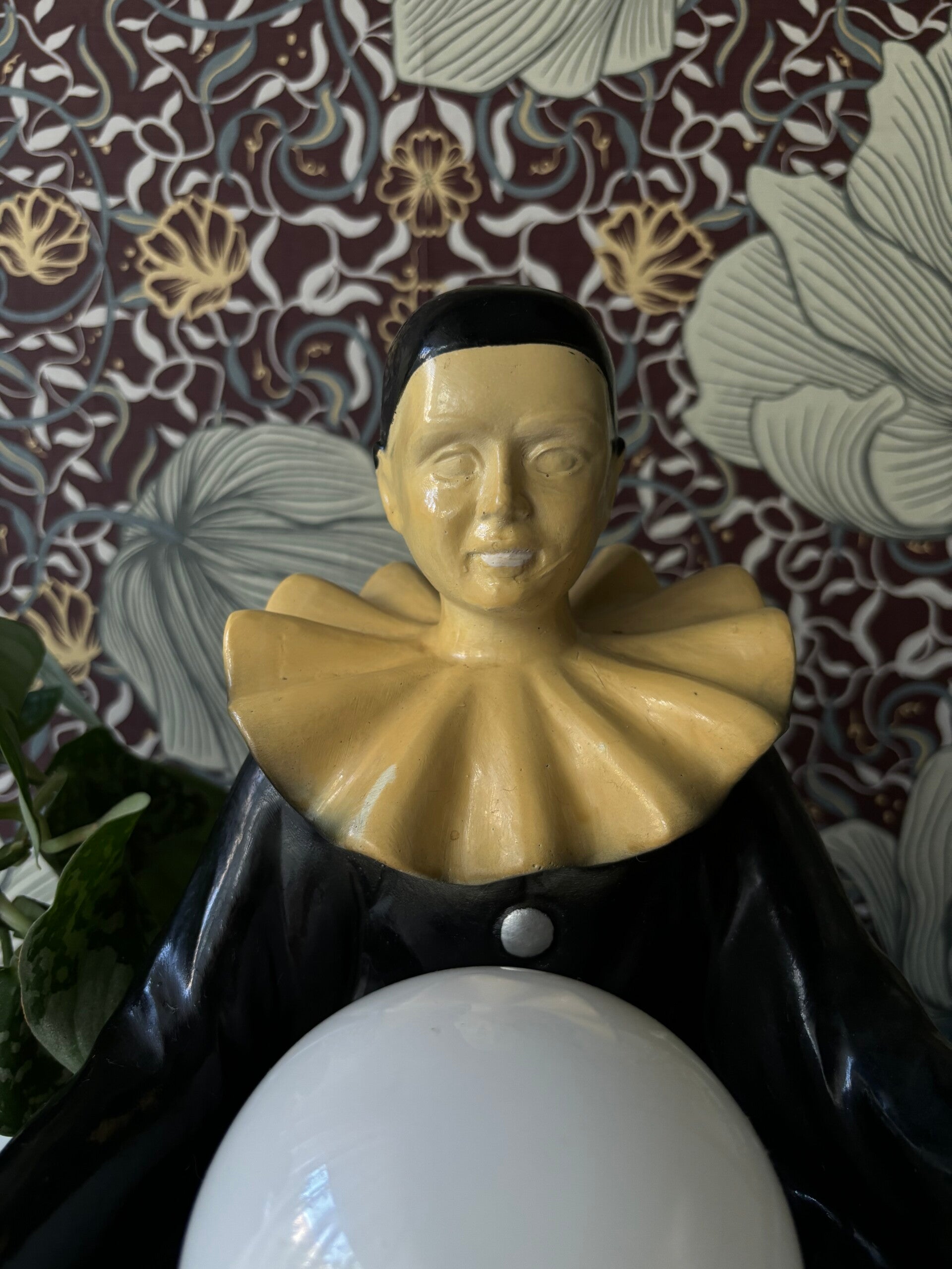 Prachtige mid century Pierrot lamp. Een zittende pierrot met een opaline bol op schoot. Afkomstig uit de jaren '70. Wederom weer een prachtige eyecatcher! De tafellamp is in vintage conditie en heeft een nieuw snoer welke bevestigd is aan de oude knipper.
