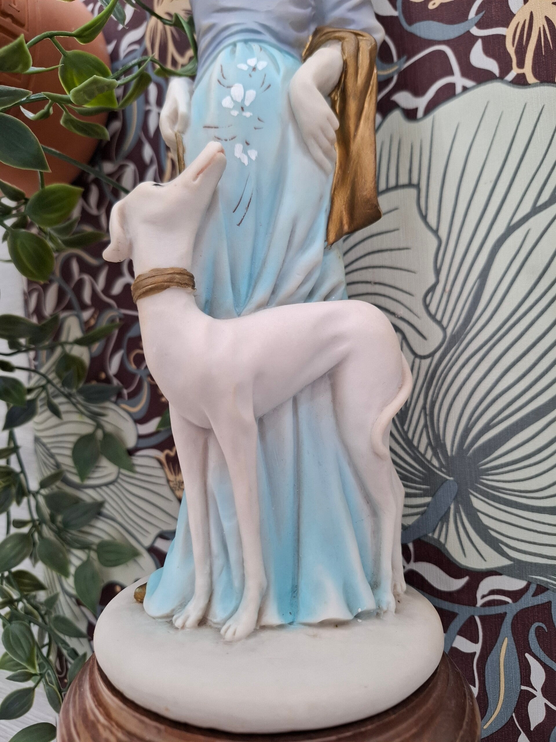 Wat een pareltje is dit oude beeld van een dame met haar windhond. Prachtige delicate kleuren. Gemaakt van ruw porselein. Speciaal voor de liefhebbers van oude beelden.