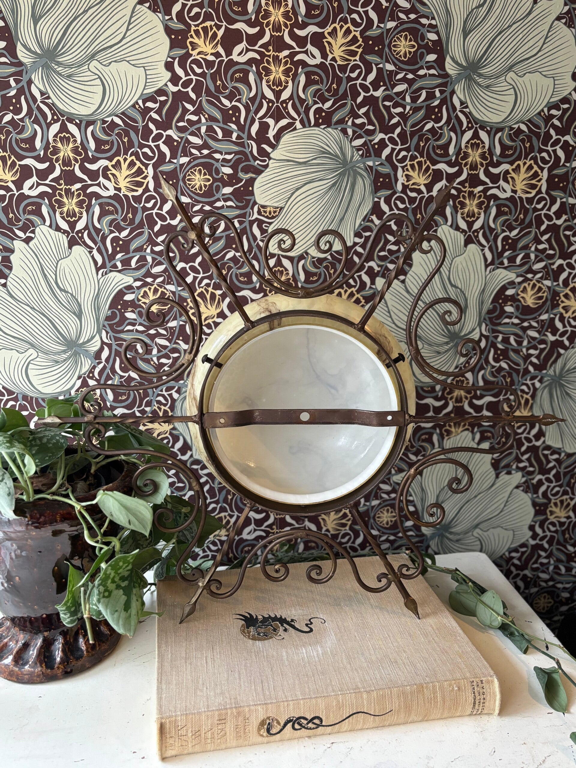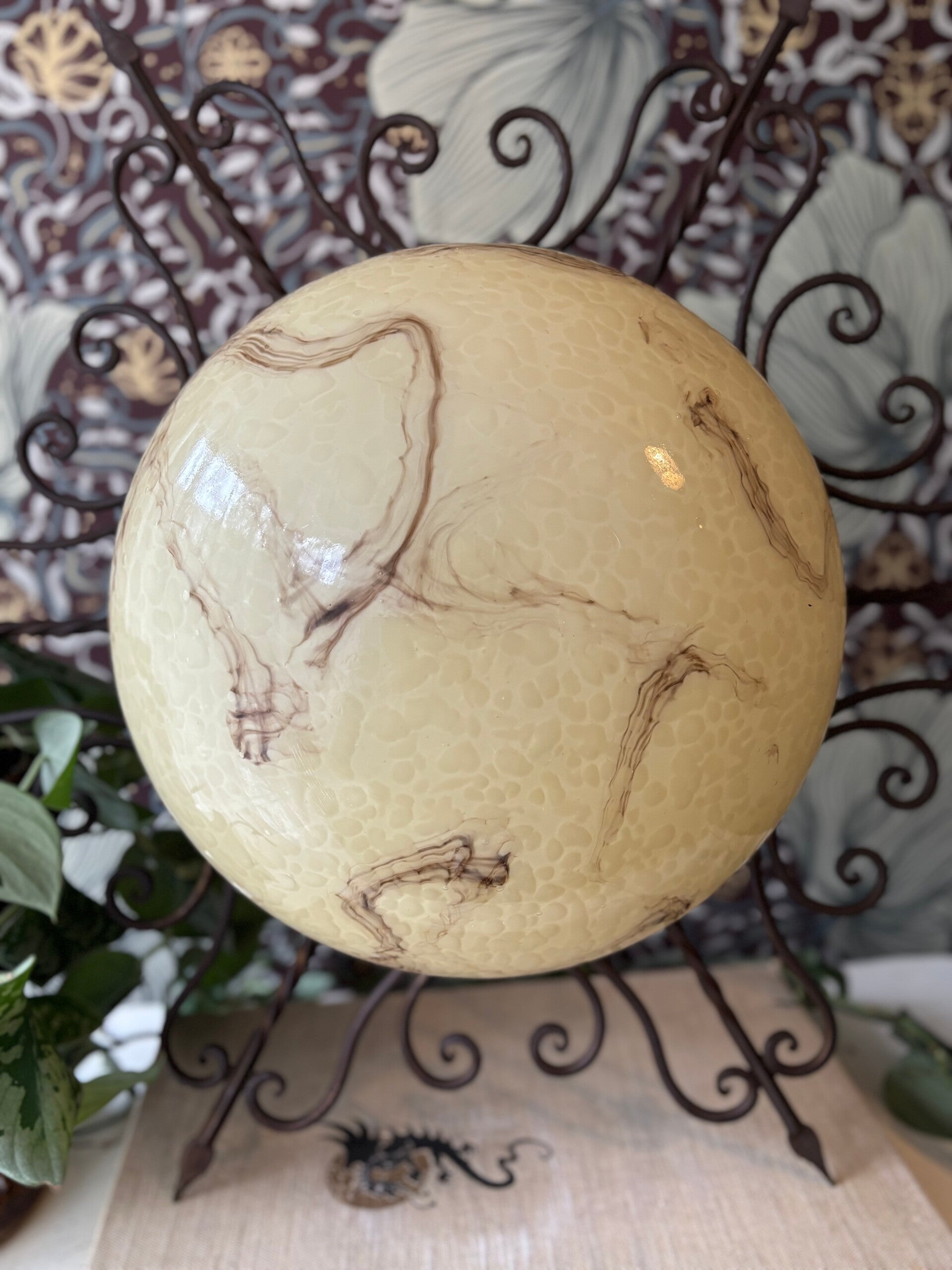 Prachtige Art Deco stijl plafondlamp. De opaline kap is gemaakt in 'butter marmer' stijl. De gietijzeren rand maakt het helemaal af. Wat een parel!