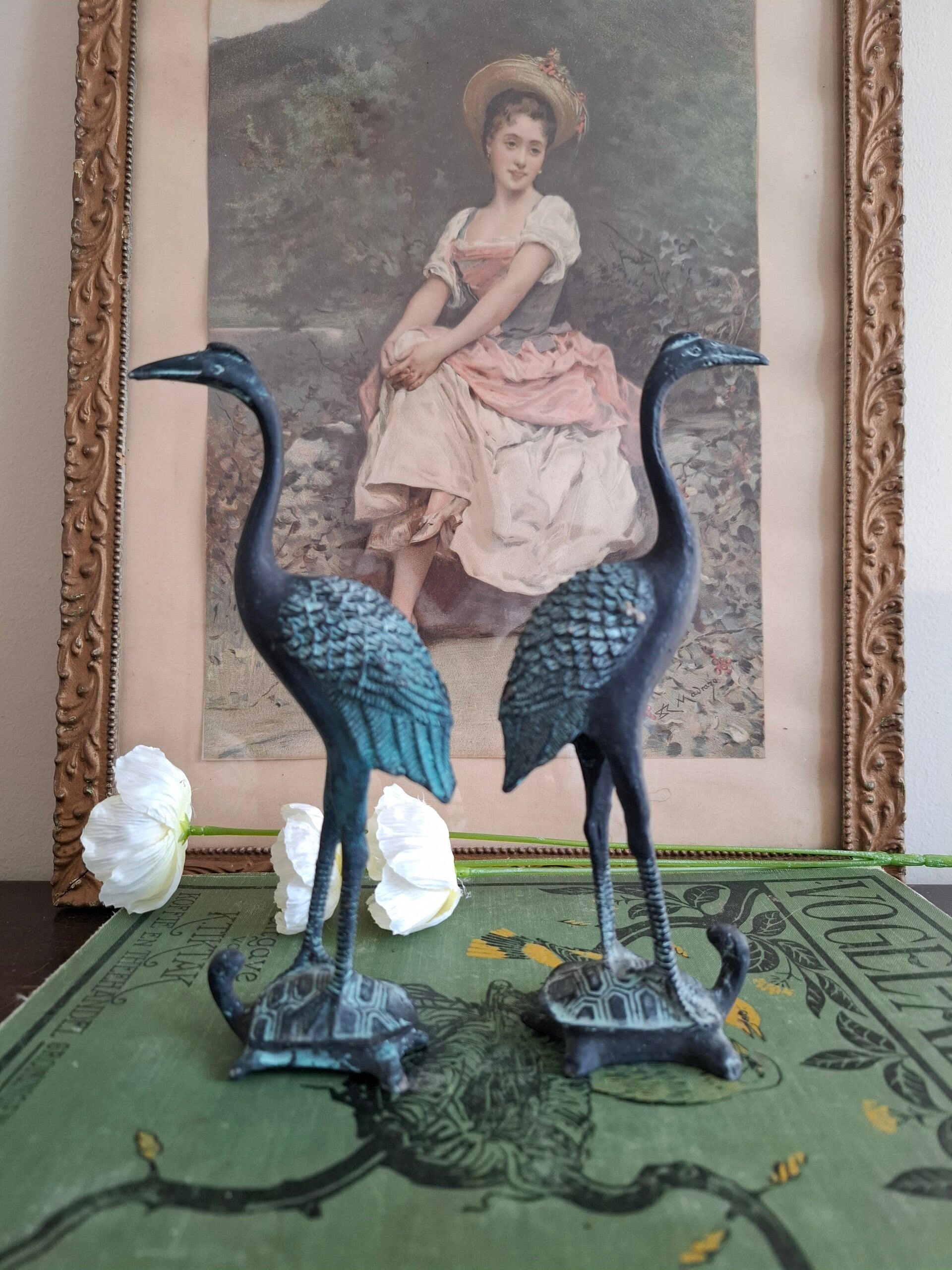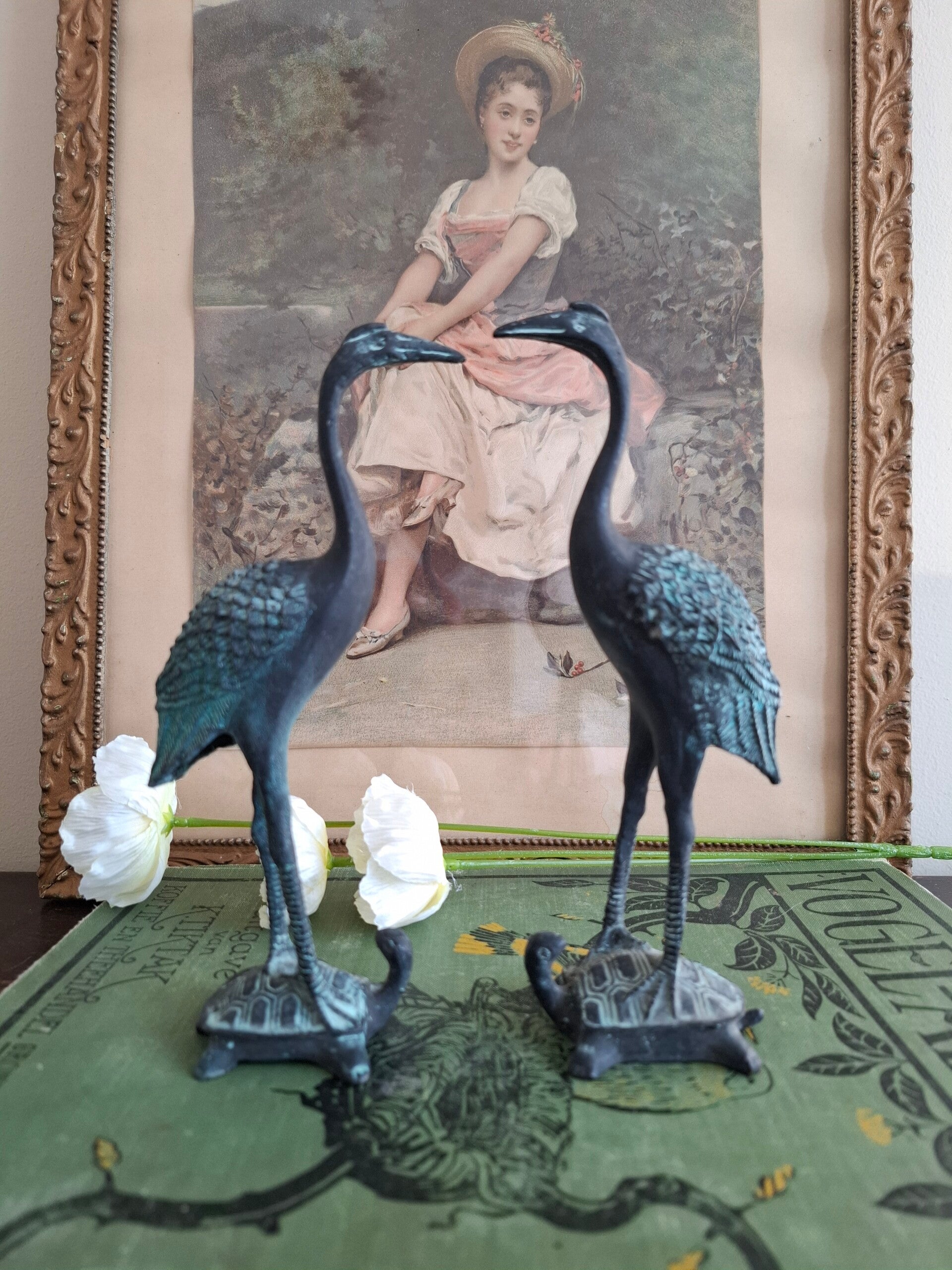 Wat een beautys zijn deze Vintage gepatineerde bronzen kraanvogels. Kraanvogels staan voor geluk. Deze kraanvogels staan op een schildpad wat symbolisch staat voor hemel en aarde. Een must have voor in huis.
