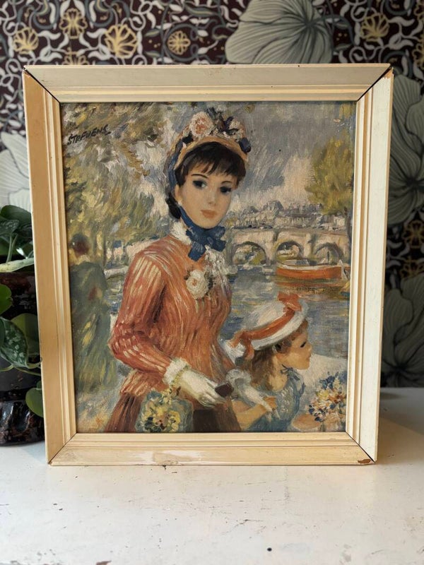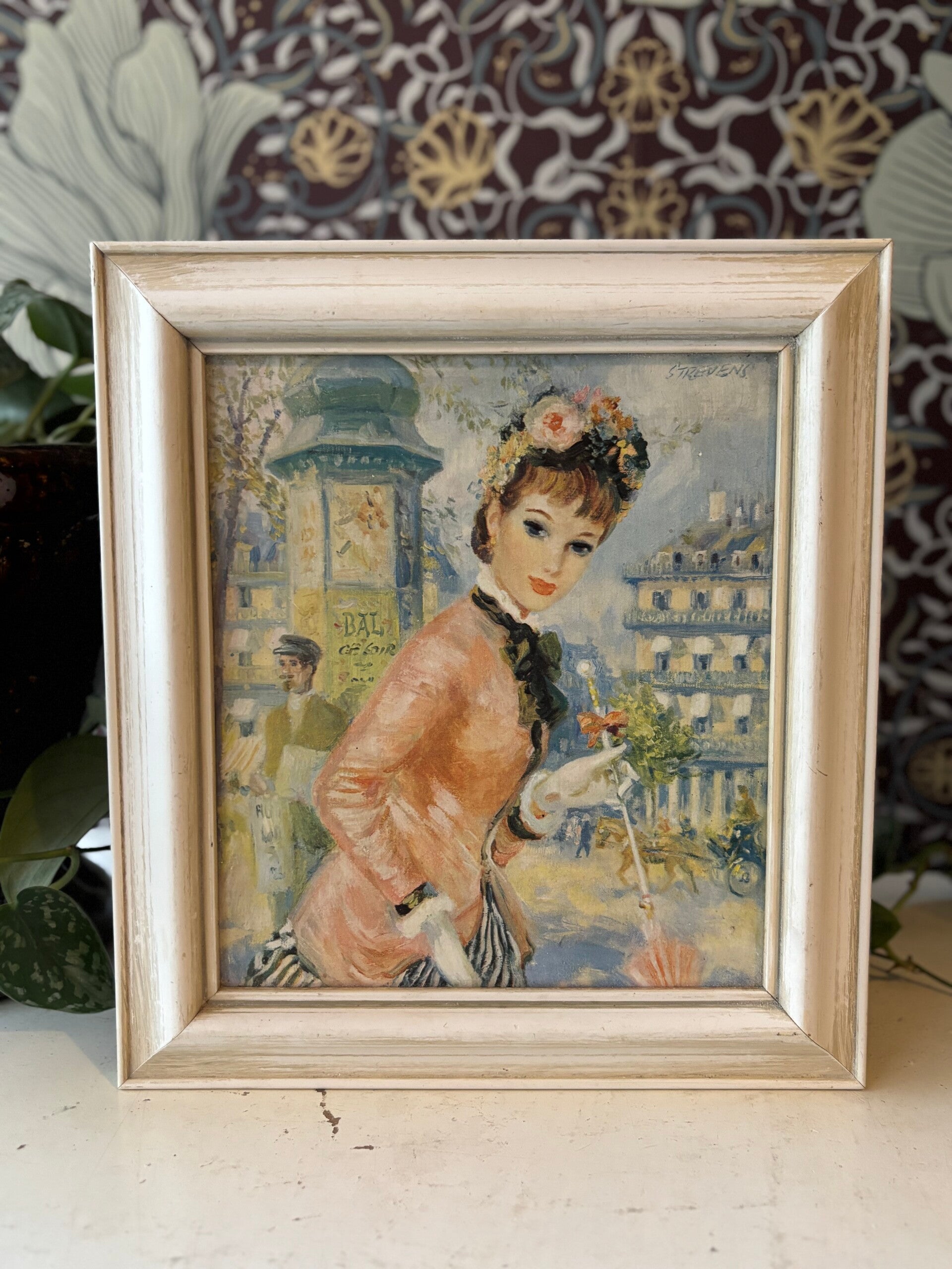 Mooie collectie prenten van vintage Franse dames. Allemaal mooie tafereeltjes in wittige lijstjes. Te leuk pareltje voor aan een muur vol lijsten en foto's. Ze zijn vintage en oud en zijn daarom hier en daar met een vintage oneffenheid.