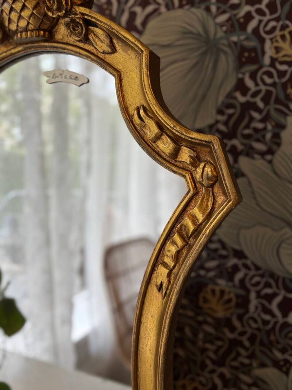 Mooie houten spiegel met rozen in mandje aan de bovenkant. De hoekige vorm en afwerking maken deze spiegel weer one of a kind. Kleine vintage oneffenheid aan de binnenkant. Dit is meegenomen in de prijs.