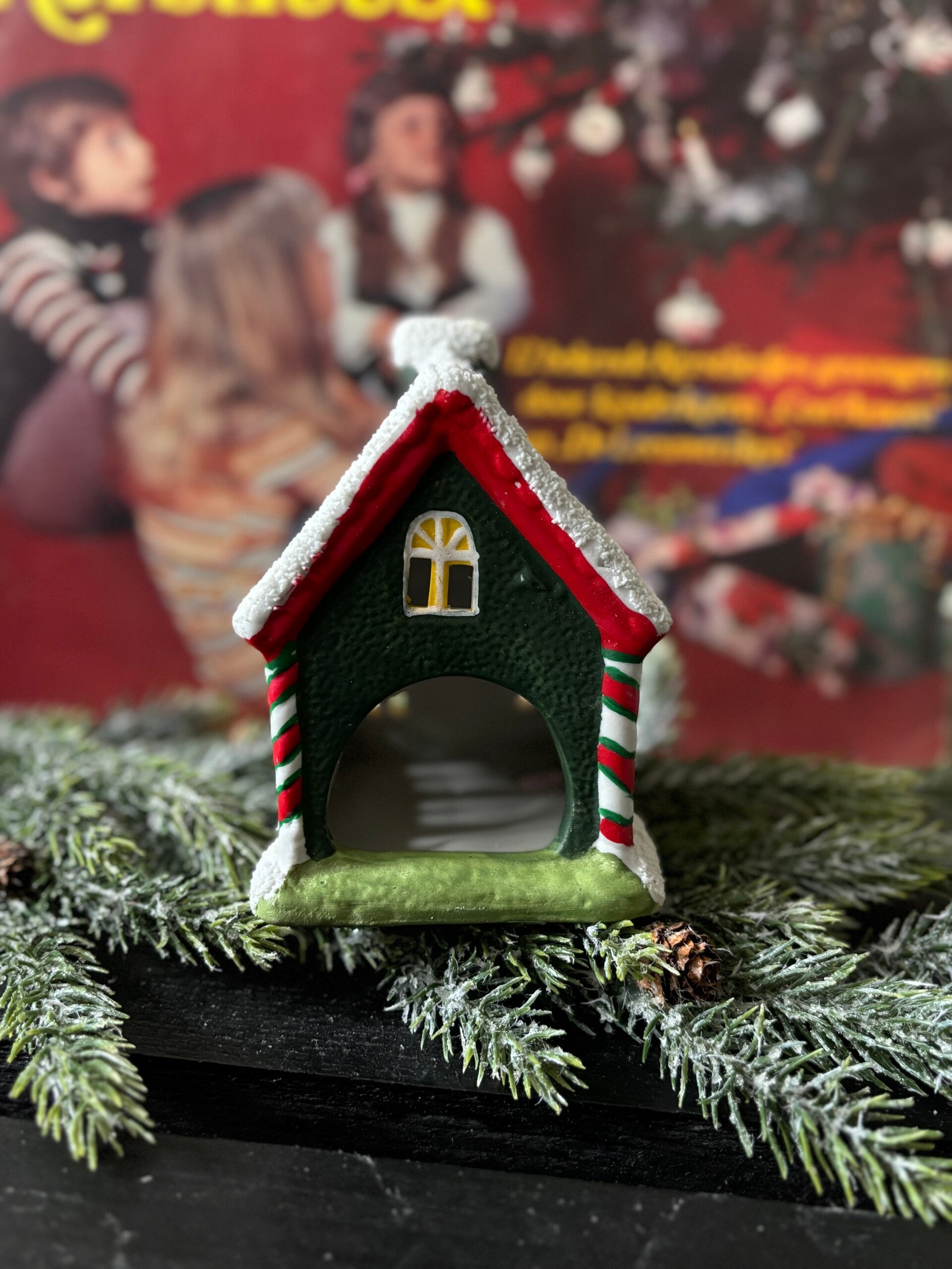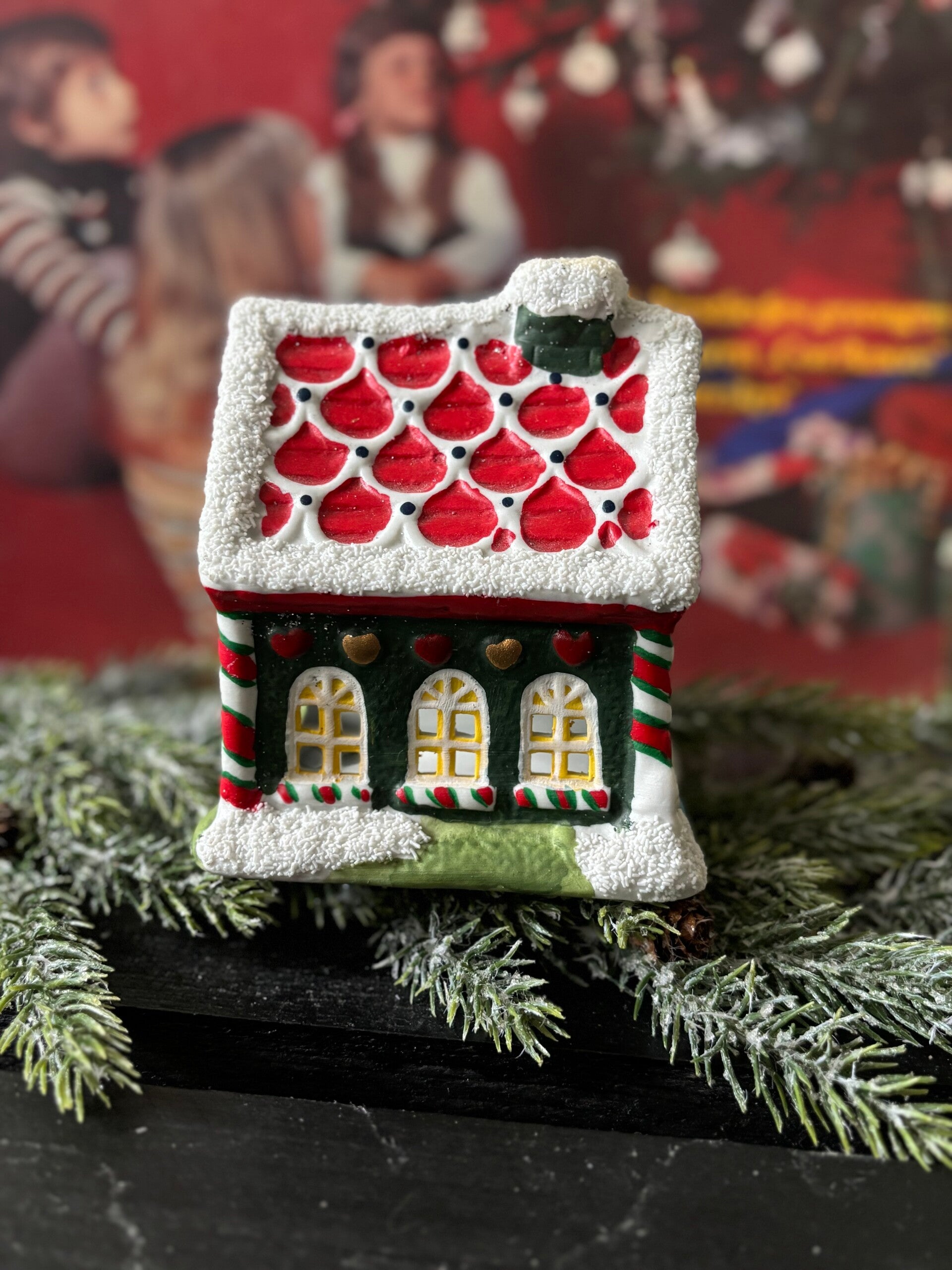 Waxinelicht huisje in frisse kleuren en glitters. Het kaarslicht schijnt mooi door de raampjes.