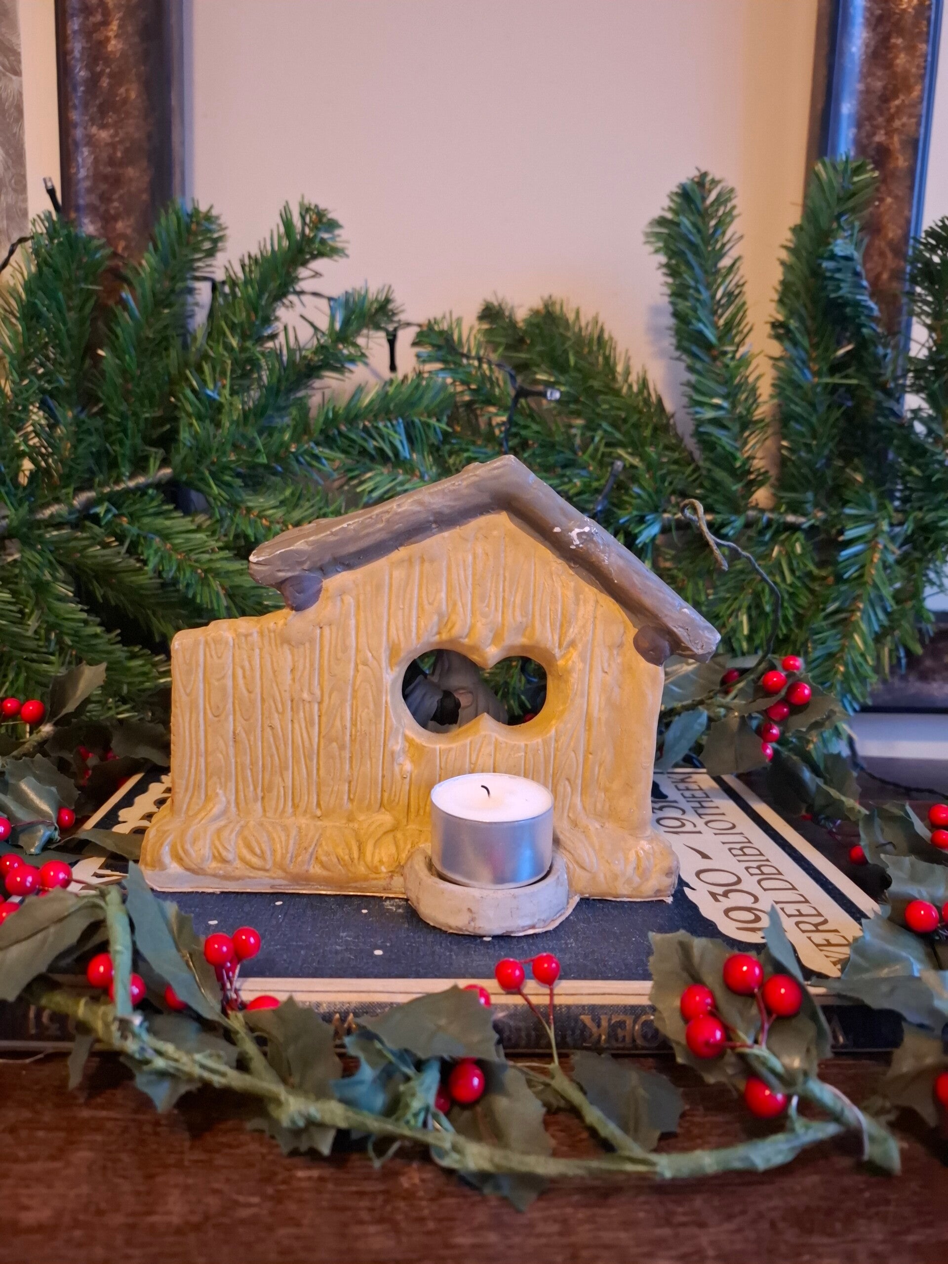 Prachtig stalletje met Maria& Jozef en het kinneke. Gemaakt van Keramiek. Mooie kleuren. Achter plaats je een waxinelicht wat een sfeervol licht geeft.