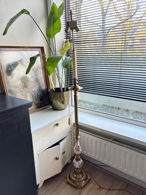 Wat een eyecatcher is deze vintage vloerlamp! Met grote kap met franjes. De voet is goudkleurig met bloemenprint op porselein. Een uniek pareltje! Vanwege de afmeting enkel op te halen.