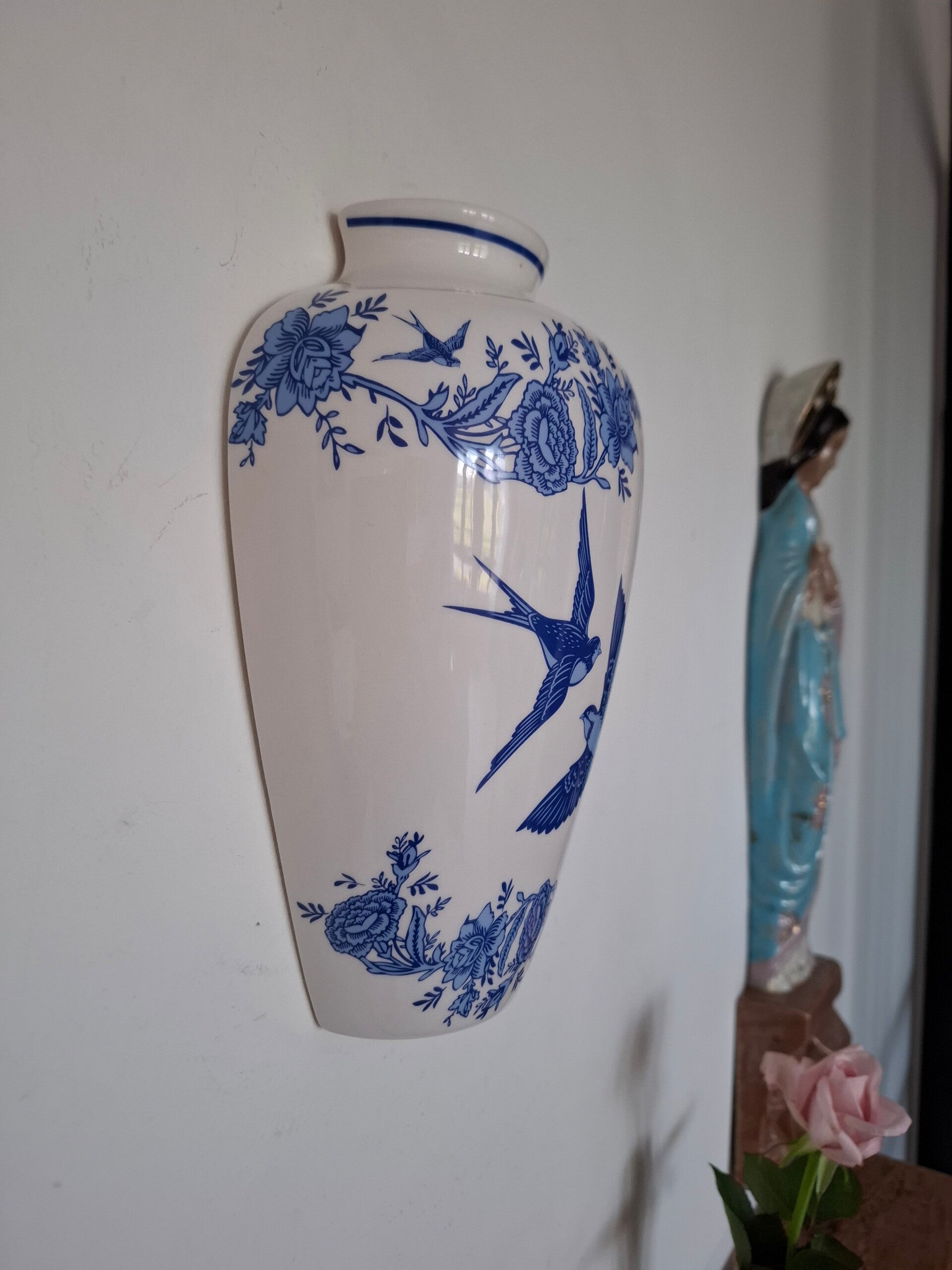 Wat een parel is deze prachtige muurvaas met een prachtige decoratie van 2 zwaluwen en floral. Wist je dat zwaluwen altijd terugkeren naar hun nest. Prachtig item en een one of a kind. De vaas is waterdicht en aan een haakje op te hangen.
