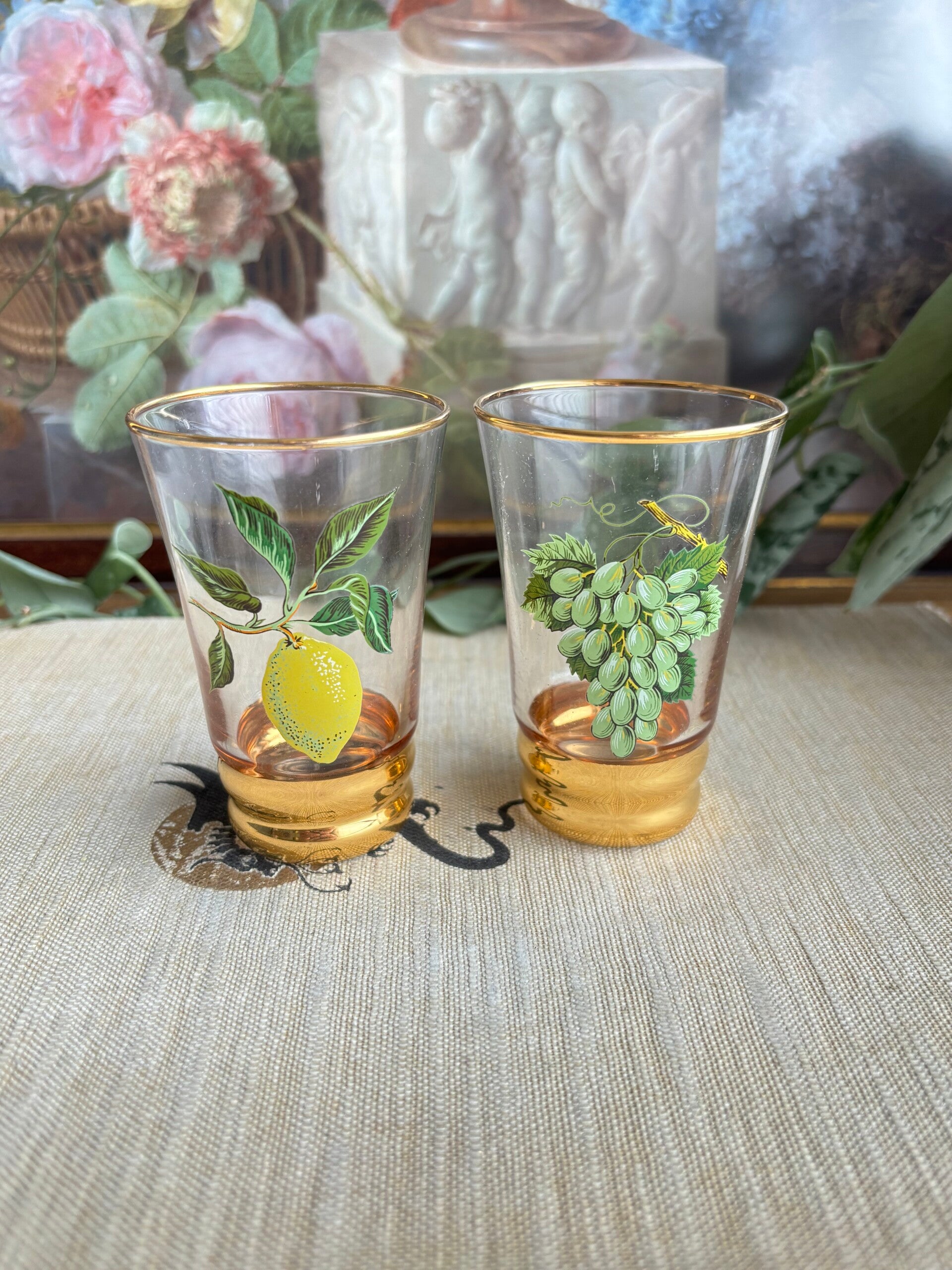 Retro likeurglaasjes van dun glas. De glaasjes zijn versierd met fruit en afgewerkt met goudkleurige randen. Prachtige set van 6!