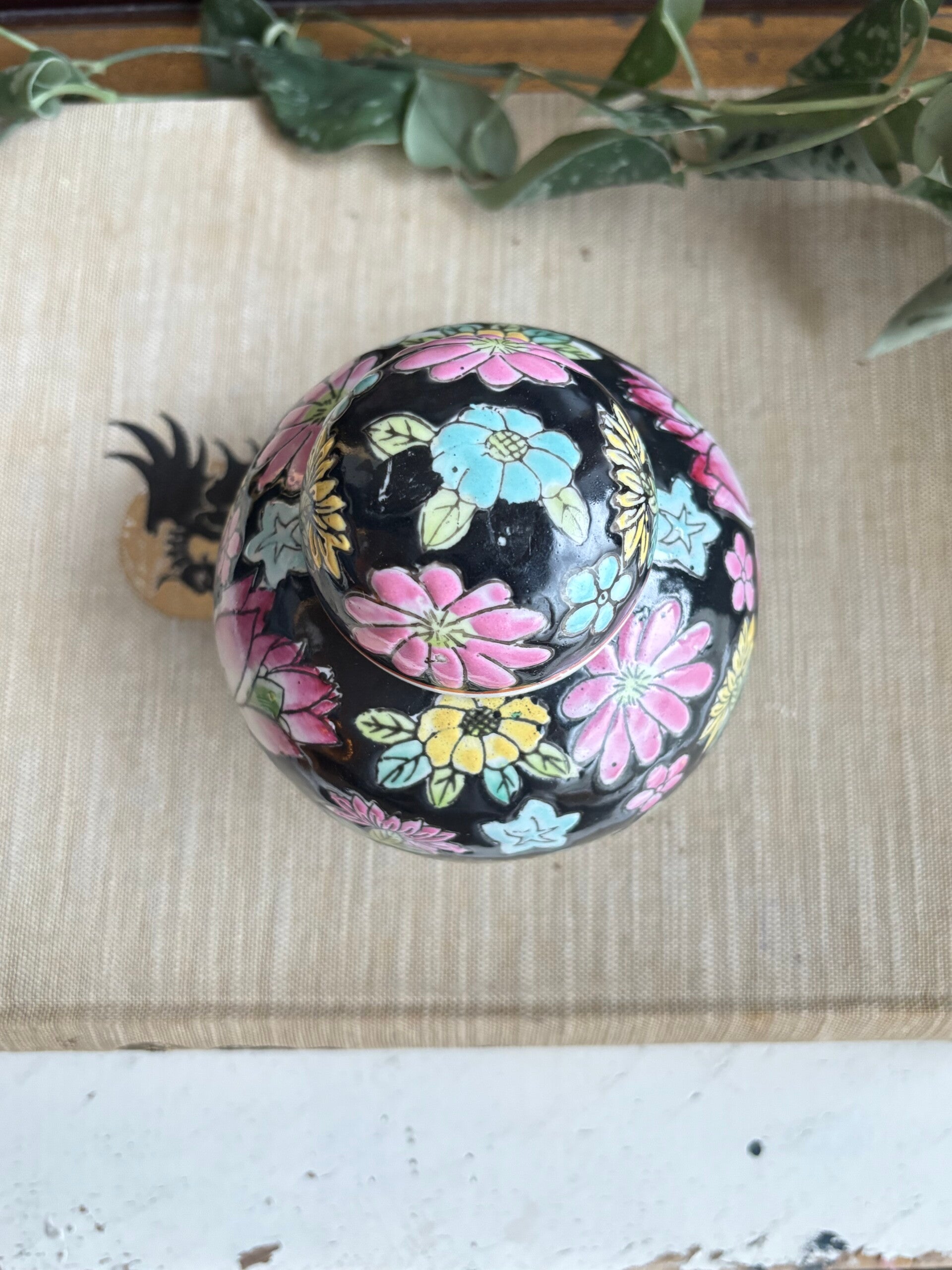 Leuk gemberpotje met gekleurde bloemen op de zwarte ondergrond. Er zijn verschillende bloemen op het potje te vinden. Ook heel goed als vaasje te gebruiken!
