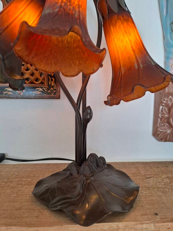 Wat een beauty is deze Art nouveau lelie lamp. Voorzien van 3 prachtige glazen lelie kapjes. Het licht geeft een sfeervol geheel door de kapjes. De voet is van metaal in de vorm van lelie bladeren.