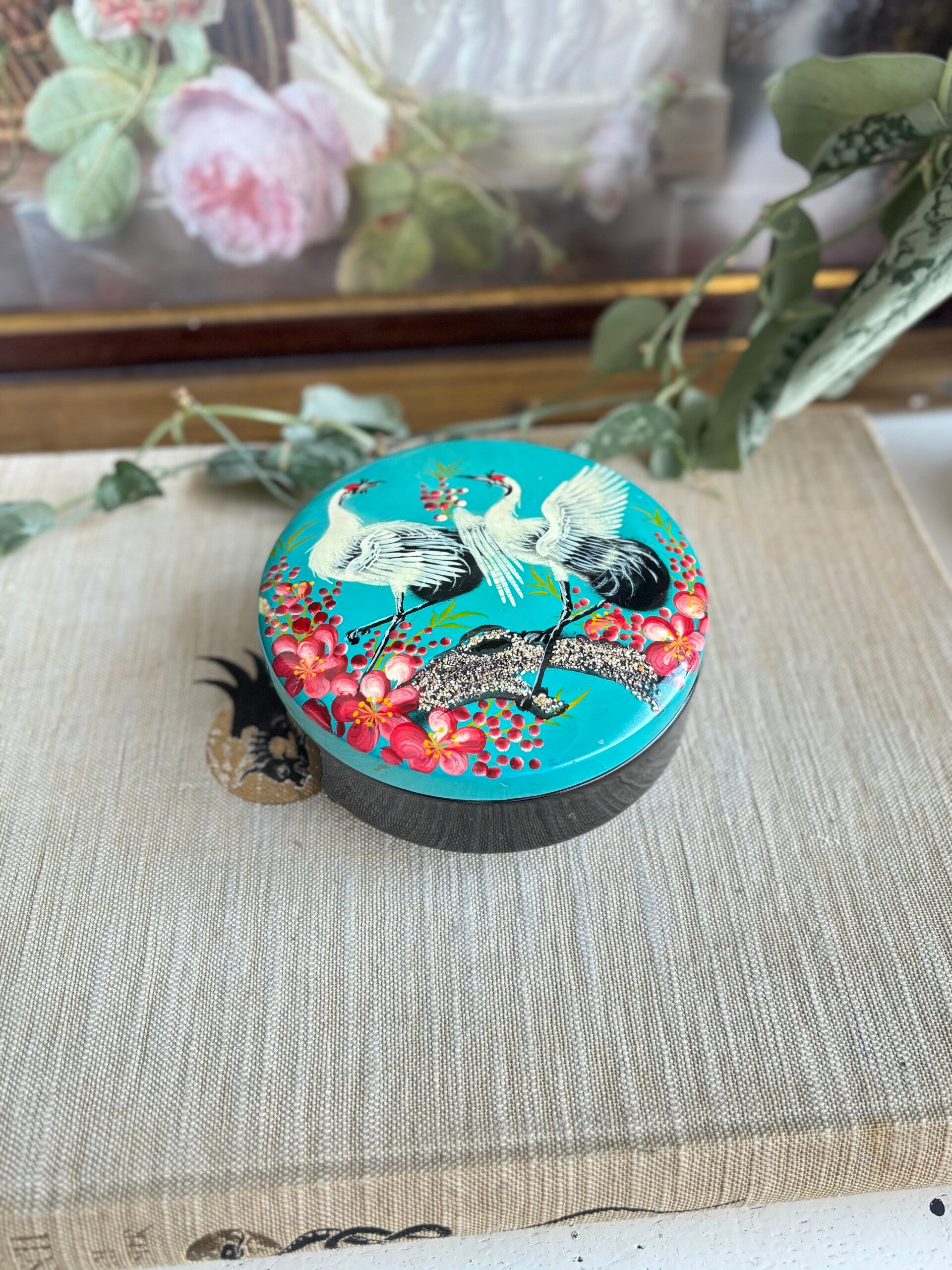Mooi bewaarbakje voor bijvoorbeeld sieraden. Met op de deksel een prachtige afbeelding van kraanvogels en bloemen. De turqoise achtergrond maakt het geheel af!