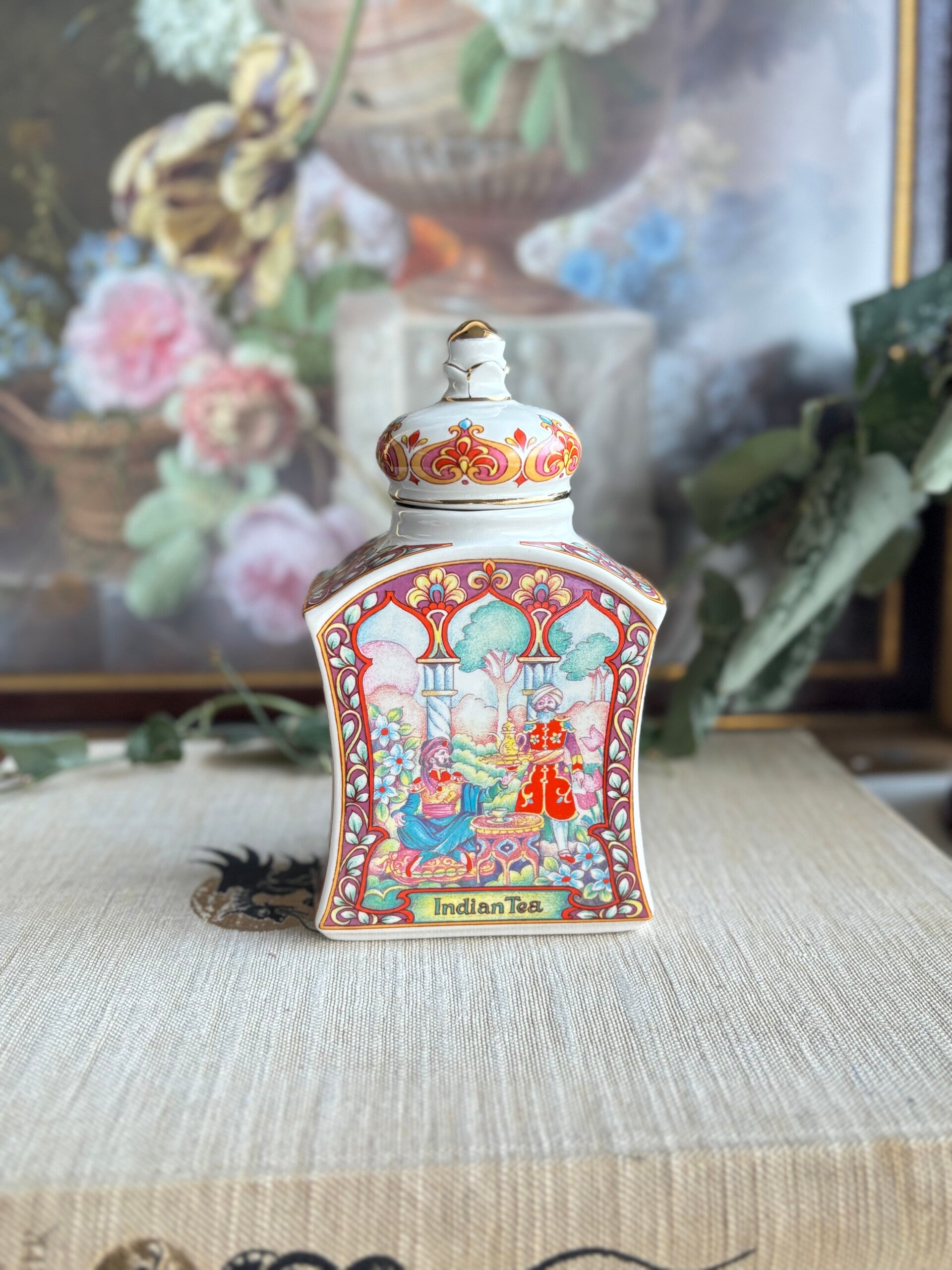 Een echt collecter's item is deze theebus van de Sadler The World of Tea collection. Gemaakt voor Douwe Egberts. Deze porseleinen bus is speciaal voor Indian Tea.