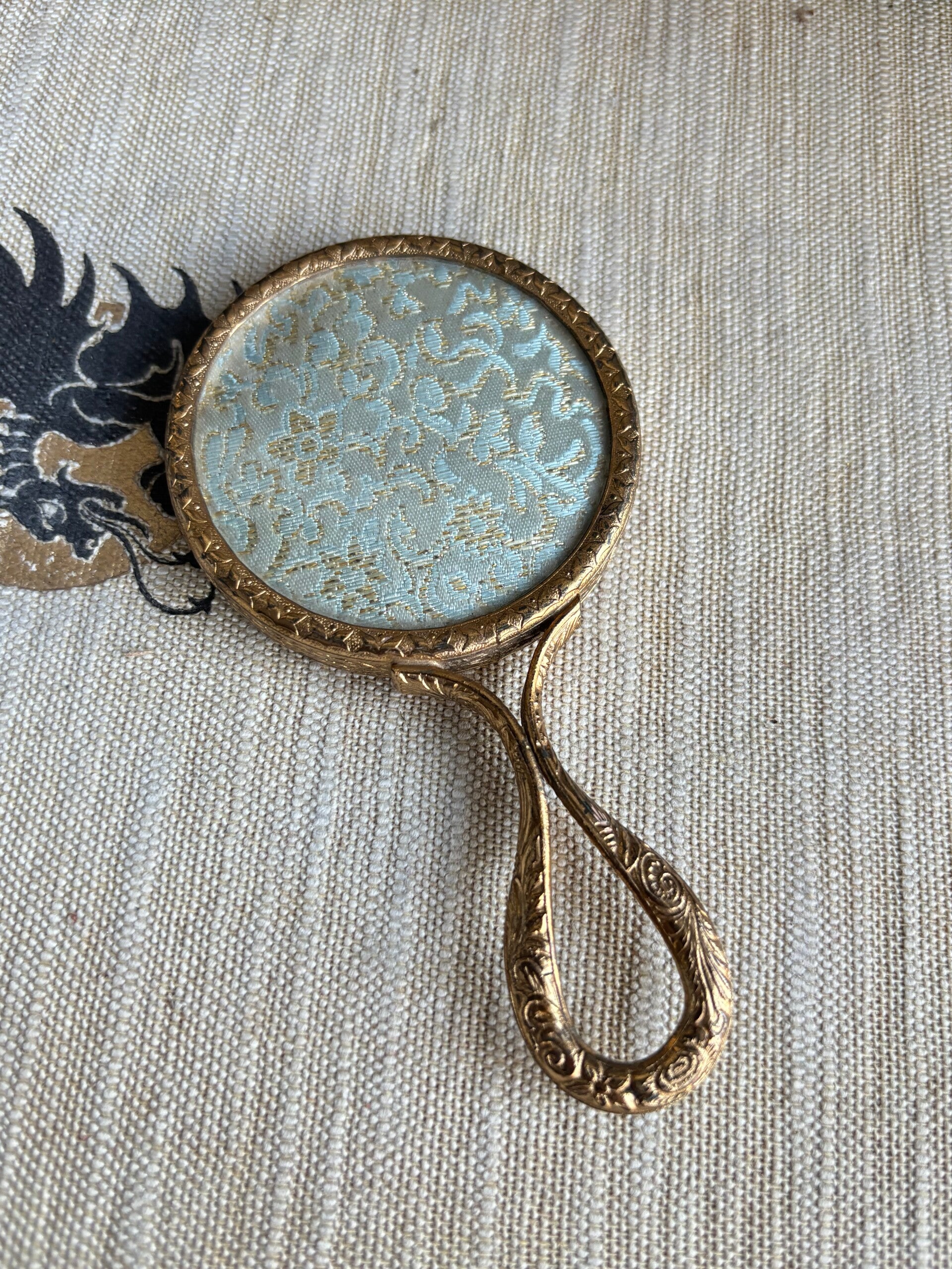 Hoe leuk is dit kleine handspiegeltje?! Ideaal voor in je tas. Met mooie bewerkingen in de omlijsting en aan de achterkant een barok achtige stof.