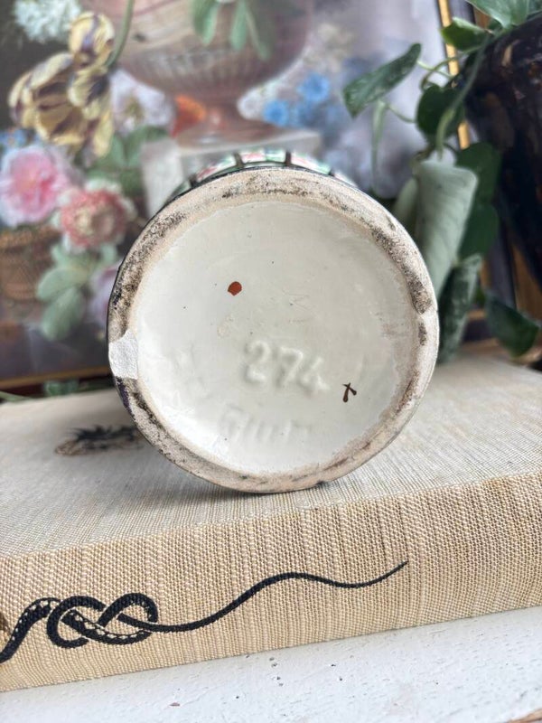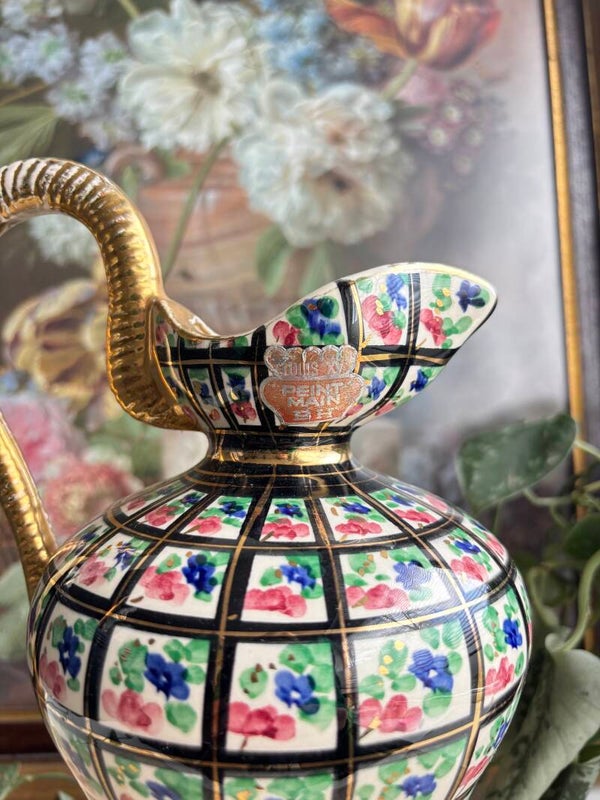 Mooie kan van H. Bequet uit België. Het goud is aan de hendel en hals wat sleets, maar dat gebeurd nou eenmaal bij een vaas uit de jaren '80. Handbeschilderd met bloemen. Uiteraard te gebruiken als kan, maar ook met of zonder bloem een leuk pareltje.