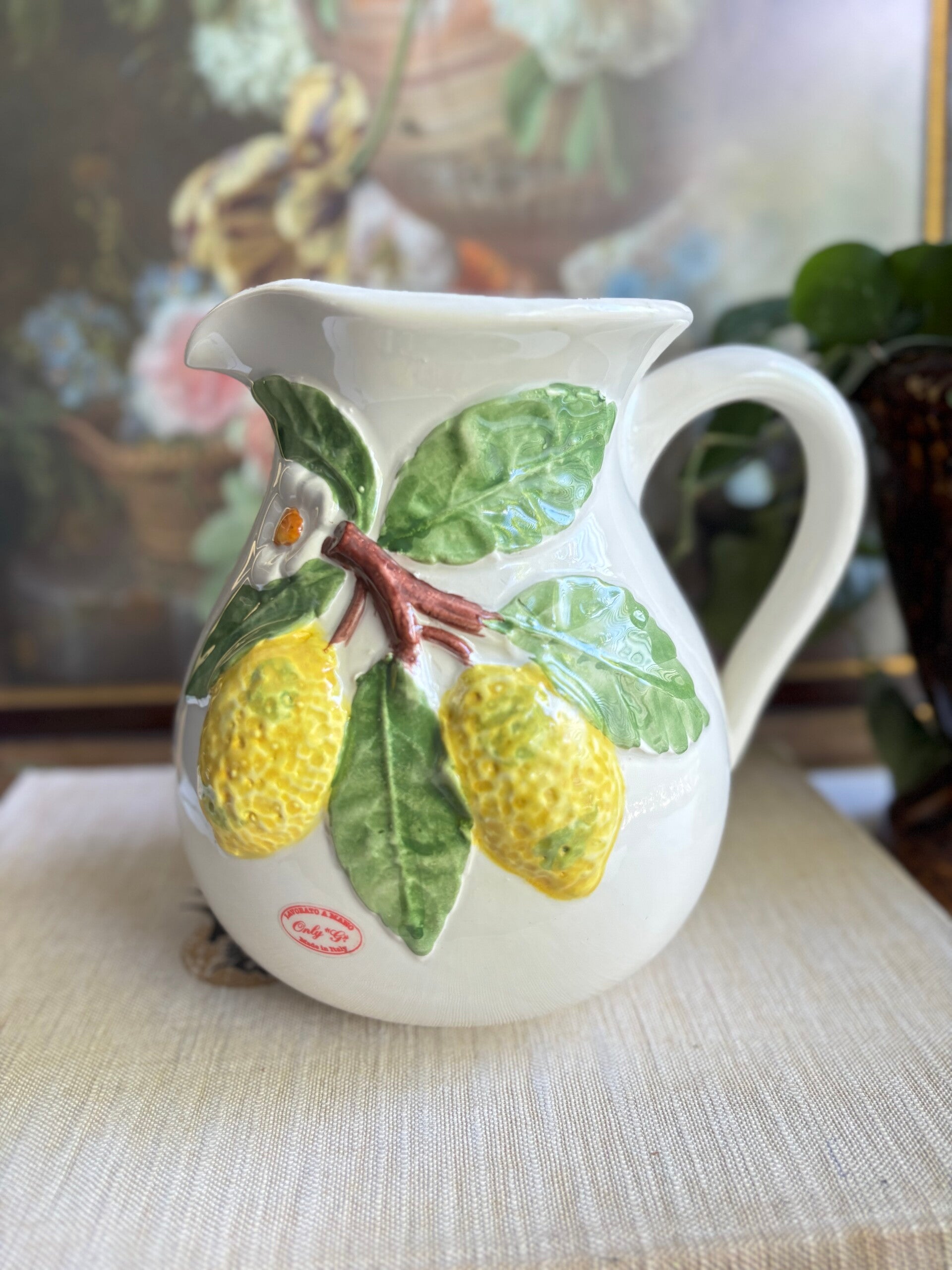 Mooie citroen kan, gemaakt van Italiaans aardewerk. Met de citroenen in barbotine stijl in de kan verwerkt. Niet alleen mooi op een zomerse tafel, maar ook leuk te stylen in de keuken met keukengerei.