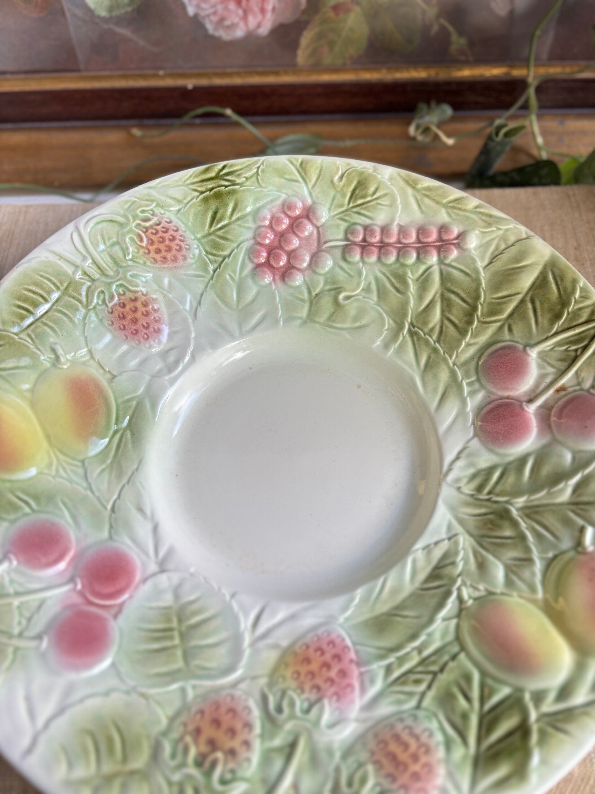 Leuke vintage fruittest van het Franse Salin les Bains, in barbotine stijl. Ideaal voor de aardbeien want het seizoen is begonnen. De schaal bevat haarscheurtjes, het is tenslotte ook een oudje!