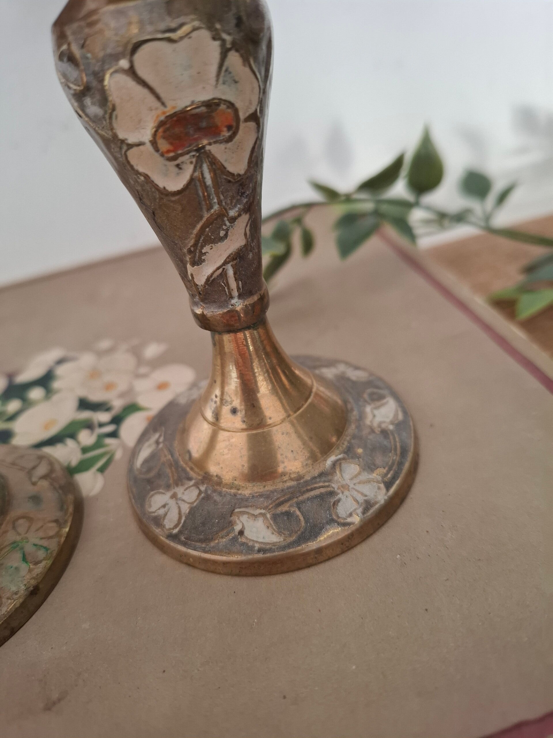 Prachtige vintage kandelaars ingelegd met emaille flowers. Met de donkere dagen in het vooruitzicht geven deze kandelaars sfeer in huis.