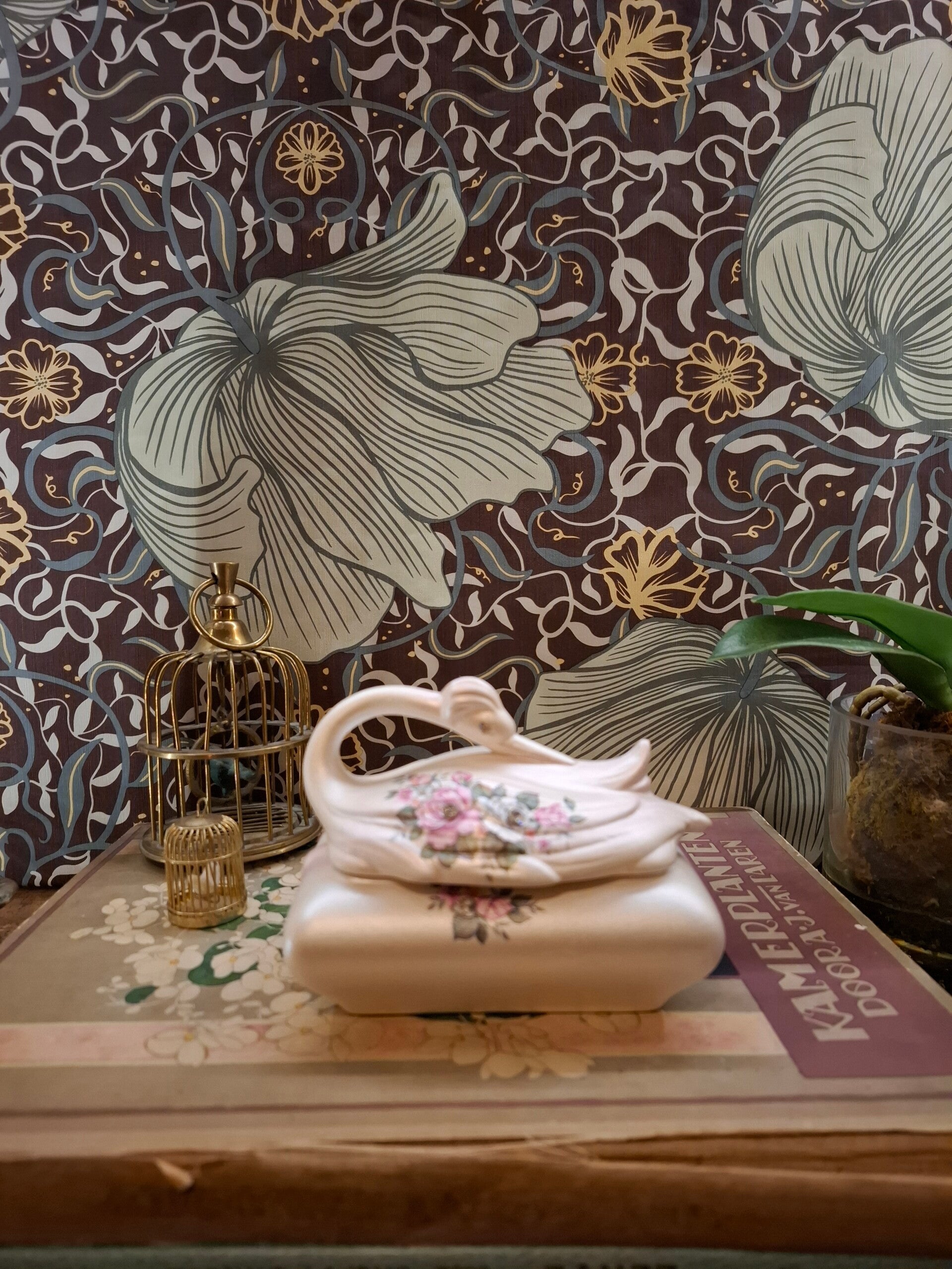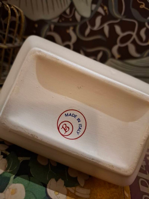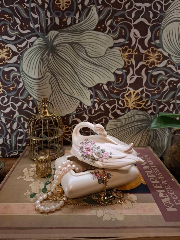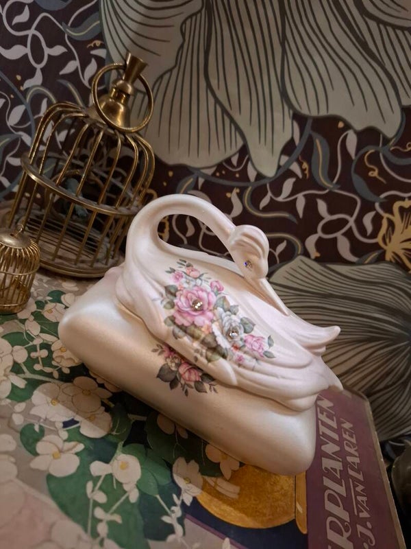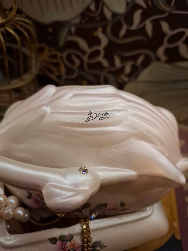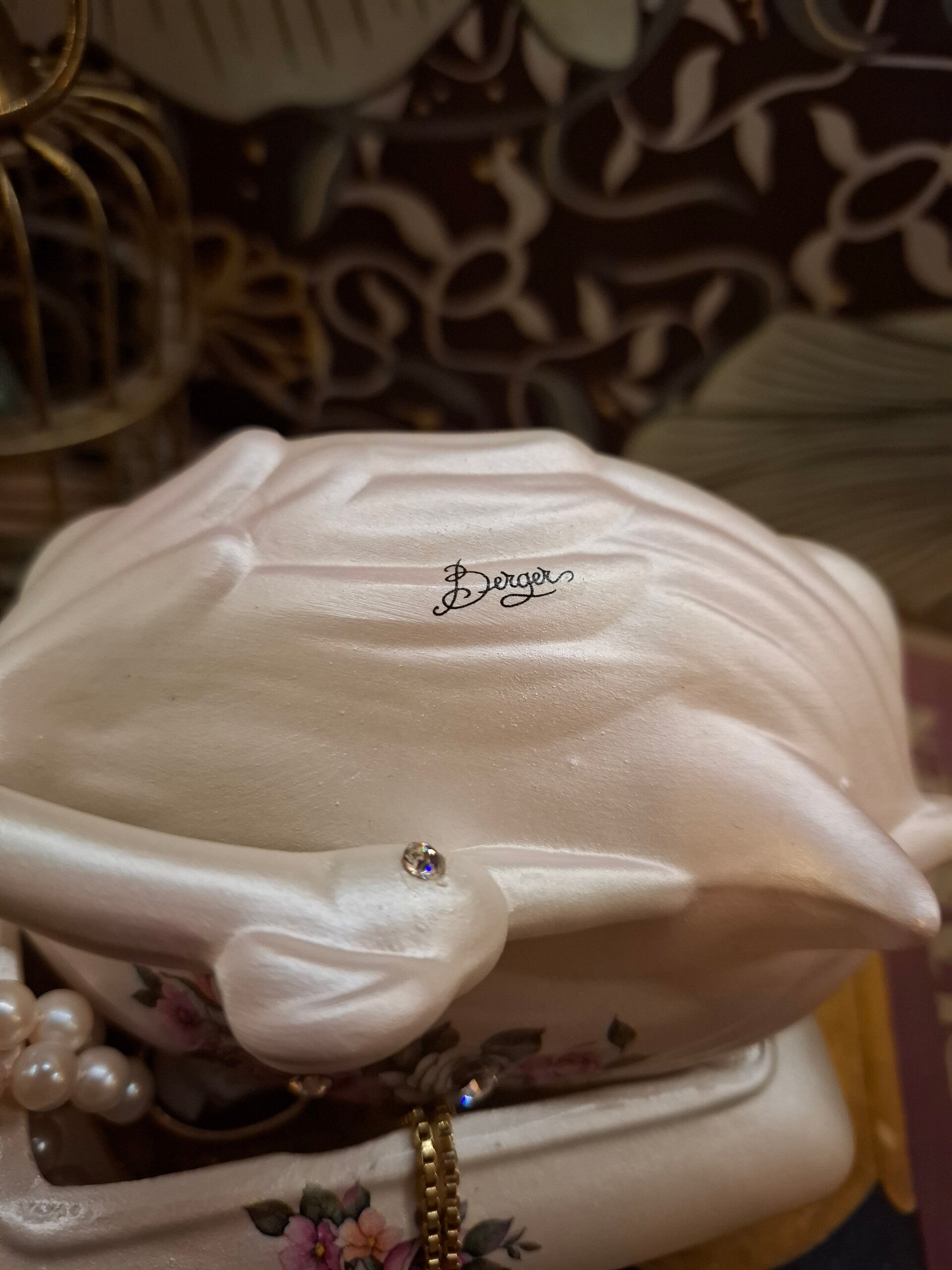Berger vintage Italiaans sieradendoosje in de vorm van een prachtige zwaan. Gemaakt van porselein in een crème kleur met een parelmoer afwerking. Op het deksel heeft elke bloem in het midden een steen die lijkt op een diamant. Ook haar oog is gedecoreerd met een "diamantje". Gesigneerd aan de onderzijde en bovenop de zwaan.