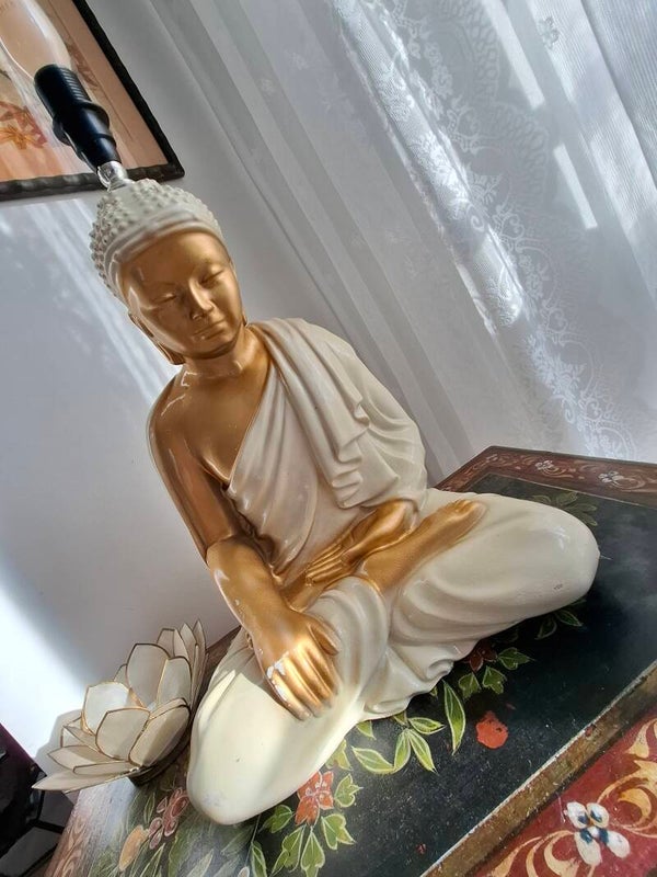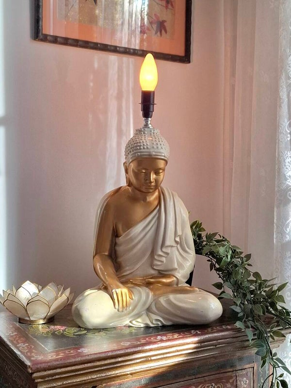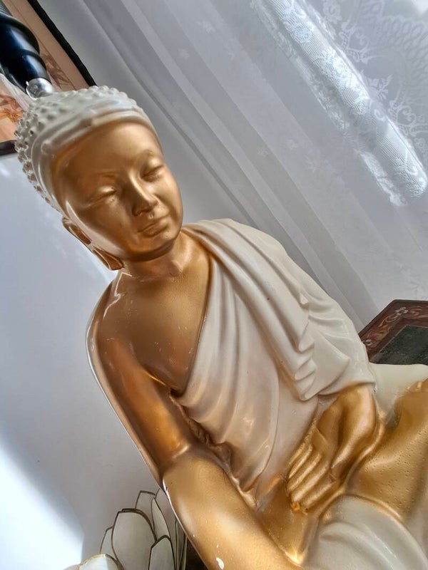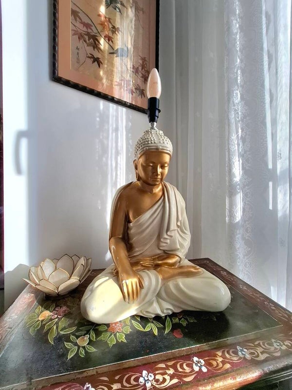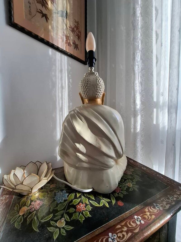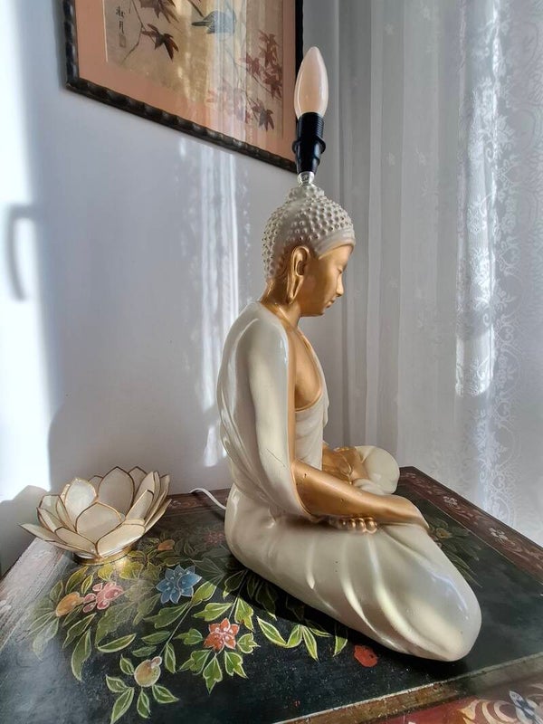Ook hier werden wij weer heel blij van. Wat een sfeermaker is deze prachtige Budha lamp. Gemaakt in de jaren 70. De combinatie van het prachtige creme kleurige gewaad met het gouden lijf maakt de Budha helemaal af. Je wordt er gewoon zen van. In een goede vintage conditie met lichte gebruikerssporen.