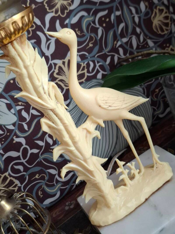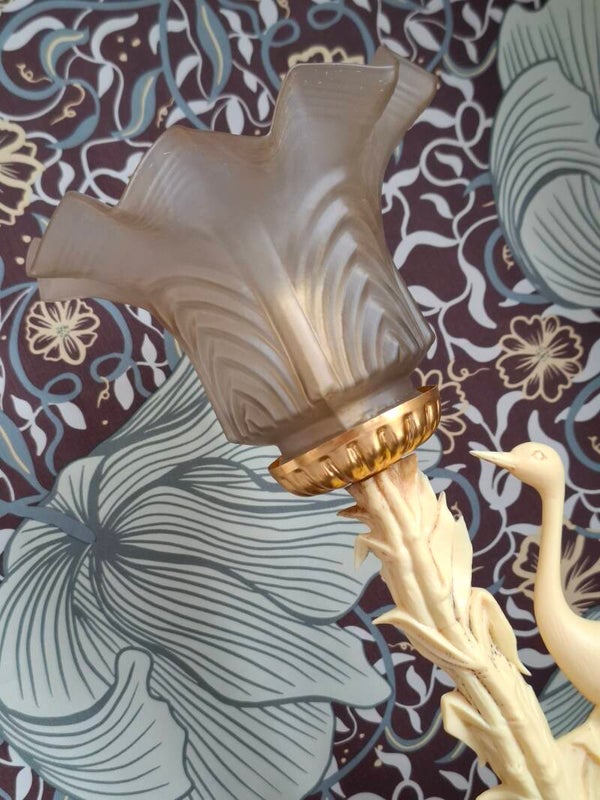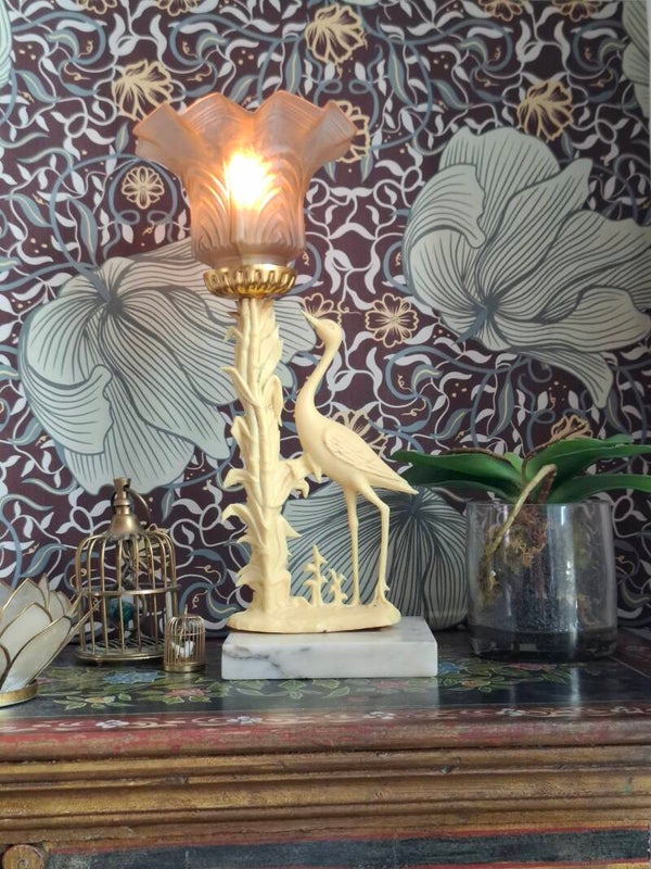 Lampen alarm .....oooh wat is ze mooi. Kijk haar sierlijk staan. Prachtige reigerlamp gemaakt van Ivorine op een marmeren voet. De antieke glazen kap maakt haar helemaal af. Gemaakt rond de jaren 60. En goed bewaard gebleven. Ook deze nog nooit eerder gezien. Een eyecatcher voor in huis. Naar wie mag ze toe vliegen?