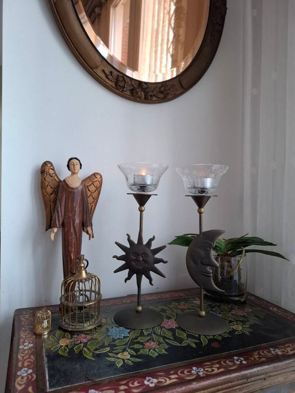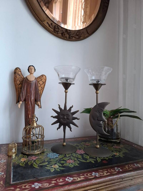 Deze 2 mooie zon&maan kandelaars hebben een dubbele functie. Je kunt ze met kaarssen branden maar ook met waxine lichten. Het bijpassende craquelé glas is inclusief. En glas is helemaal hot op het moment.