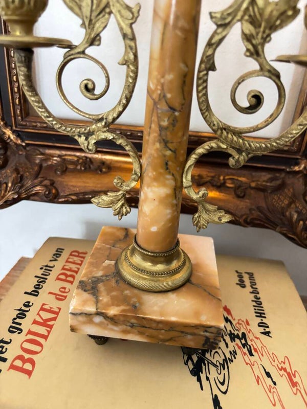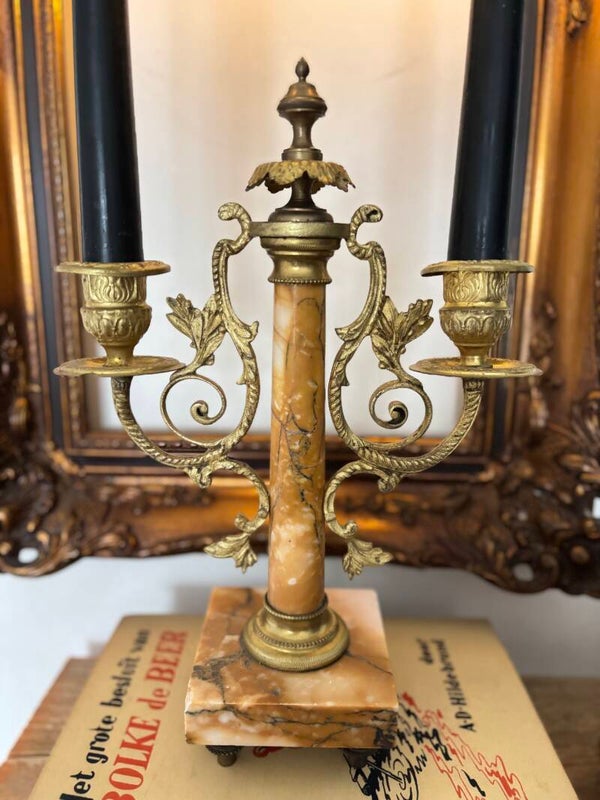 Franse antieke kandelaar in Victoriaanse stijl. De marmeren voet staat prachtig met de goudkleurige verguld bronzen armen. ♛ 29 cm hoog x 18 cm breed