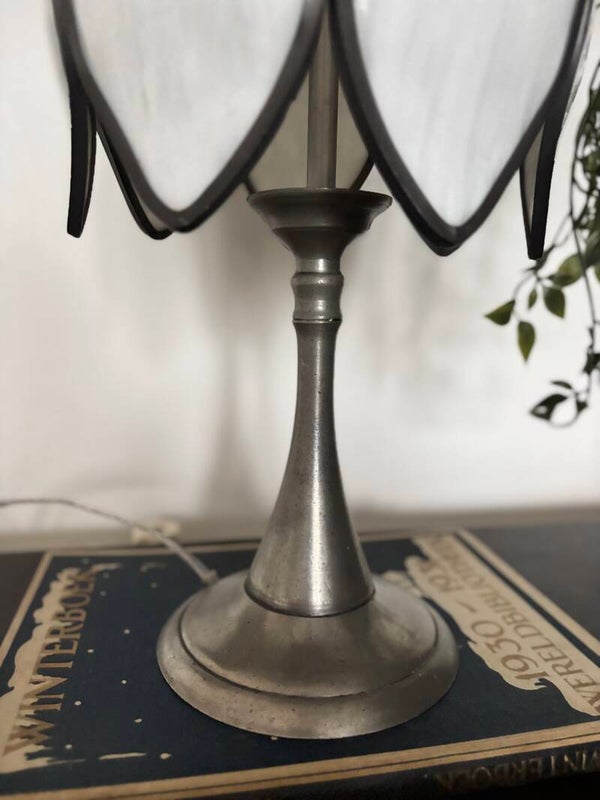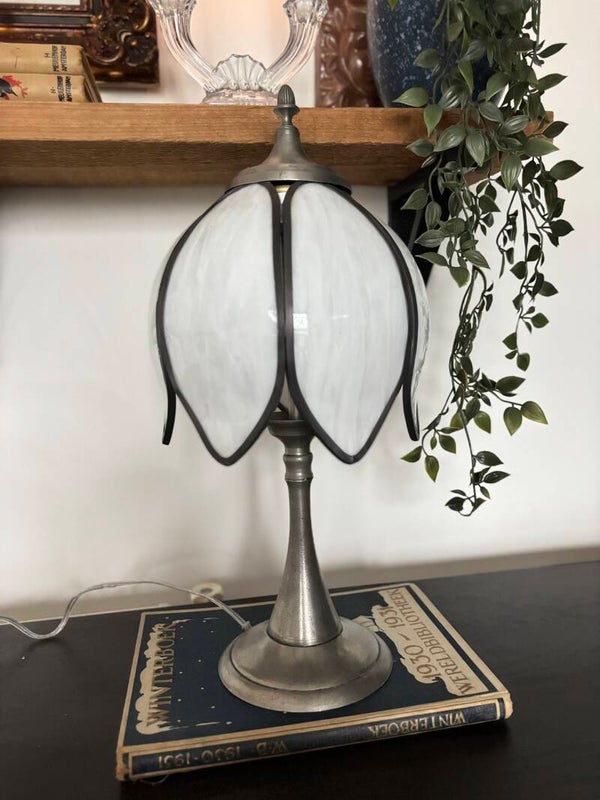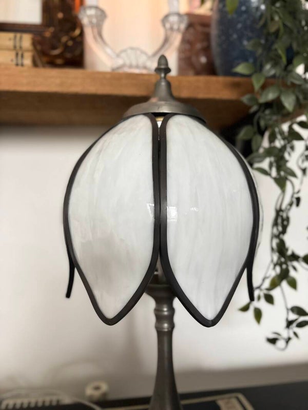Prachtige tulplamp in Tiffany stijl. Handgemaakt van tin en glas. Aan de binnenkant 2 fittingen waar de lampen in kunnen. Het licht schijnt prachtig!